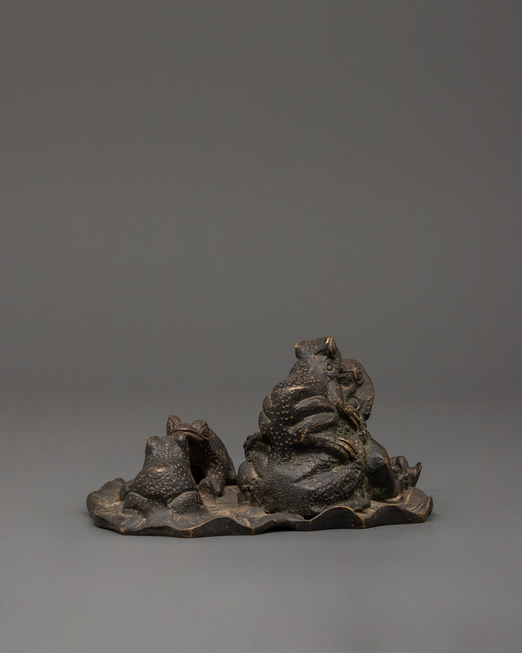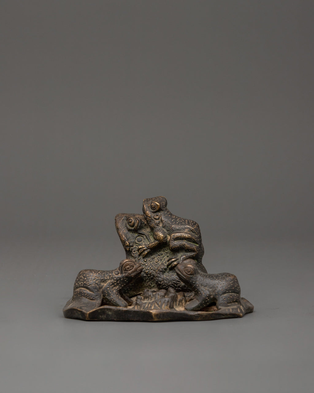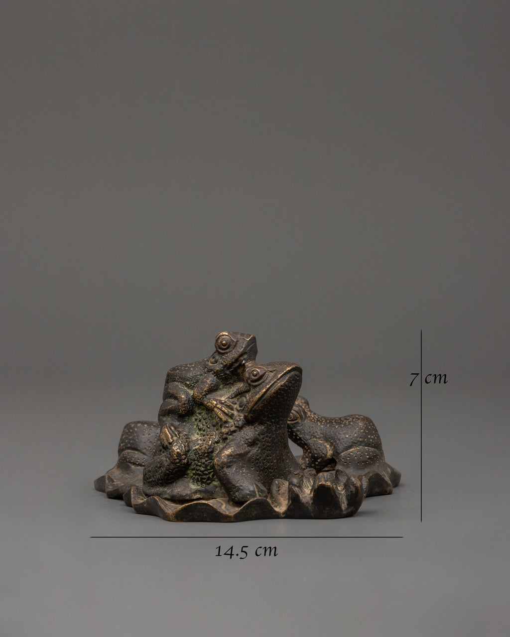 This Frog sculpture is constructed of pure brass metal and is 7cm in height and 14.5cm in width, weighing 1.06 kilograms. The frog, a symbol of good fortune, fertility, and transformation, is uniquely positioned in Feng Shui customs and creative design.