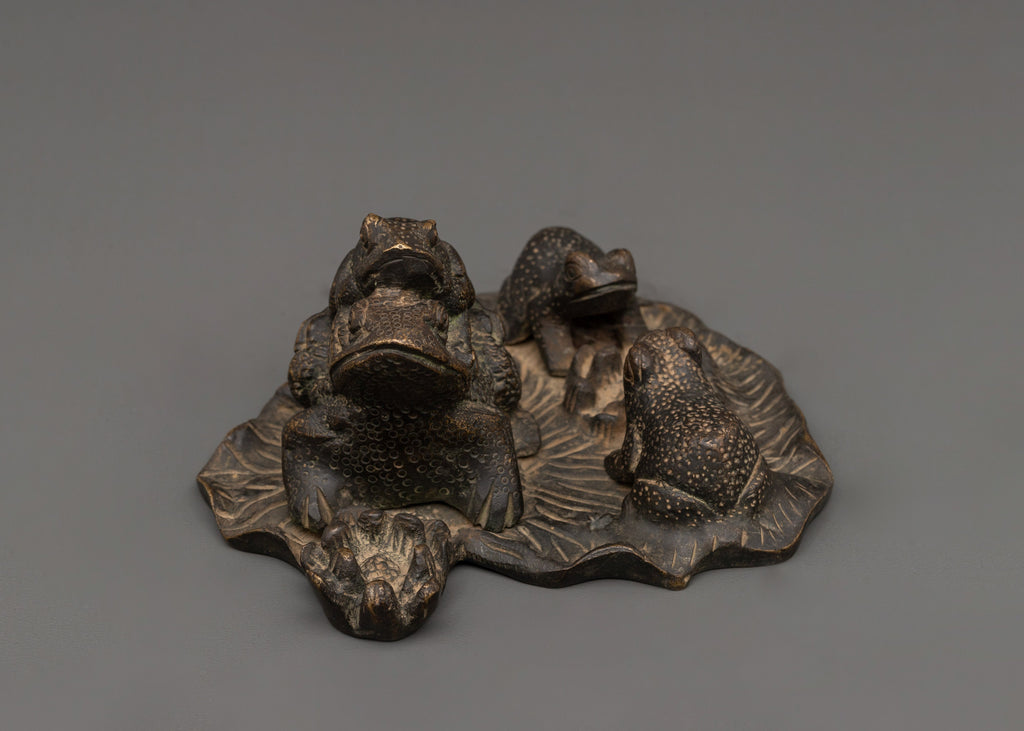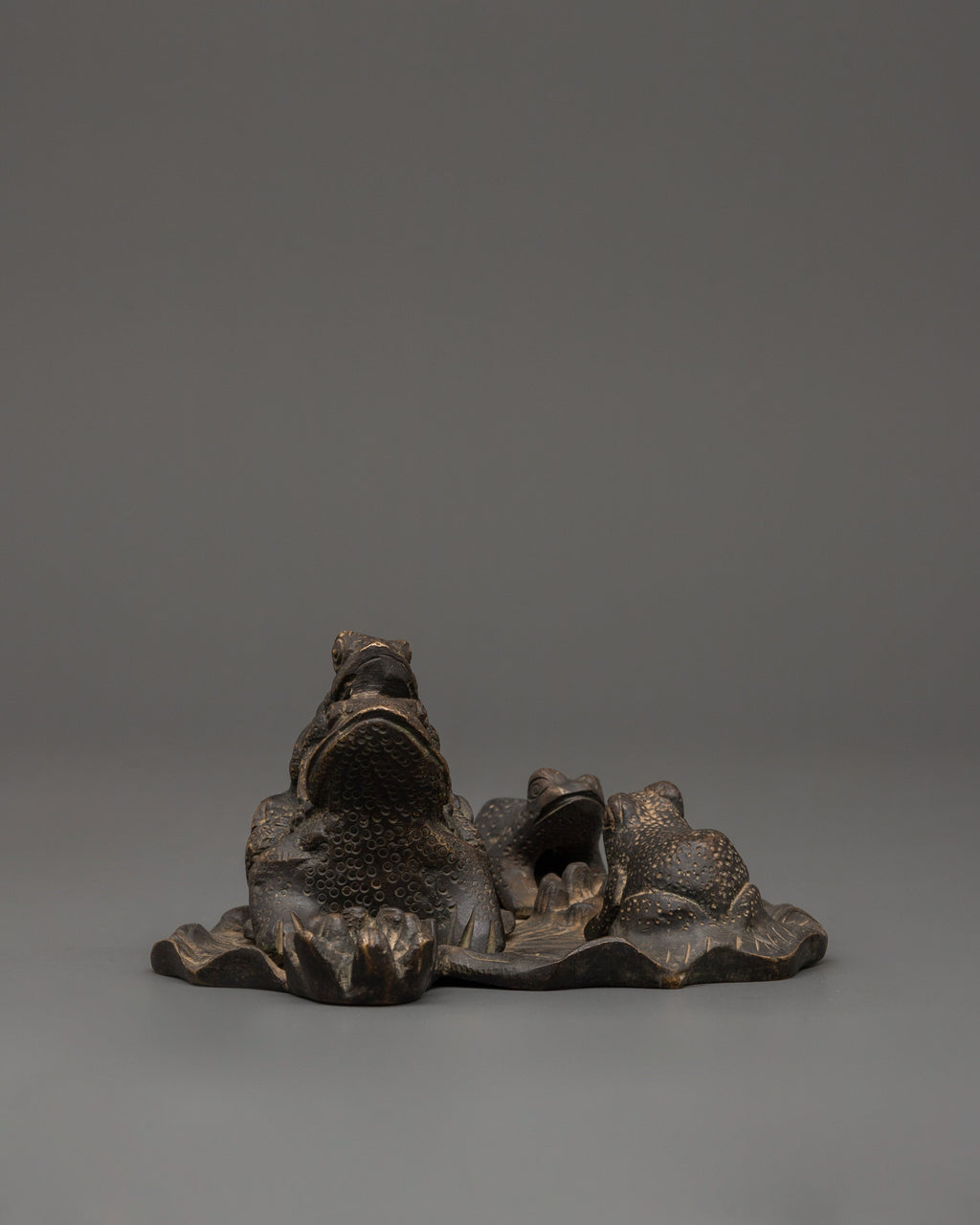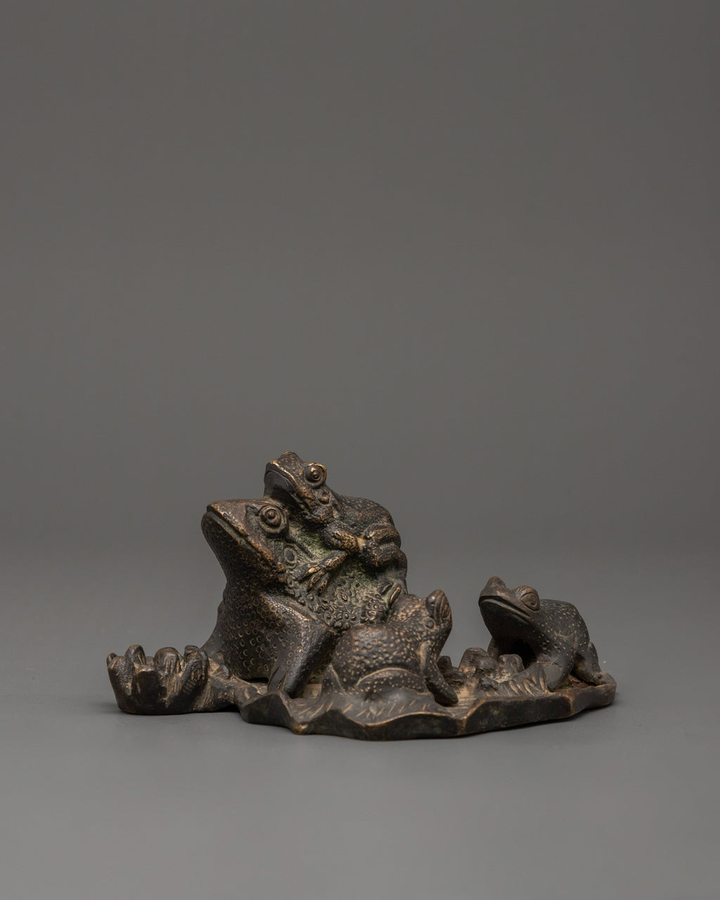 This Frog sculpture is constructed of pure brass metal and is 7cm in height and 14.5cm in width, weighing 1.06 kilograms. The frog, a symbol of good fortune, fertility, and transformation, is uniquely positioned in Feng Shui customs and creative design.