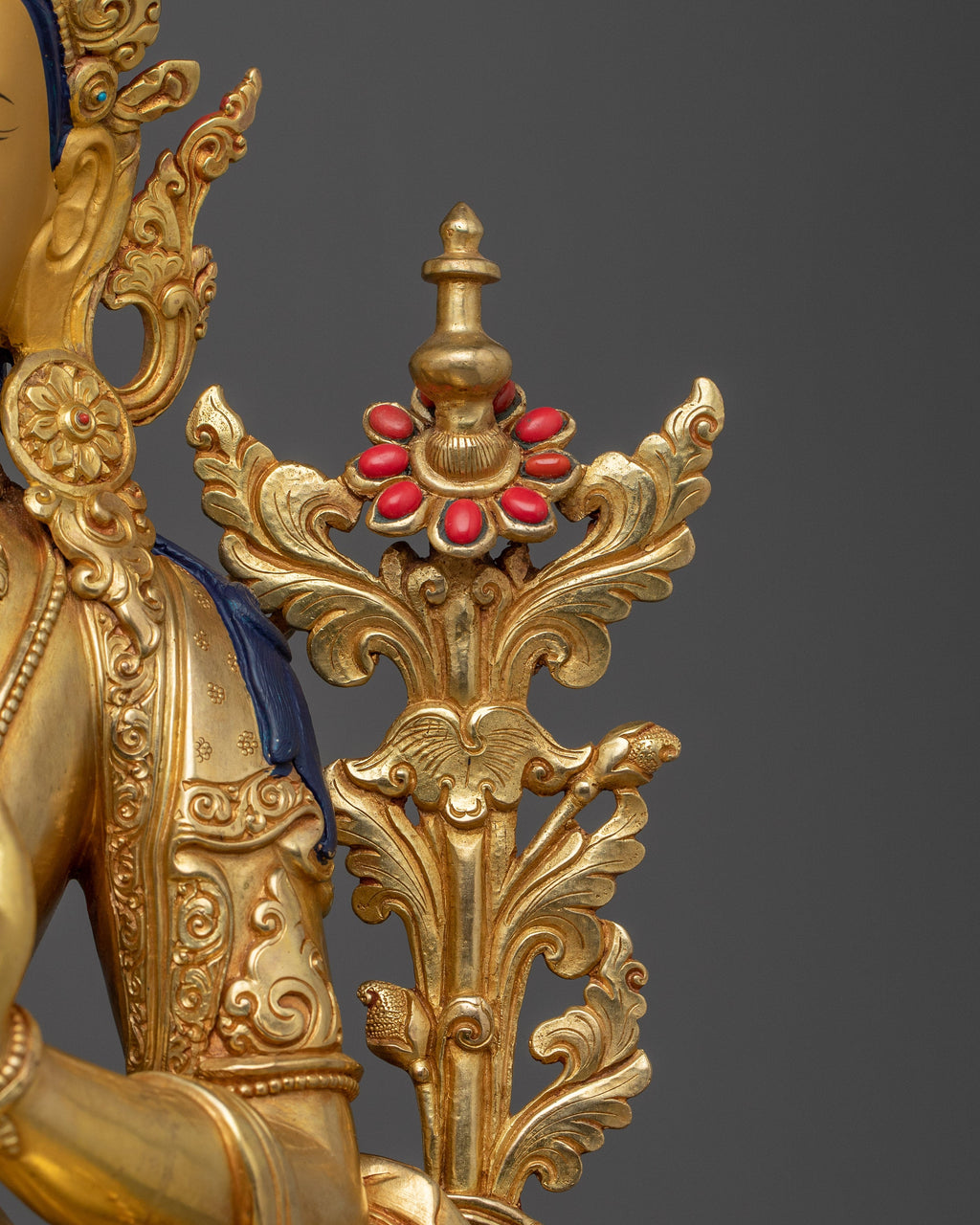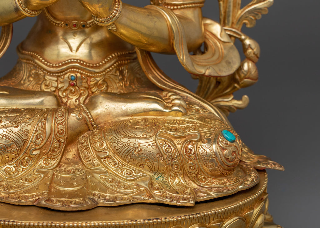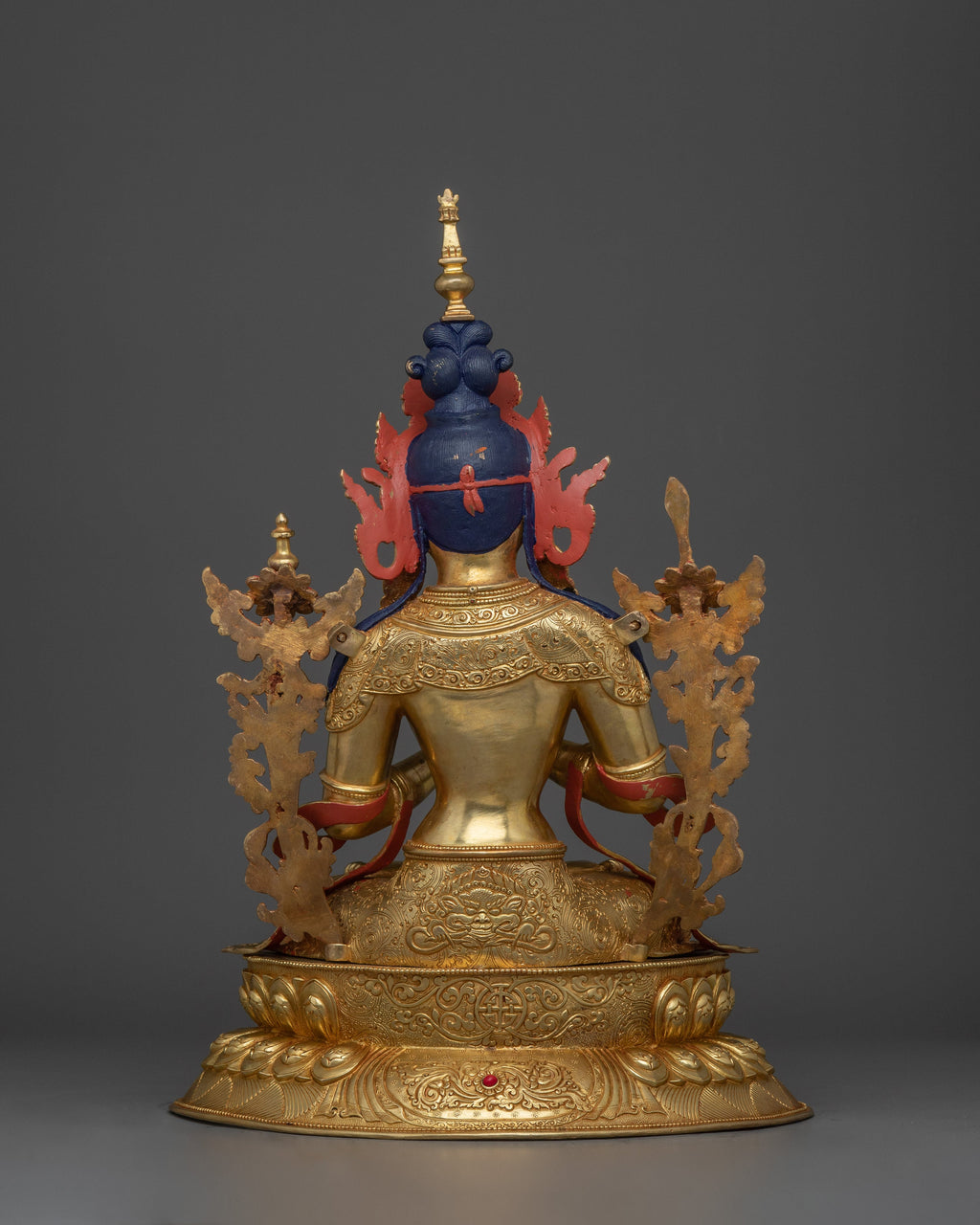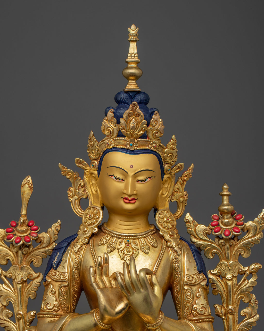 Maitreya Buddha, also known as the Future Buddha, symbolizes hope, spiritual progress, and the coming age of enlightenment. As the Buddha prophesied to appear in the future to guide sentient beings, he is depicted in a calm, seated posture that radiates peace and compassion. His hands form the Dharmachakra Mudra, representing the turning of the Wheel of Dharma and the continuation of the Buddha’s teachings. In each hand, he holds a lotus flower, symbolizing purity, spiritual growth, and awakened wisdom. Maitreya’s serene facial expression reflects deep meditation and understanding. He is adorned with jeweled ornaments and a sacred necklace, emphasizing his celestial and regal qualities. The five Dhyani crowns on his head represent the five wisdoms of enlightenment, and the stupa crowning his ushnisha symbolizes the realization of the ultimate truth and spiritual attainment. Seated upon a beautifully detailed lotus base, this statue is a radiant embodiment of future enlightenment and compassionate guidance.