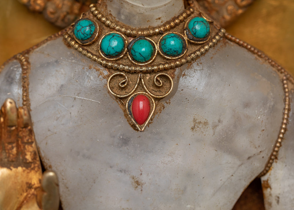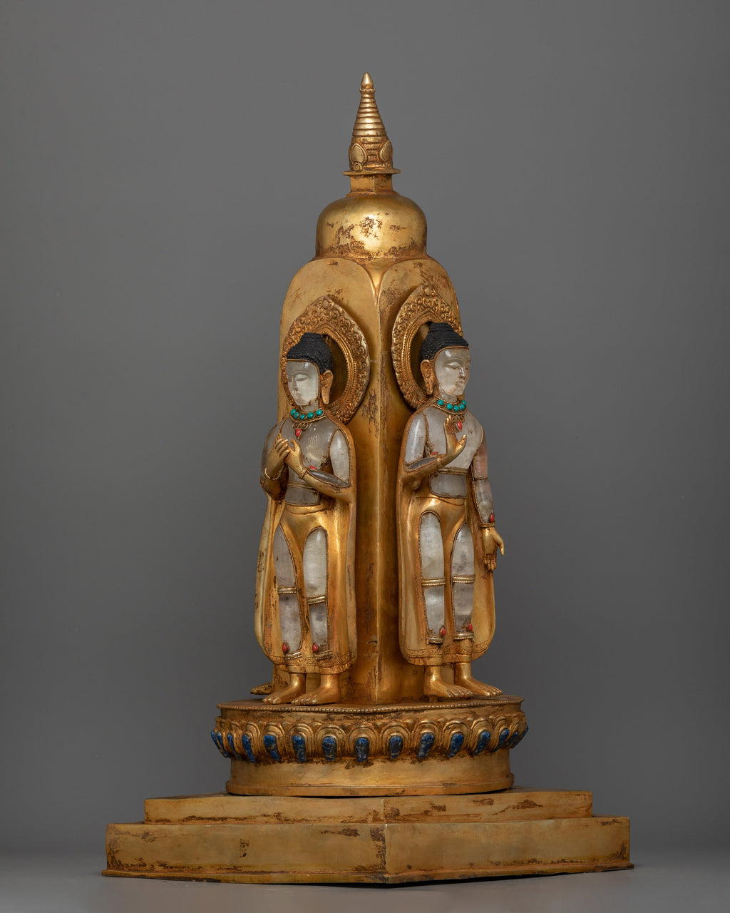 This Future Buddha Stupa, a revered symbol of enlightened ambition and spiritual growth, indicates a profound connection to the teachings of Maitreya, the future Buddha. This handcrafted stupa measures 25.2" (Height) x 12.2" (Base) and weighs 15.96 kg. It is made of crystal and is adorned with 24K gold gilding and hand-carved gemstones. This sacred artwork, created by expert Nepalese artisans, represents the everlasting craftsmanship and spiritual profundity of Himalayan Buddhism, making it an ideal addition to altars, meditation places, and sacred collections.