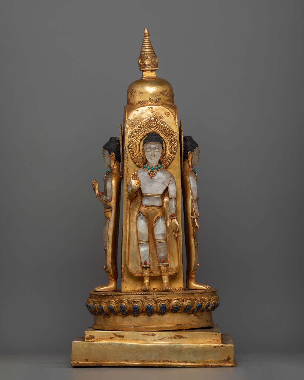 This sculpture features a three-sided stupa-like structure, each side intricately carved with a standing figure of Maitreya Buddha. The right side and central Buddhas are depicted with the right hand raised in Abhaya Mudra, symbolizing fearlessness and protection, and the left hand in Varada Mudra, representing compassion and the granting of blessings. The left side statue shows Maitreya Buddha performing the Dharmachakra Mudra, symbolizing the turning of the Wheel of Dharma and the teaching of the Buddhist law. The figures are adorned with delicate jewels that highlight their spiritual grace. The entire composition stands atop a beautifully detailed lotus base, resting on a tiered pedestal, emphasizing purity and spiritual elevation. The stupa form itself, crowned with a traditional spire, conveys a sense of sacred architecture, symbolizing the universe and the path to enlightenment. The harmony of the three Buddhas facing different directions evokes the omnipresence of Maitreya’s blessings and teachings, making this sculpture a powerful representation of hope, compassion, and the promise of future enlightenment.