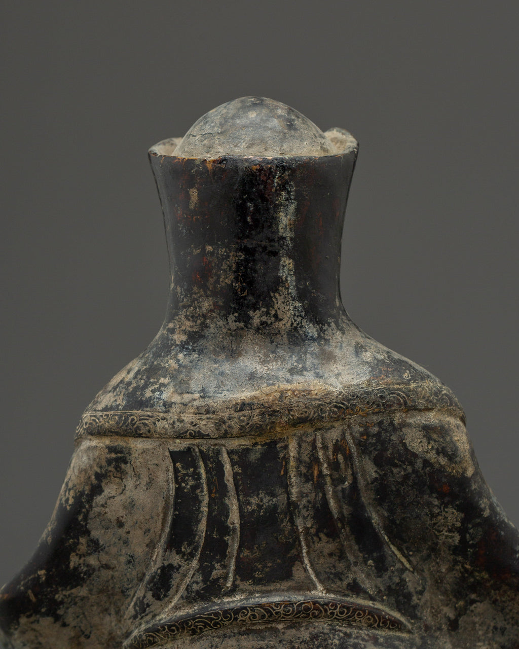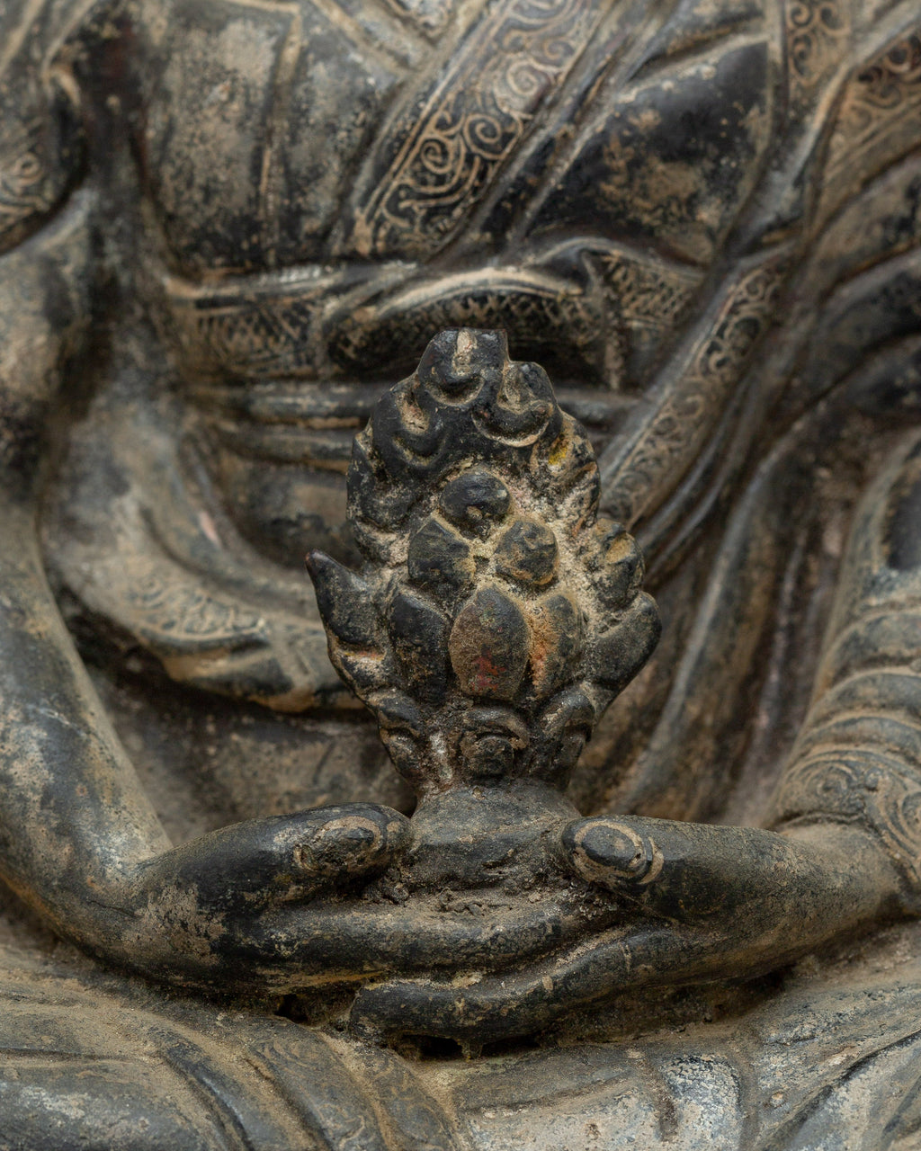 Gampopa received teachings from various masters from many lineages, including Nyingma and Kadampa. He became the foremost disciple of the renowned yogi Milarepa at the age of 30, receiving instruction in Vajravarahi, the tummo, and Mahamudra from him. The master's clothing with traditional Tibetan adornment. Ashtamangala is used to carve the throne (Eight auspicious symbols).