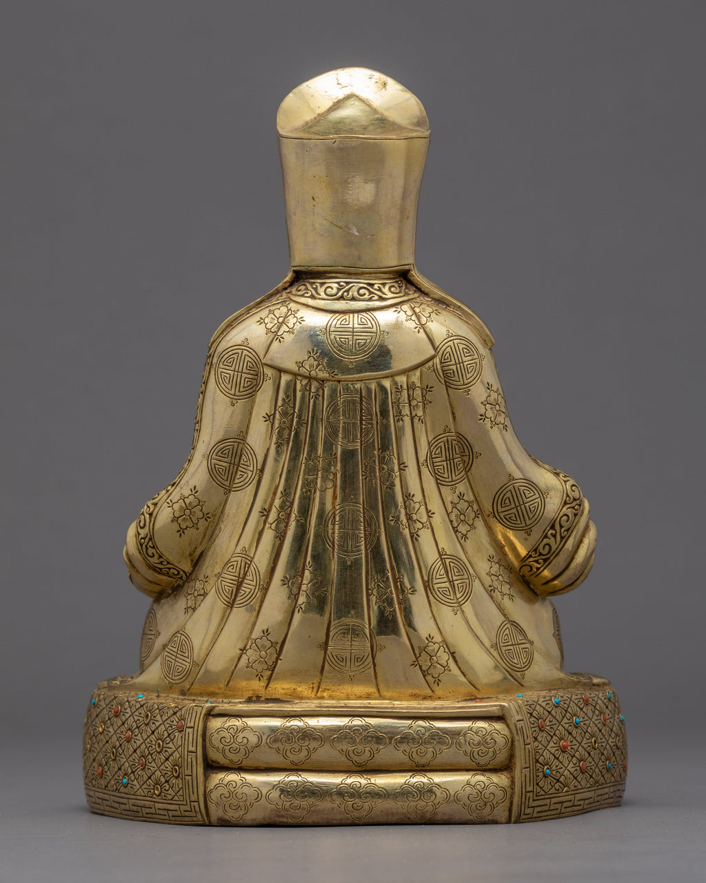 Gampopa received teachings from various masters from many lineages, including Nyingma and Kadampa. He became the foremost disciple of the renowned yogi Milarepa at the age of 30, receiving instruction in Vajravarahi, the tummo, and Mahamudra from him. The master's clothing with traditional Tibetan adornment. Ashtamangala is used to carve the throne (Eight auspicious symbols).