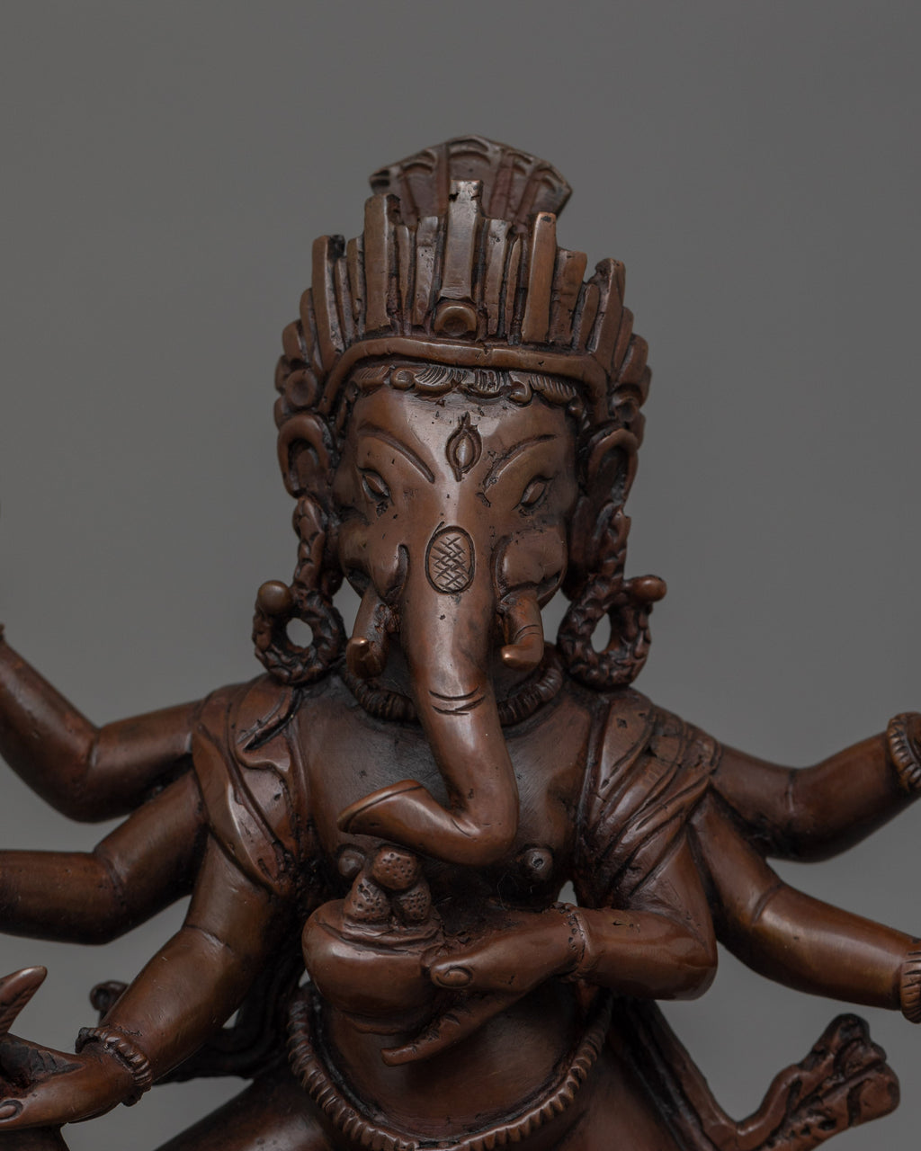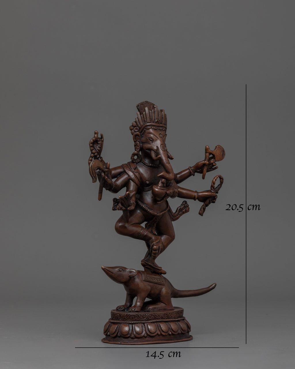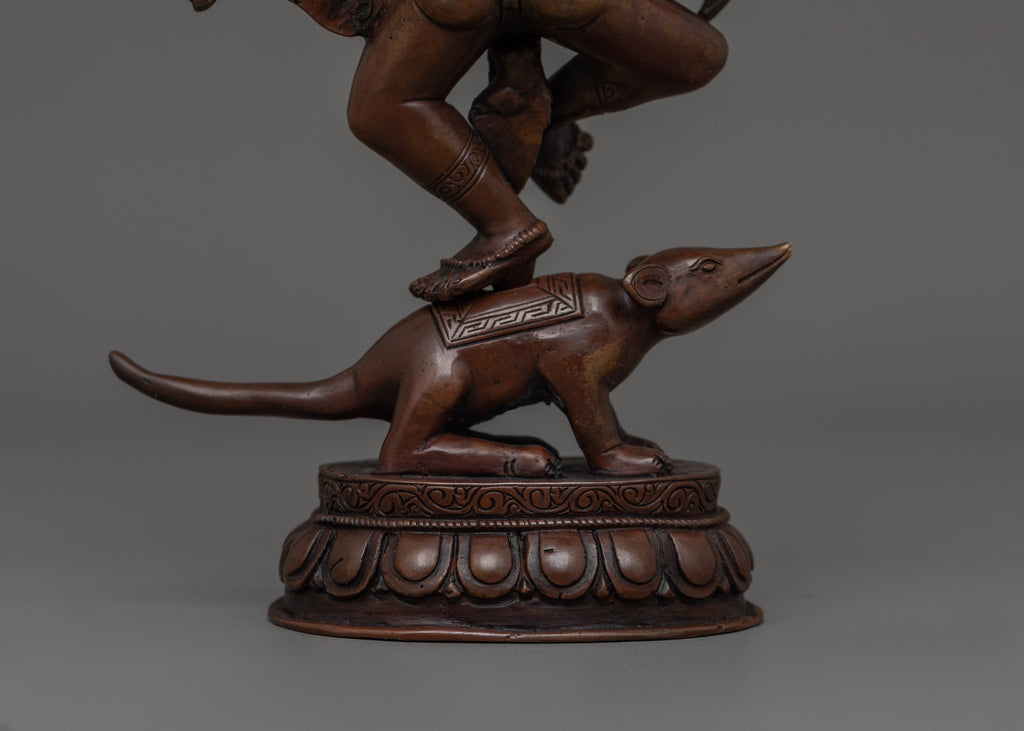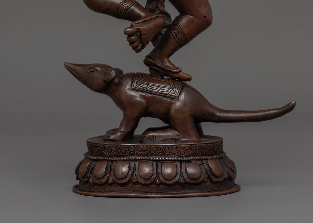 Ganesha's elephant head symbolizes wisdom, understanding, and a discriminating intellect that one must possess to overcome obstacles. His dancing Posture symbolizing balance between energy and tranquility. The mouse at his feet represents desire and ego, which he controls and rides upon, demonstrating humility and mastery over desires. Crown Indicates divinity and supreme status among deities.