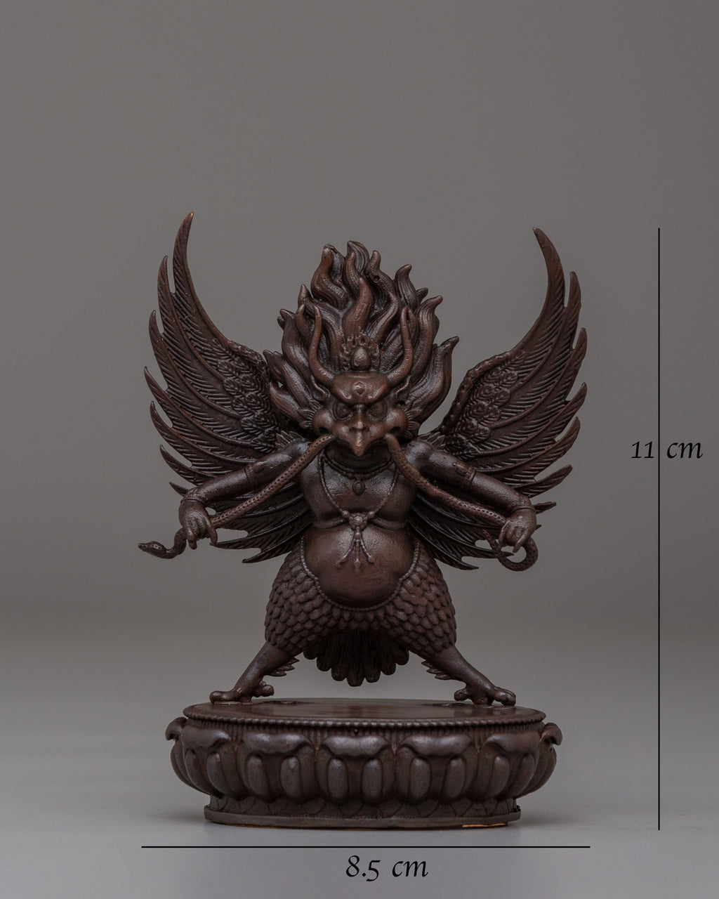 The Garuda Buddhist Statue embodies strength, protection, and spiritual power. This handcrafted figure measures 11 cm in height and 8.5 cm in width, weighing 0.27 kg. Crafted from oxidized copper, it features intricate detailing, including its wings, expressive face, and dynamic posture. Garuda, the revered bird deity in Buddhist and Hindu traditions, symbolizes victory over evil forces and serves as a powerful protector against negative energies. Its commanding presence makes this statue an ideal addition to any altar, meditation space, or sacred area, offering both aesthetic beauty and profound spiritual significance.