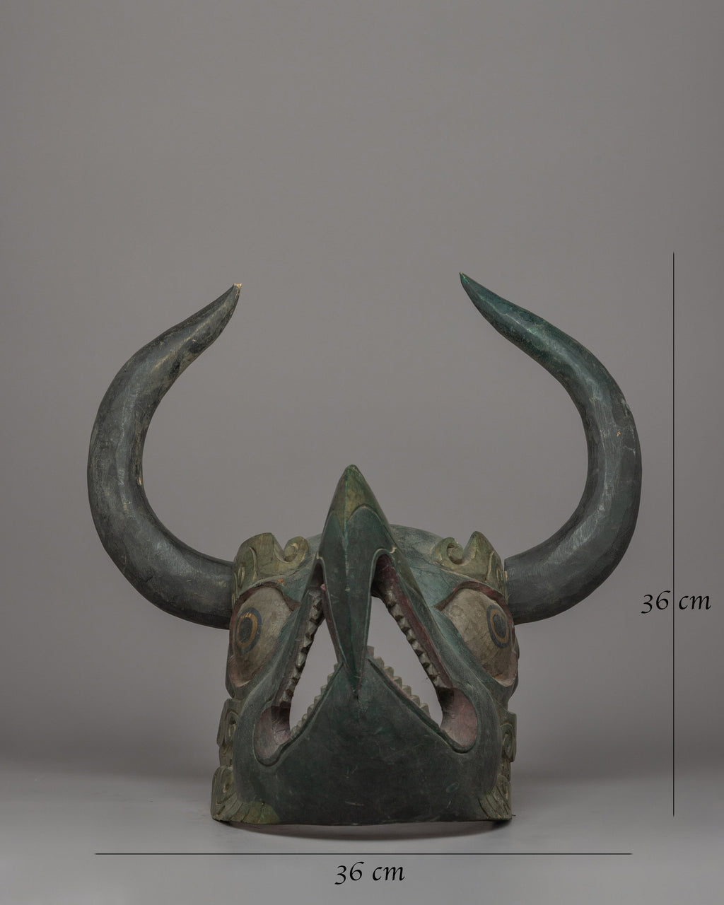 This stunning Garuda mask exemplifies the intricate craftsmanship and cultural significance of Bhutanese artistry. The mask, which stands 36 cm tall and 36 cm wide, is an impressive and bold representation of the Garuda, a mythical bird-like creature revered in both Hindu and Buddhist traditions for its power and valor. The design incorporates Garuda's iconic features, such as wide, curved wings and an open, fierce beak. The mask's expression is dynamic and full of energy, conveying Garuda's strength and fearlessness.
