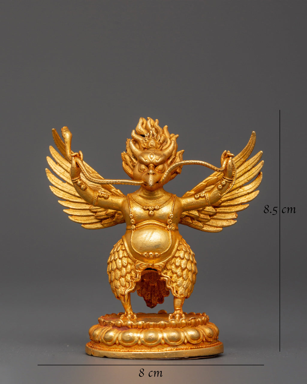 This Garuda statue is crafted from copper and finished with a gold plating. The figurine, which measures 8.5 cm in height and 8 cm in breadth and weighs 0.15 kg, depicts Garuda in his magnificent, winged form, representing speed, power, and divine protection. In Buddhist and Hindu beliefs, Garuda is revered as the perpetual foe of nagas (serpent spirits) and as Lord Vishnu's mount or vehicle.