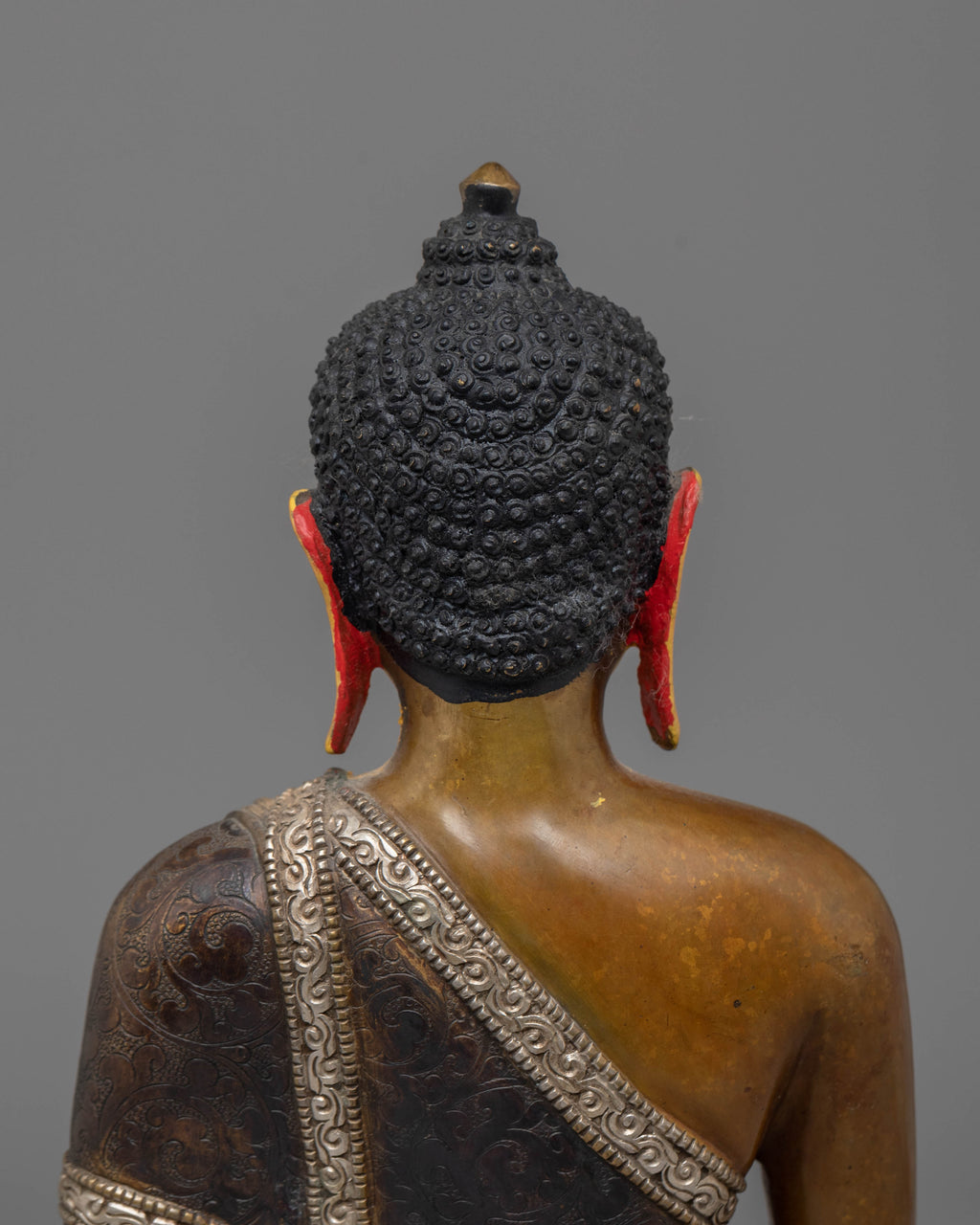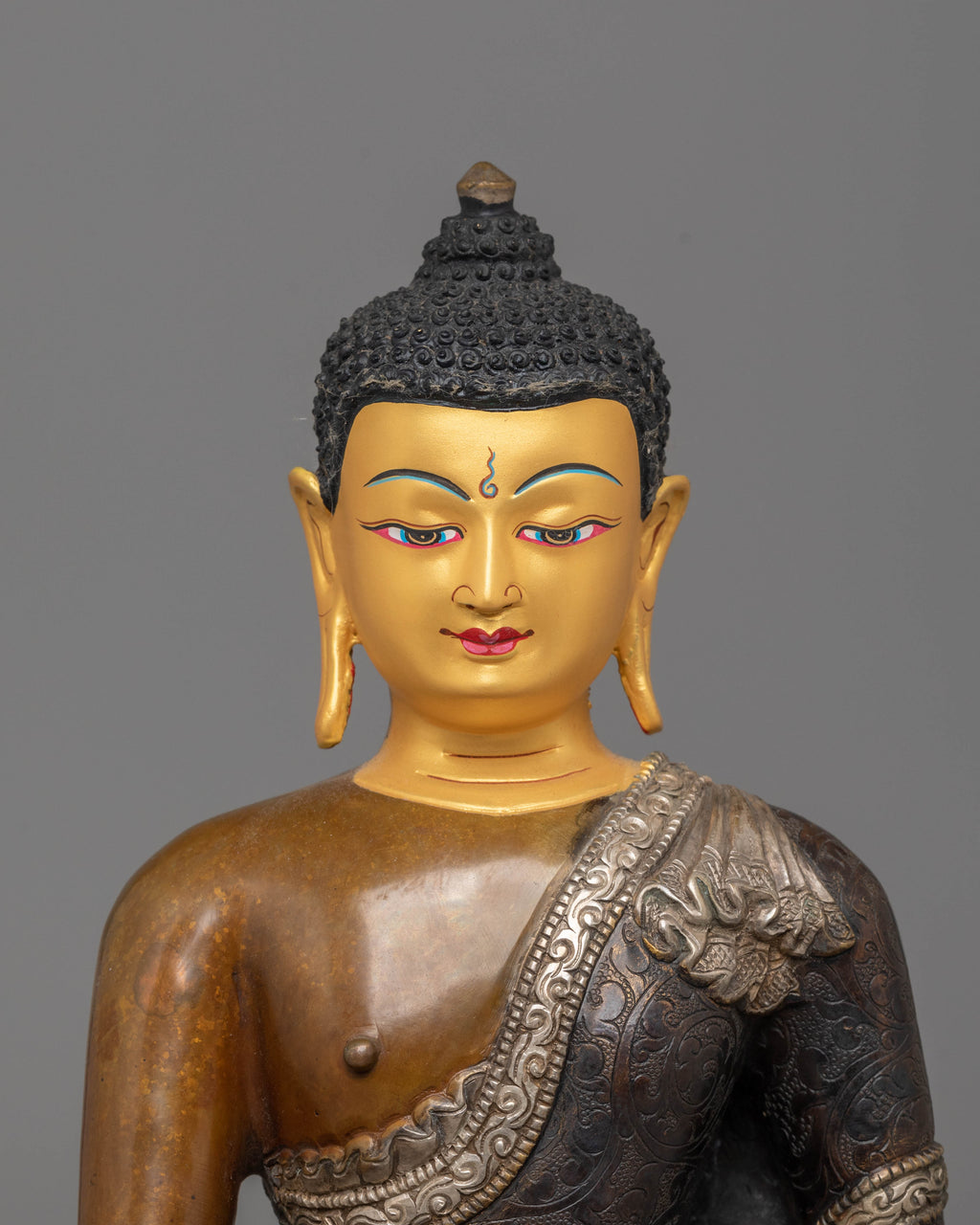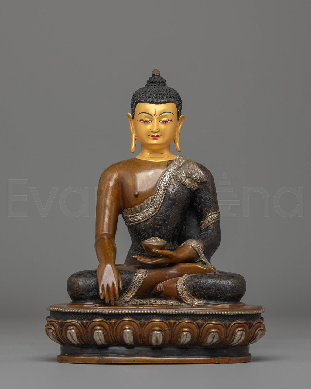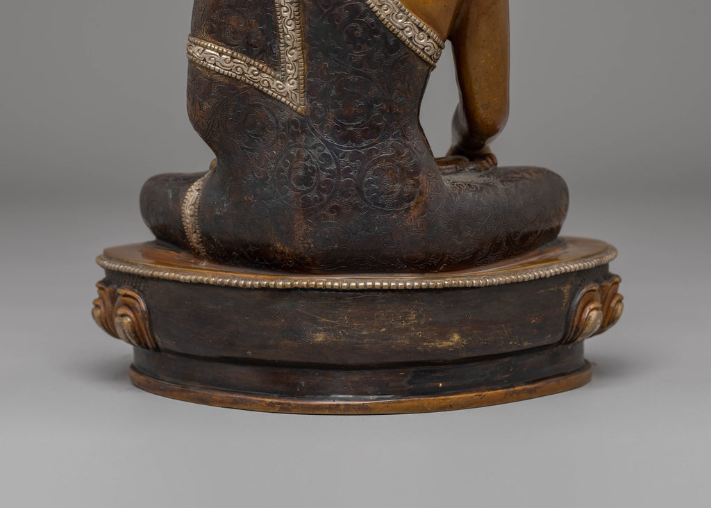 The Shakyamuni Buddha is depicted with his right hand in the Bhumisparsha Mudra, symbolizing the moment of enlightenment when he touched the Earth to witness his awakening. His left hand holds an alms bowl, representing his renunciation and devotion to the path of simplicity. The ushnisha, or crown-like topknot, signifies his wisdom and spiritual knowledge. Resting on a lotus base, the Buddha represents purity, rising above worldly attachments. Dressed in monastic robes, he embodies humility and the path of enlightenment.