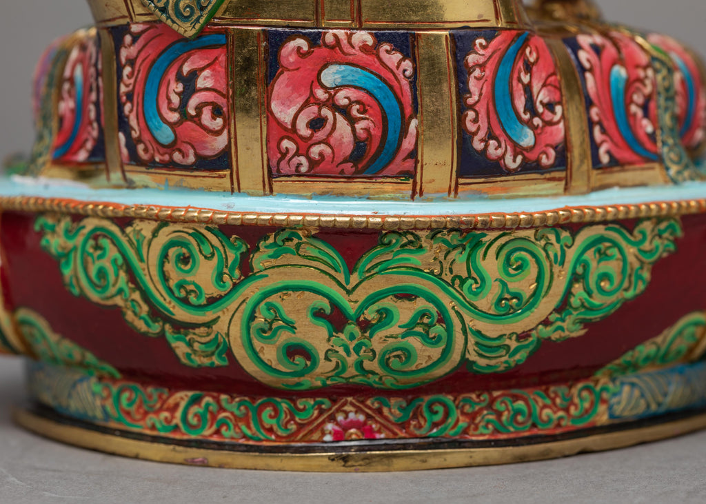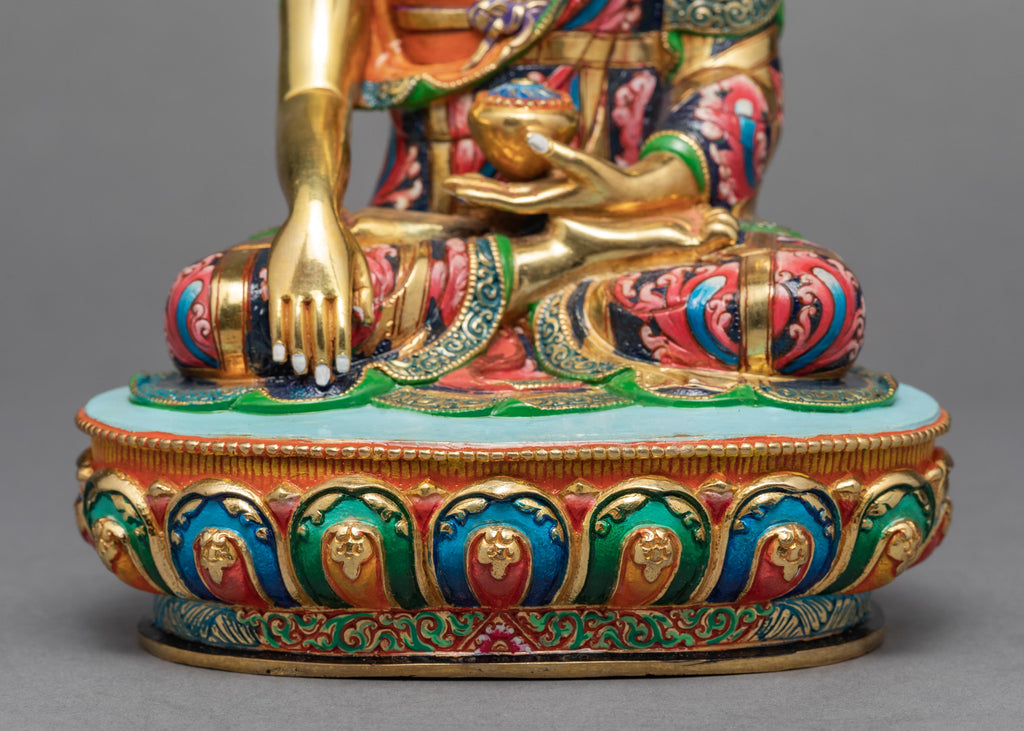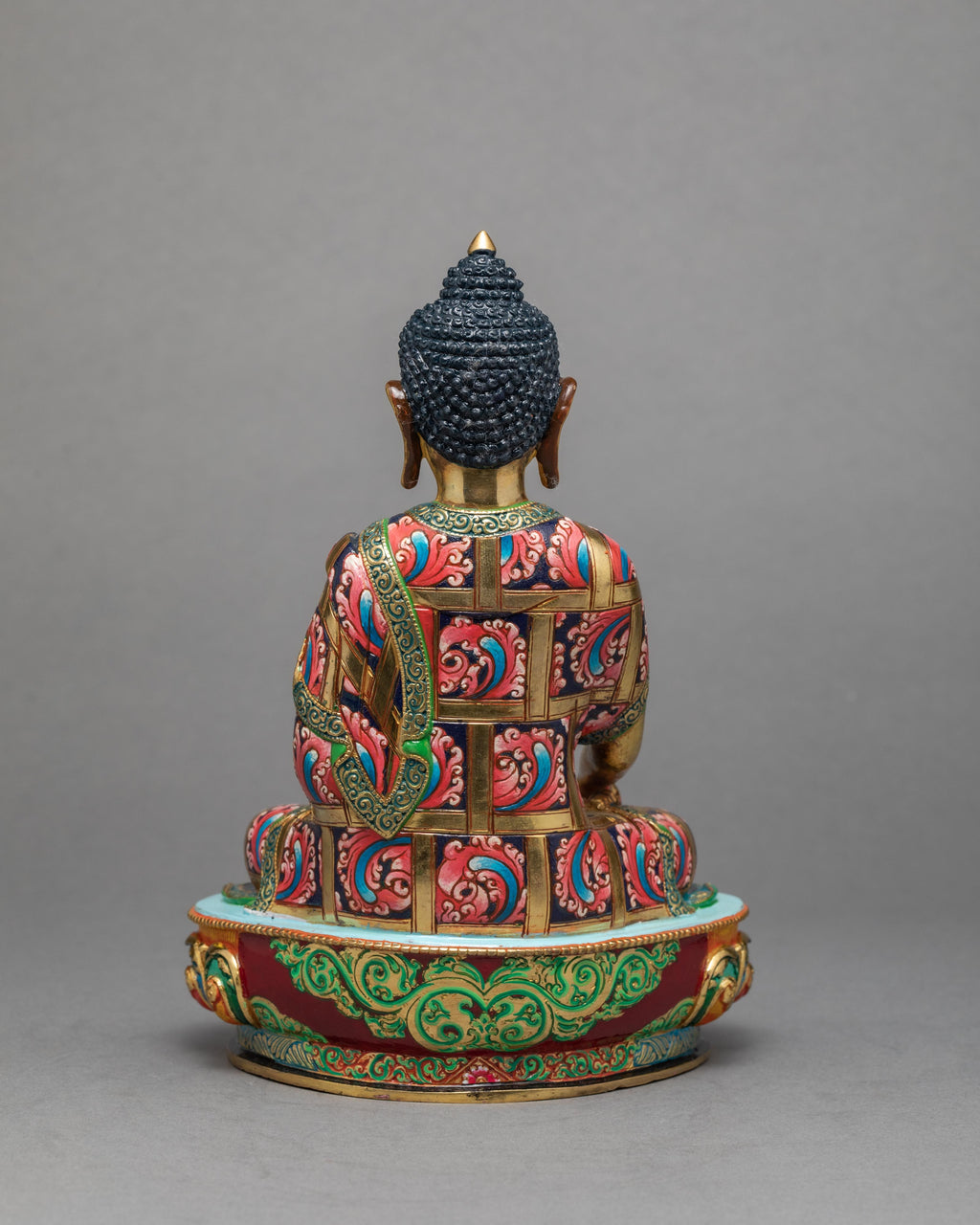 Gautama Buddha is also known as Shakyamuni Buddha. This Himalayan art statue is copper, plated with gold, and painted with acrylic colors. This Sculpture is portrayed with a calm and peaceful face seated in vajra posture on a multicolor lotus seat. His body is draped in a multicolored robe while his right hand is on earth touching mudra and his left rest holding a begging bowl. The lengthened earlobes, which are vast and beautiful, represent a purposeful rejection of the material world in favor of spiritual enlightenment. The artist's Ushnisha above the head is entirely handcrafted, symbolizing Buddha's wisdom. The statue consists of triple-Layered Gold, 3D Embossed Carving with Deep Multi-Layered Engraving, and High-Quality Semi-Precious Hand Carved Stones.