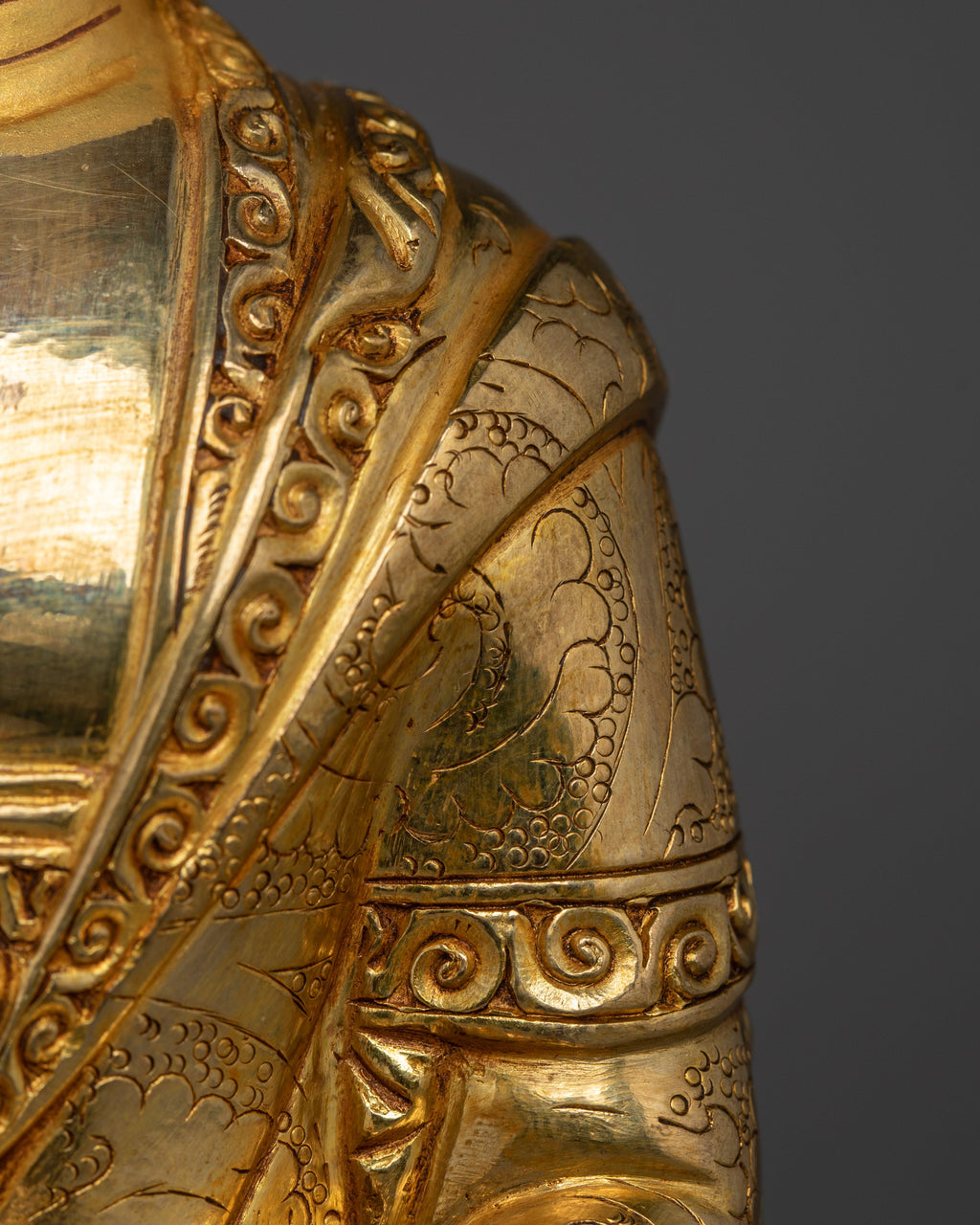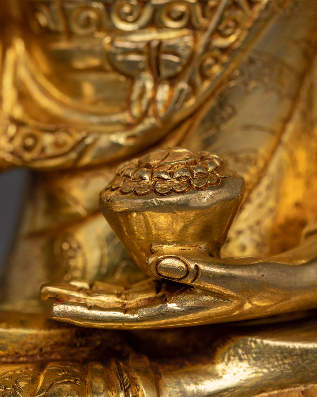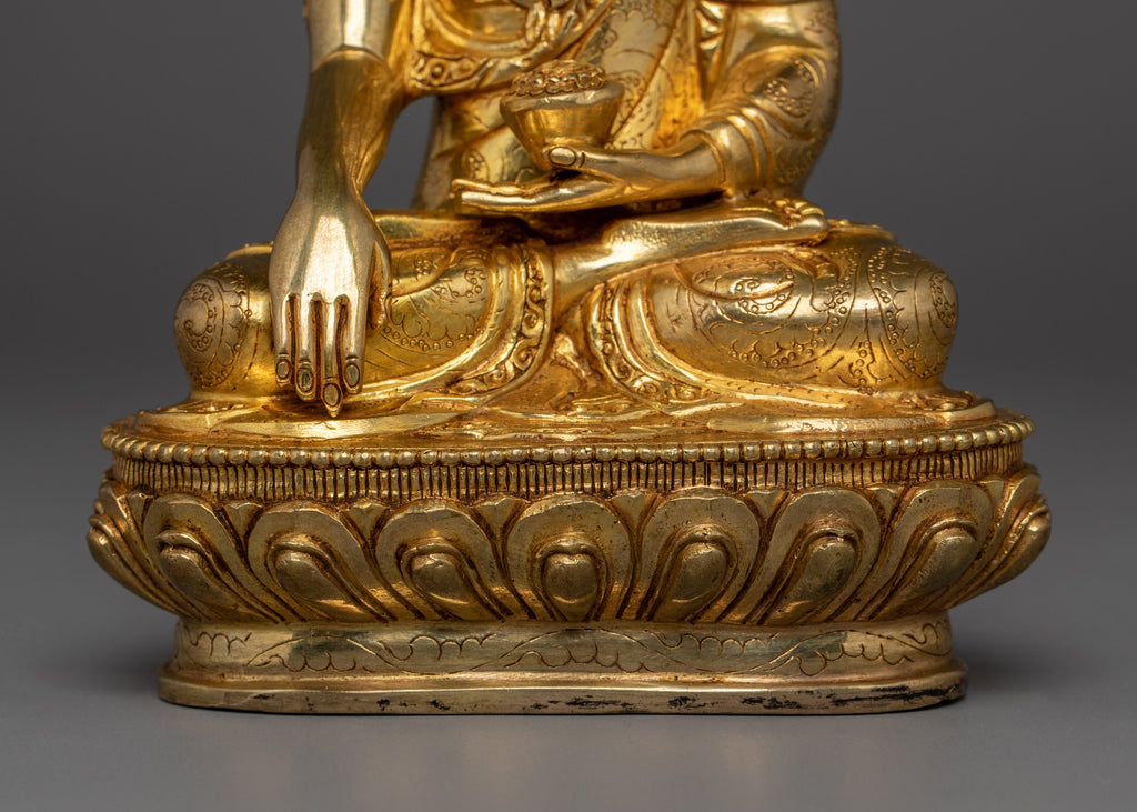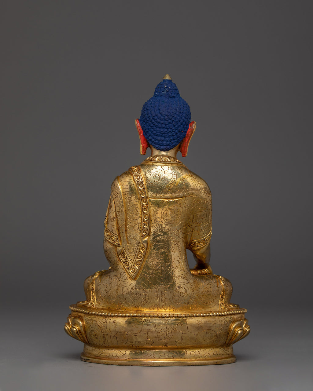 Shakyamuni Buddha is depicted in the Vajra posture, seated firmly on a lotus base, symbolizing purity and enlightenment. His right hand reaches toward the earth in the Bhumisparsha Mudra, marking the moment of his enlightenment, while his left hand holds an alms bowl, representing renunciation and the monastic path. He is adorned with a simple monastic robe, a serene facial expression that radiates inner peace, and the Ushnisha atop his head, symbolizing transcendent wisdom.
