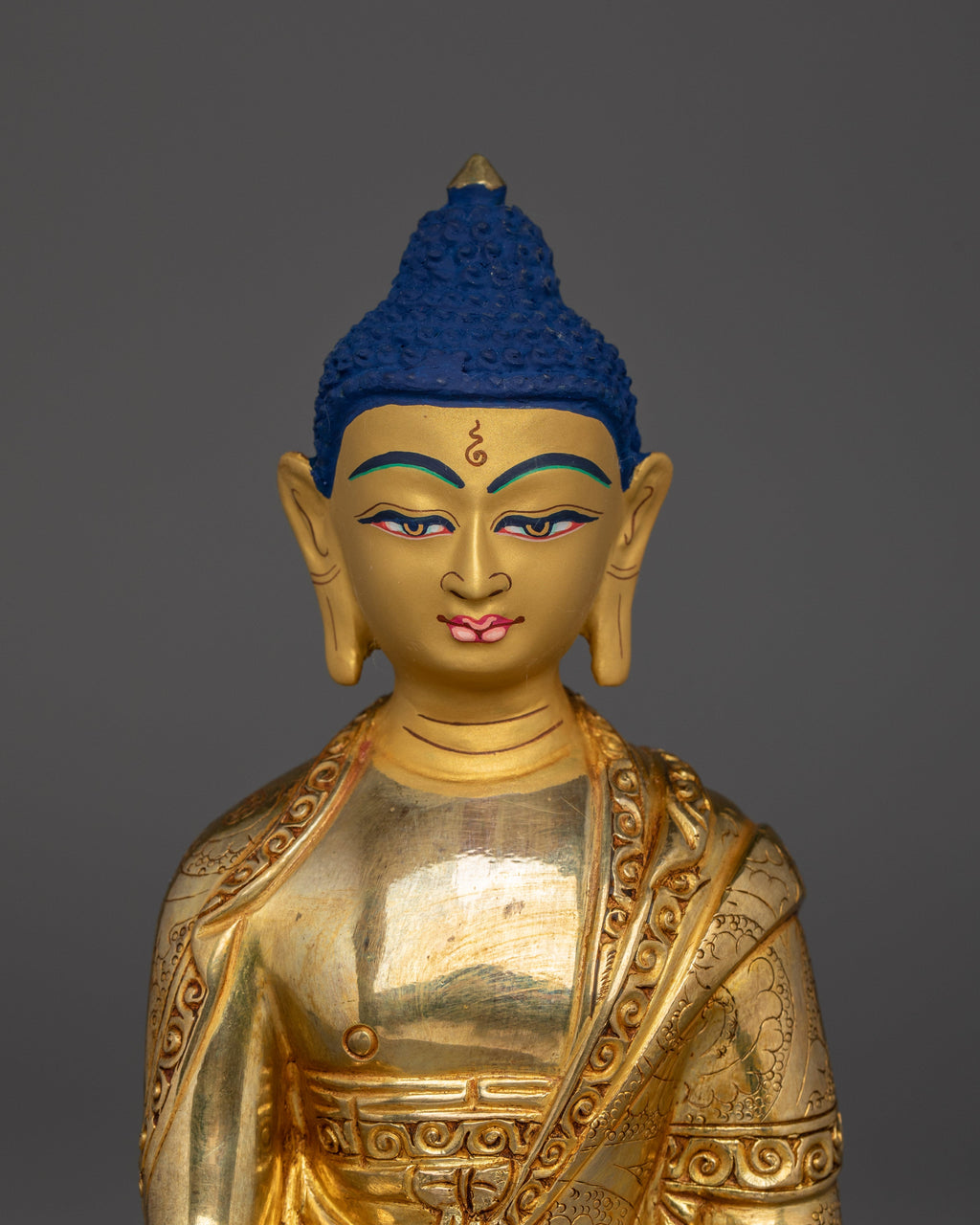 This peaceful figurine of Gautama Buddha, known as Shakyamuni Buddha, stands 8.7 inches (22cm) tall and 6.1 inches (15.5cm) wide, and weighs approximately 1.27 kilograms. Crafted by skilled Nepali artisans, the statue is made from a copper body and adorned with 24K gold gilding along with detailed gold and acrylic paintings. Depicted in serene meditation, this representation of the historical Buddha radiates tranquility and wisdom, making it a meaningful addition to any altar, meditation space, or sacred décor.