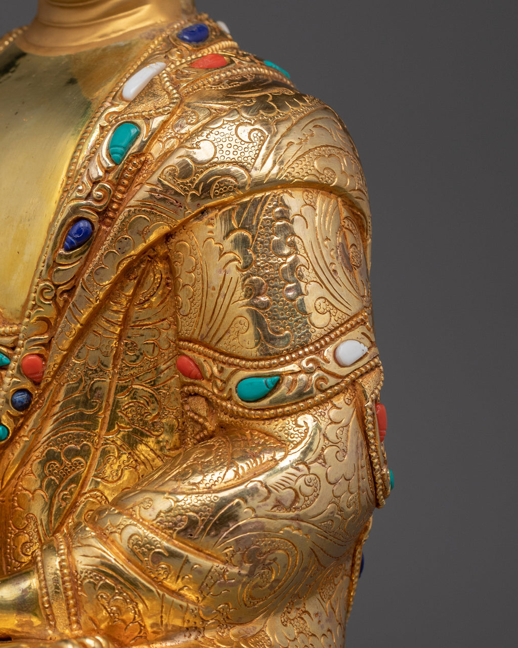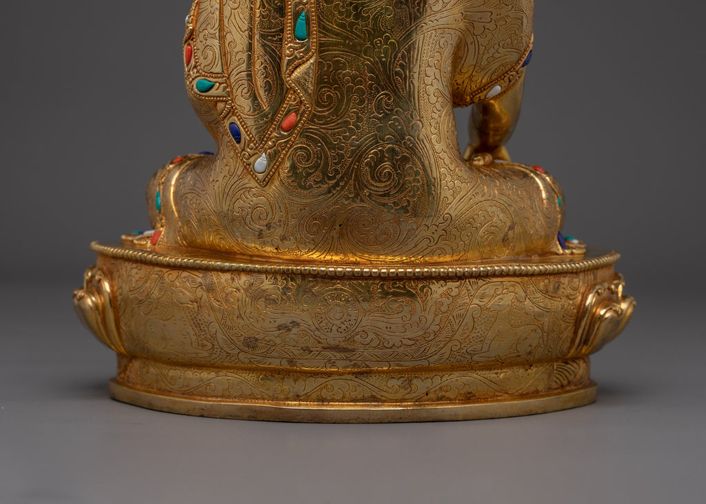 This Gautama Buddha Statue, a symbol of peace, also known as Shakyamuni Buddha, stands at 13.2”/33.5 cm in height and 10”/25.5 cm at the base, weighing 4.33 kg. Made from copper with a 24K gold gilding, gold and acrylic paintings, and hand‑carved gemstones, this piece reflects the exquisite skill of Nepali artisans. Designed to enhance any altar, meditation space, or tranquil corner of the home, it serves as a serene focal point, inviting contemplation and harmony.