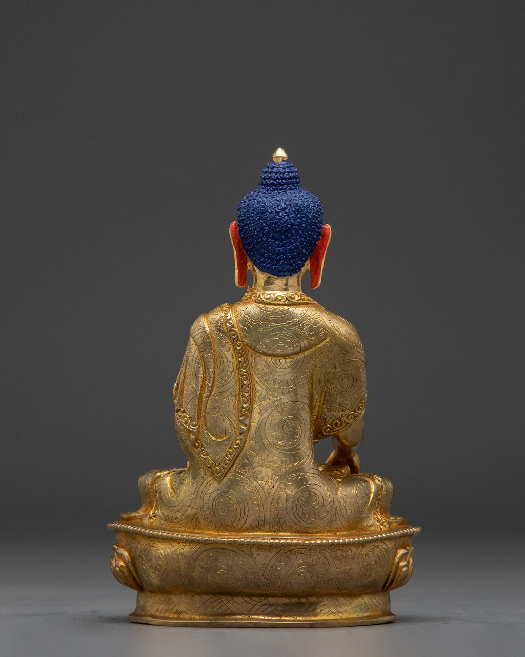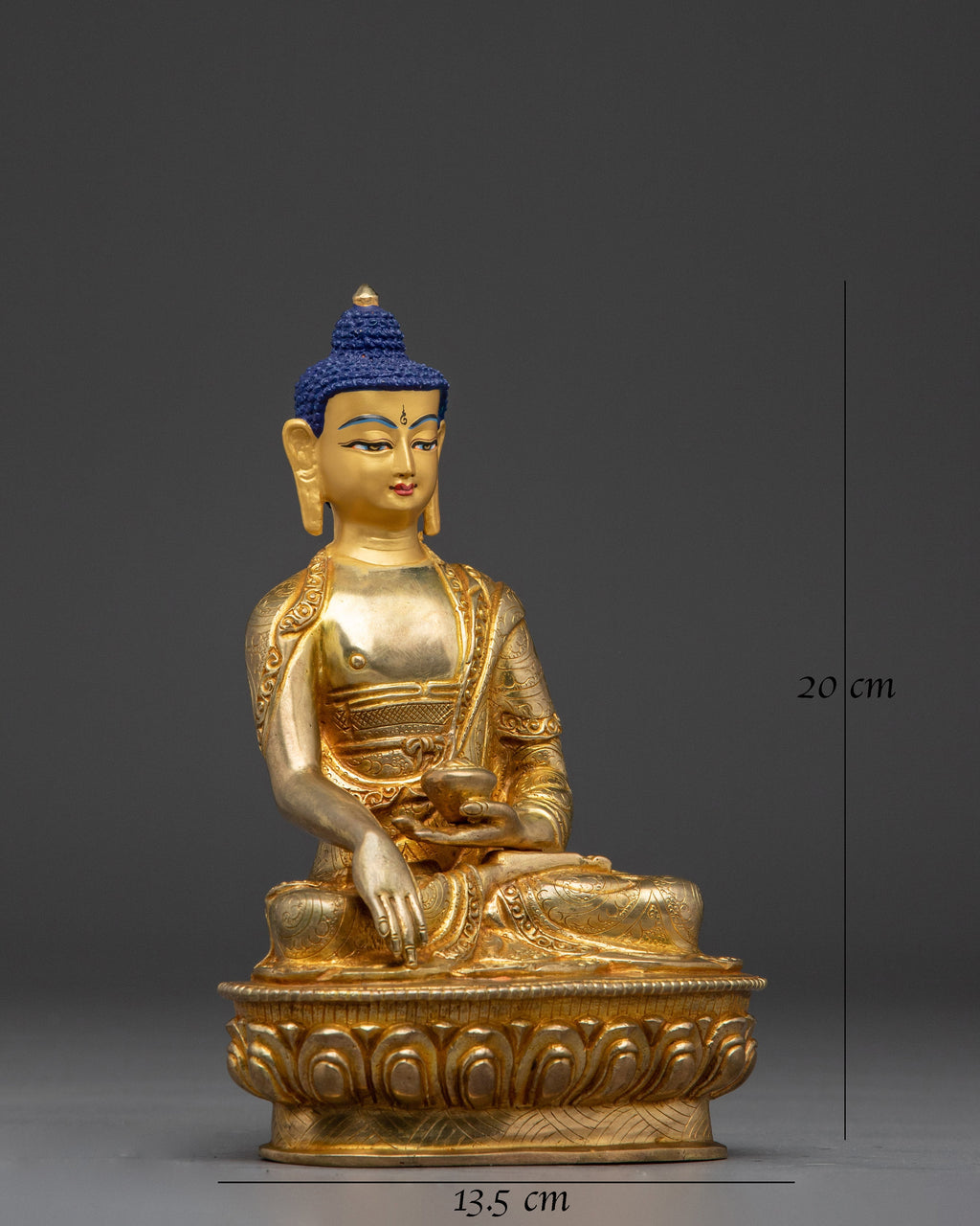 The Gautama Buddha: The Awakened One symbolizes the Buddha's deep teachings and the path to spiritual awakening. This handcrafted statue is 7.9" (Height) x 5.3" (Base) and weighs 1.01 kg. It is made of copper, decorated with 24K gold gilding, and enhanced with gold and acrylic paints. This sacred statue, crafted by expert Nepalese artisans, represents the craftsmanship of Himalayan Buddhism, making it an inspirational addition to altars, meditation places, or sacred collections.