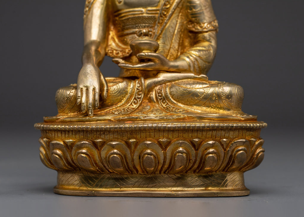 Shakyamuni Buddha is depicted sitting in the lotus pose (padmasana), indicating his steady concentration and mastery over the distractions of the material world. His right hand stretched toward the earth in bhumisparsha mudra, representing his moment of enlightenment, inviting the earth to witness his waking. The left hand, lying gently in his lap in dhyana mudra holding an alms bowl, depicts the profound state of meditation and mindfulness that leads to insight and clarity.