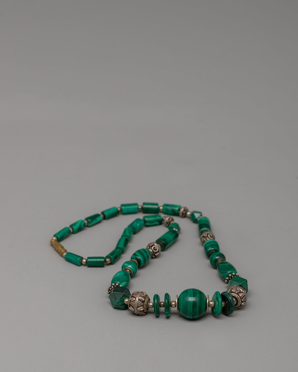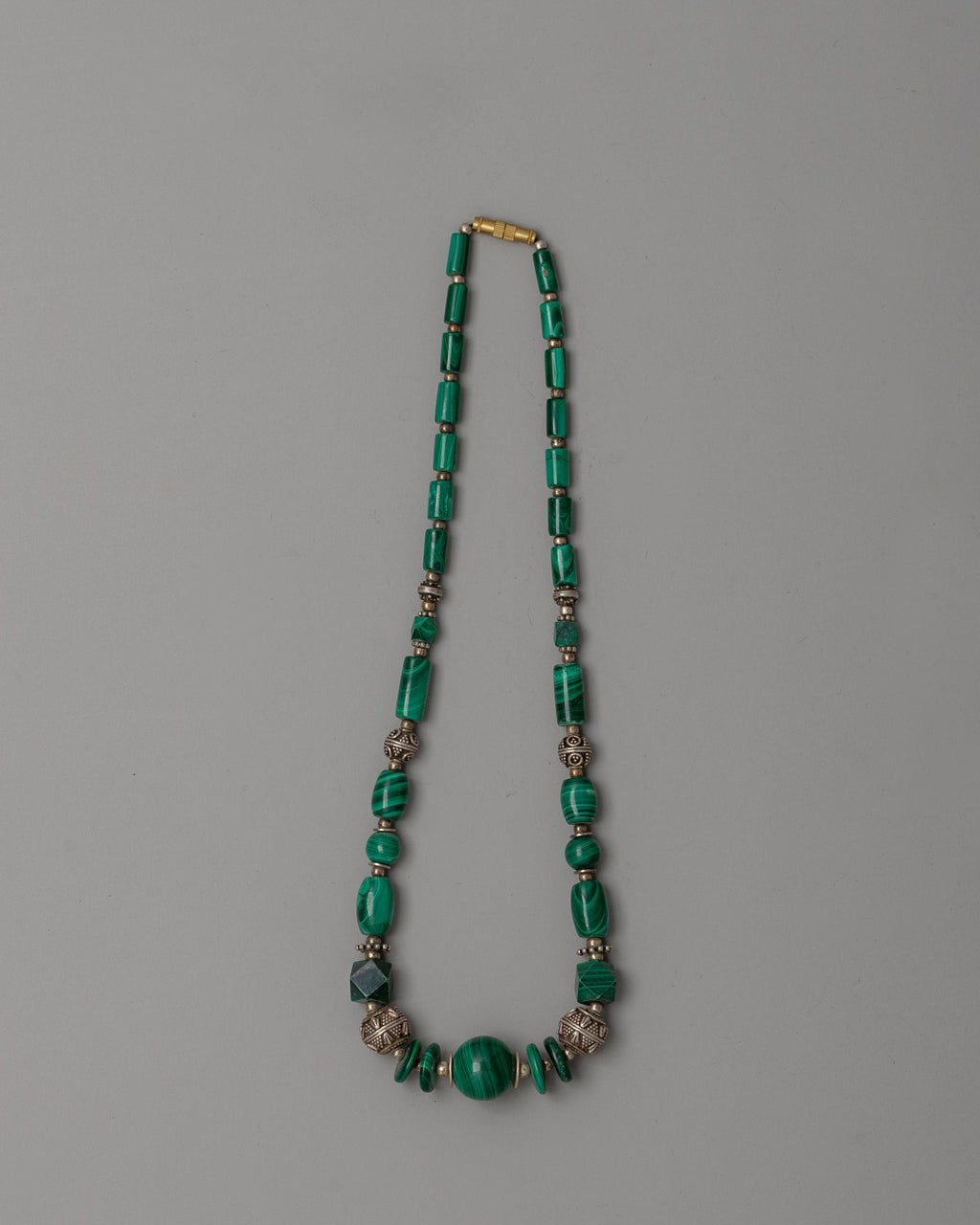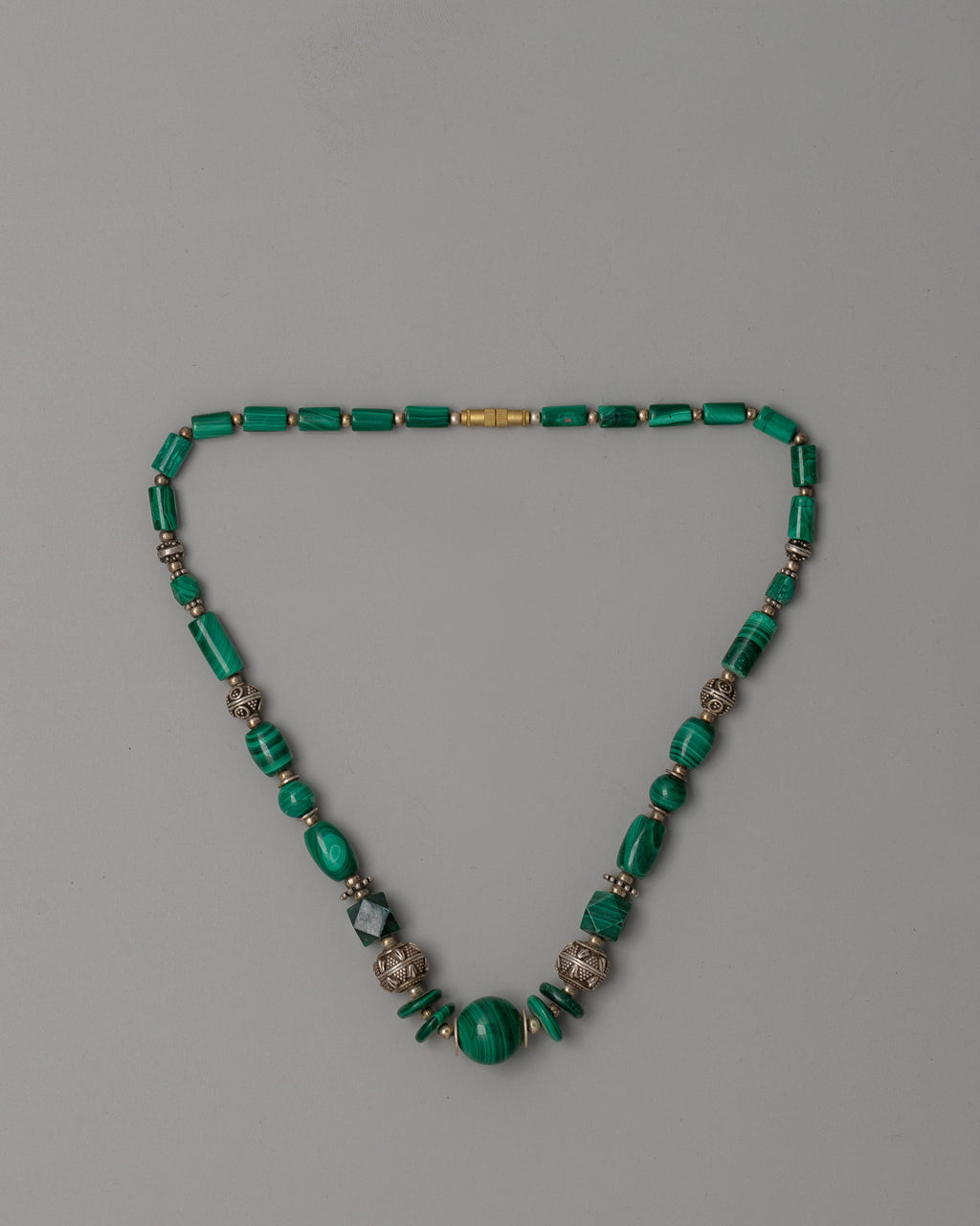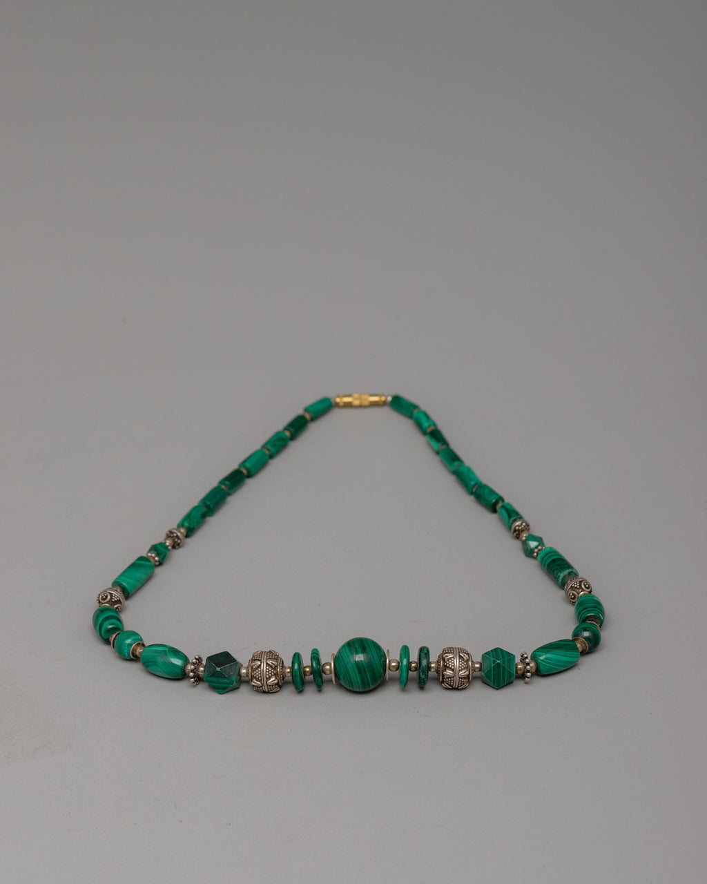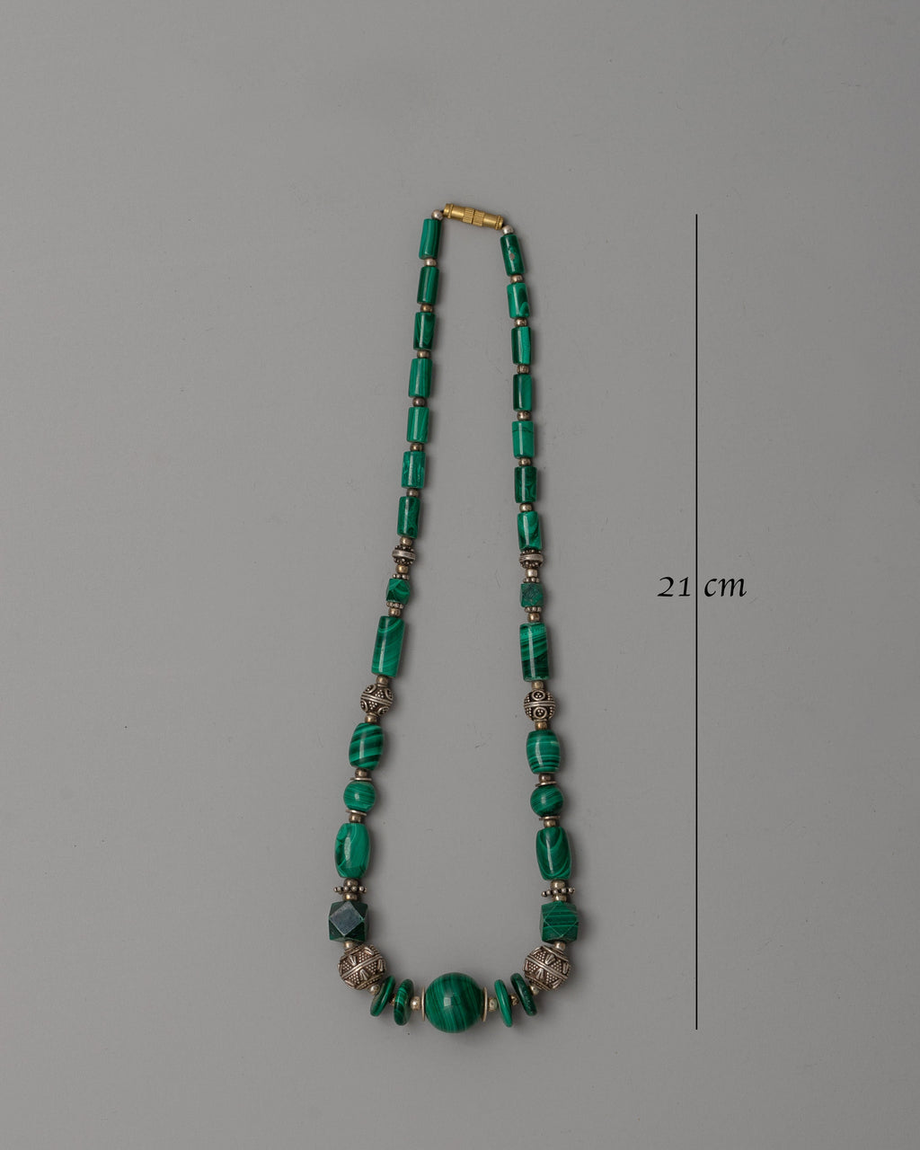 This Gemstone bead necklace is a stunning piece of jewelry made with fake stones and delicate white metal embellishments. This lightweight necklace, which is 21 cm long and weighs only 0.046 kilograms, is ideal for adding a touch of elegance to any ensemble. The meticulously placed artificial stones imitate genuine gemstones' beauty, displaying mesmerizing green hues that induce a sense of tranquillity and connection with nature. The white metal embellishments provide a modest yet refined contrast to the necklace's overall look.
