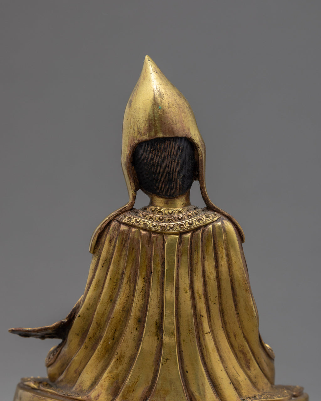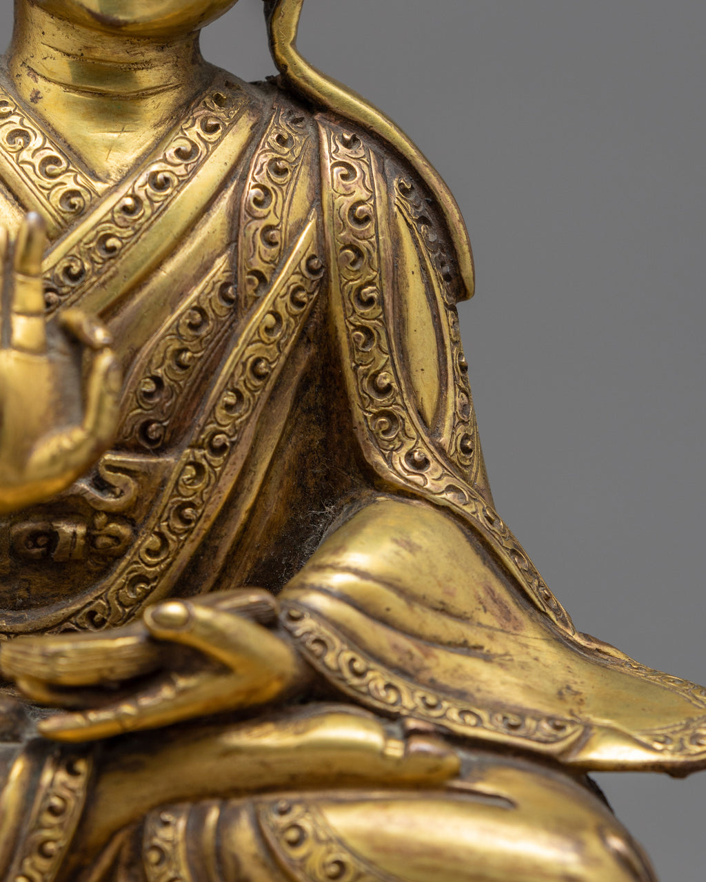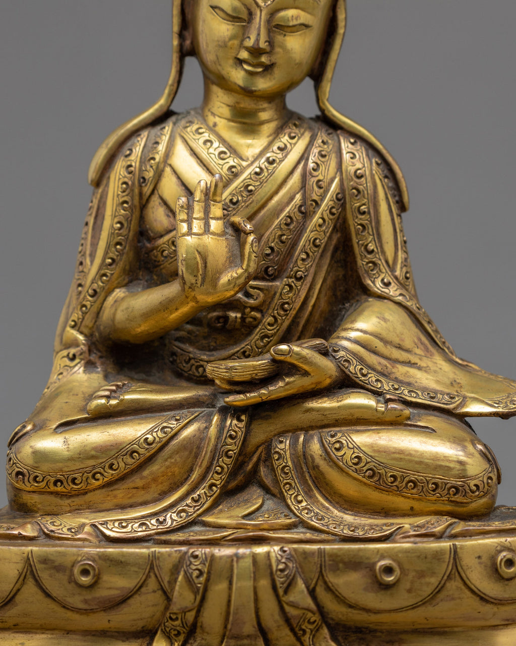 This gold-plated Gedun Druppa statue is hand-carved in copper and features a peaceful expression. The statue is finished with acrylic paint.