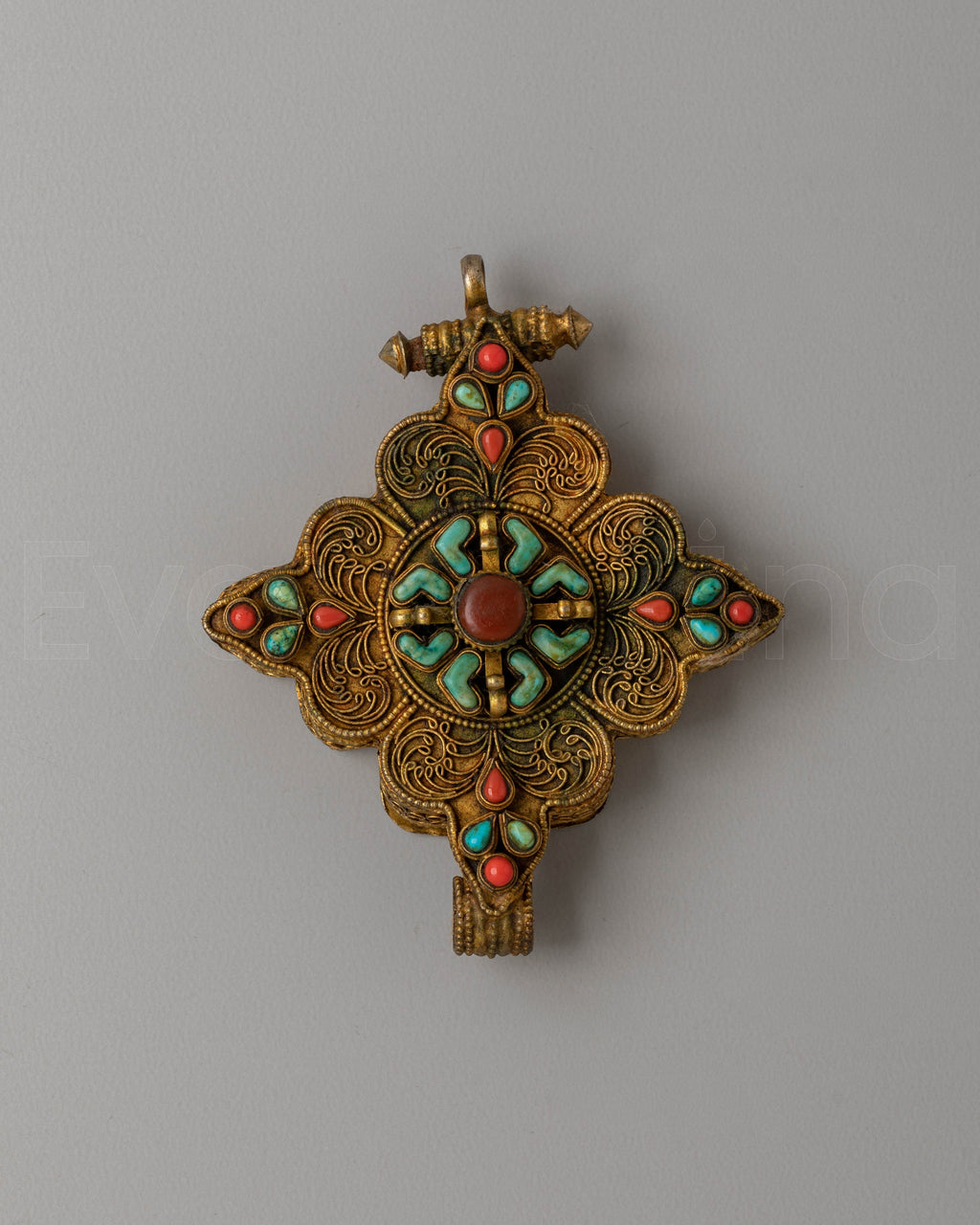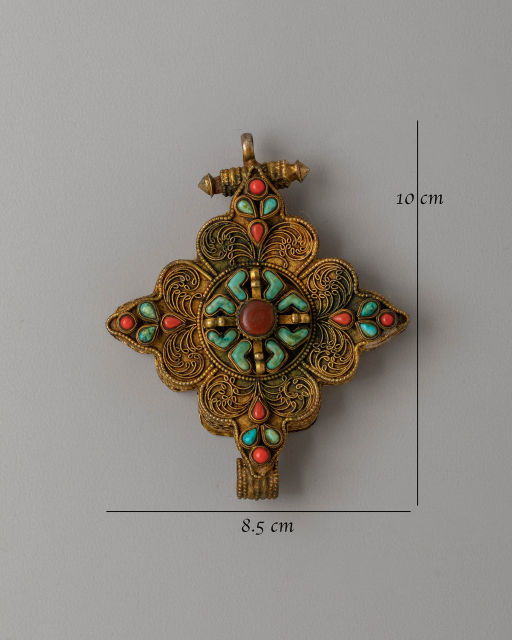 This locket features a stunning design, with a central gemstone surrounded by filigree work that evokes the intricate beauty of Tibetan art. The turquoise and coral gemstones are not only decorative but hold significant meaning in Buddhist symbolism. Turquoise is believed to bring good fortune and protection, while coral symbolizes life force. The gold plating gives the locket a divine glow, amplifying its spiritual energy and making it a meaningful accessory for those on a spiritual journey.
