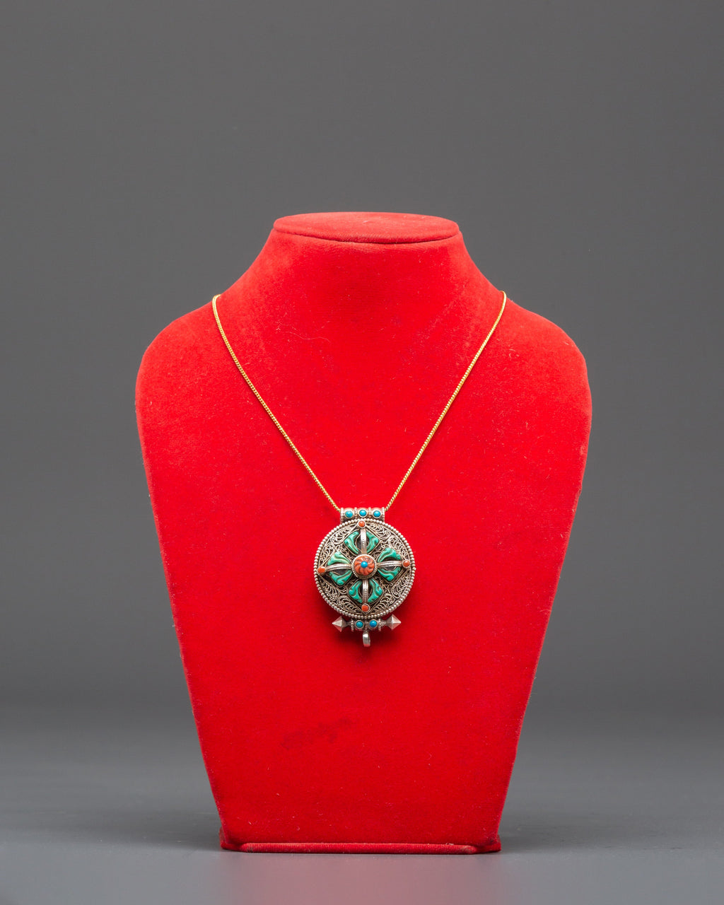 The Ghau box locket design is very detailed, with a small central depiction of a deity or religious symbol. The frame is embellished with coral and turquoise, which represent spiritual harmony and protection. Turquoise gemstones, traditionally associated with the sky and earth, are considered to provide powerful protective and healing qualities. In contrast, coral stones boost vitality and emotional power. Together, these materials create an amulet with both aesthetic beauty and deep spiritual value, making it an essential addition to any Tibetan jewelry collection.