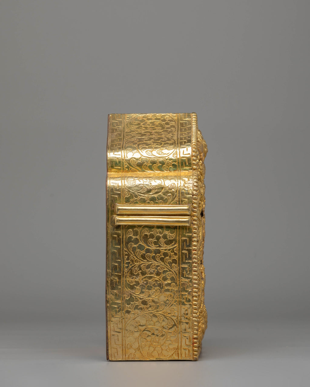 The Ghau Box features exquisite floral motifs that represent growth, abundance, and harmony, which are central to Buddhist teachings. These delicate designs adorn the box's surface, creating a sense of serenity and balance. The combination of Copper and Fire Gold adds depth and brilliance, making this piece visually stunning and spiritually powerful. Ideal for storing offerings such as incense, grains, or sacred items, it helps maintain focus during rituals and enhances your connection to the divine.