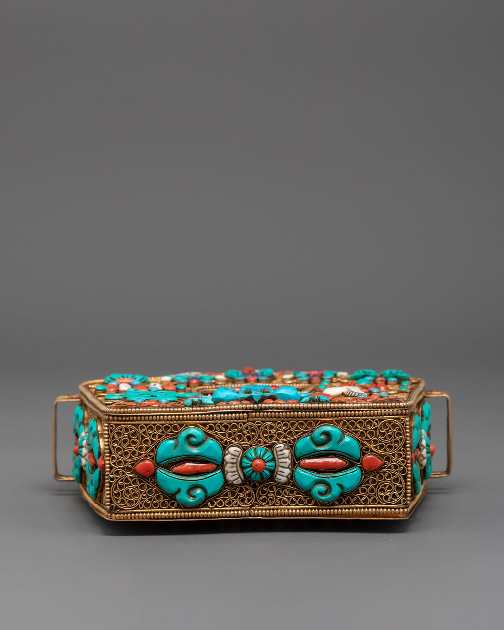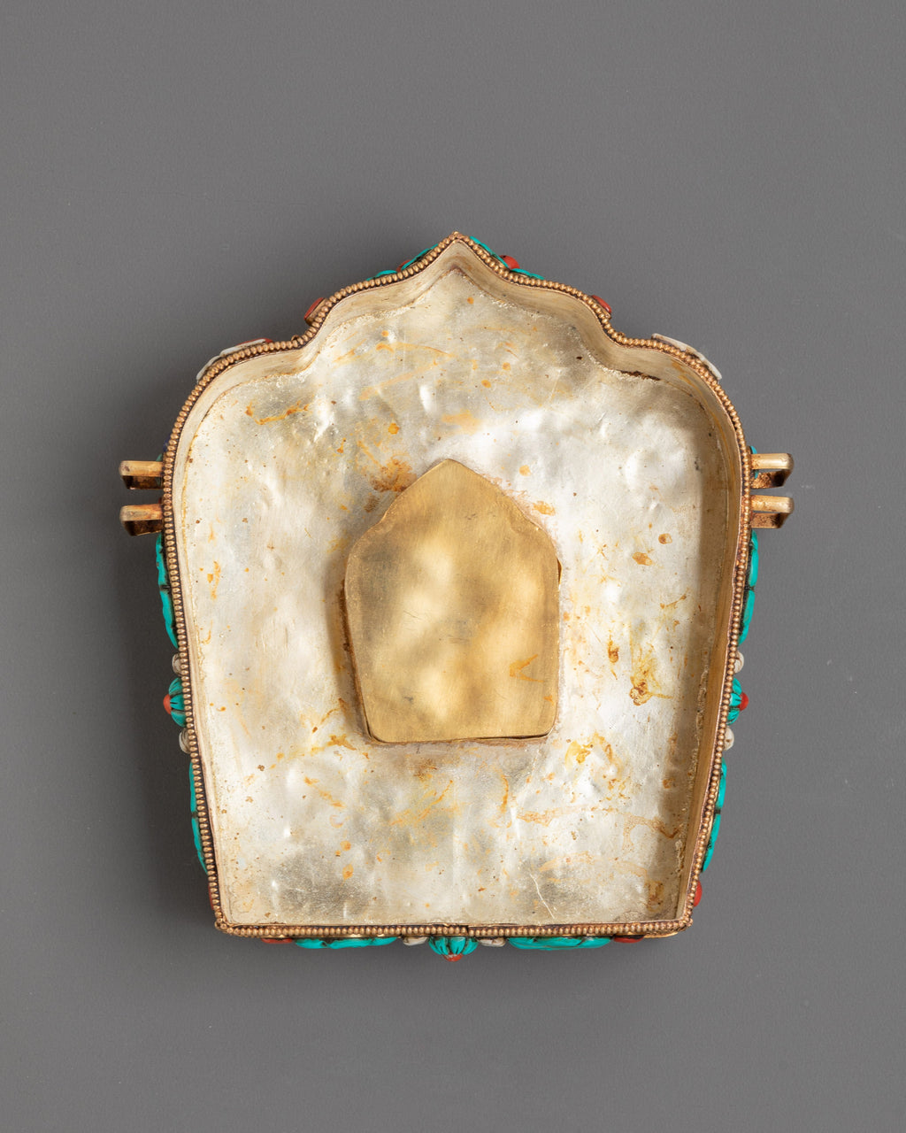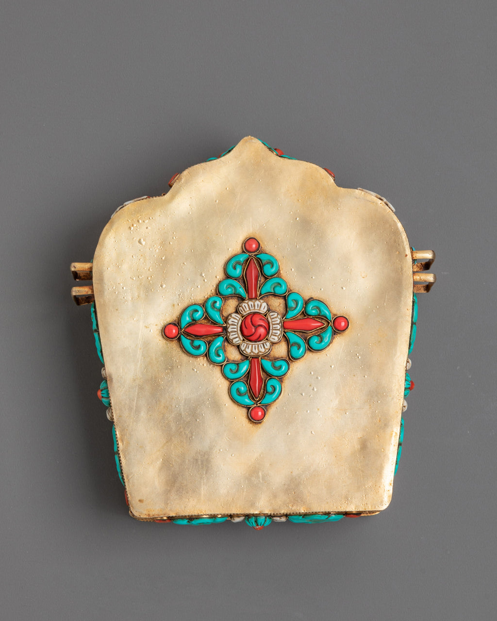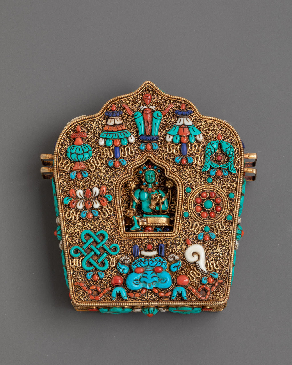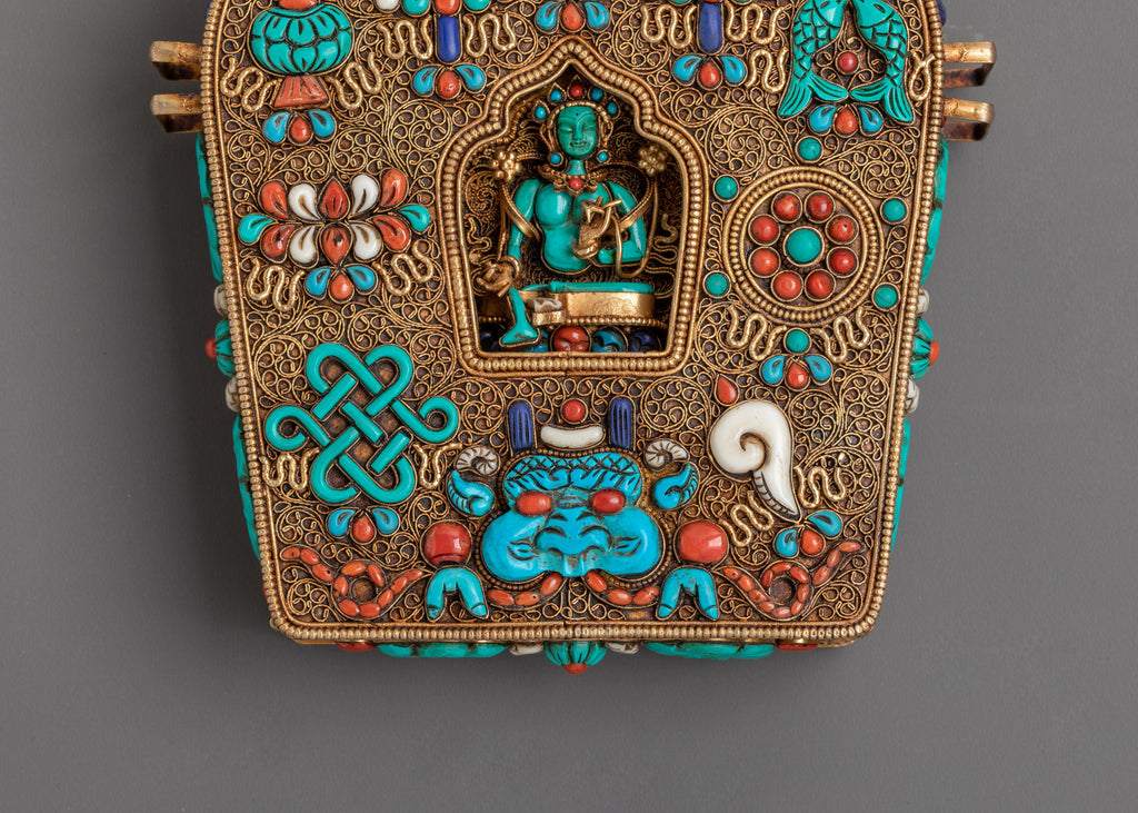 This Ghau Box serves as both a decorative and utilitarian devotional object. It is made of copper and has a gold-plated finish, with complex motifs such as conch shells, turquoise beads, and coral stones that add to its overall visual appeal. The combination of these materials results in a visually striking and culturally significant object that can be placed in homes, temples, or meditation areas. The box is an eye-catching way to store sacred things or relics, making it an original addition to any collection or a considerate present for individuals who value Tibetan art and spirituality.