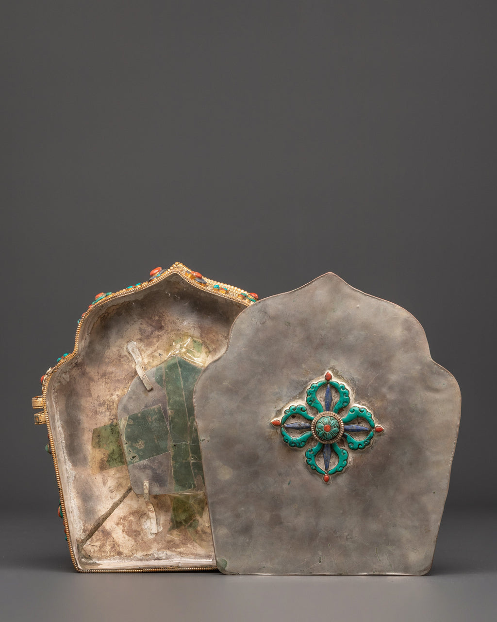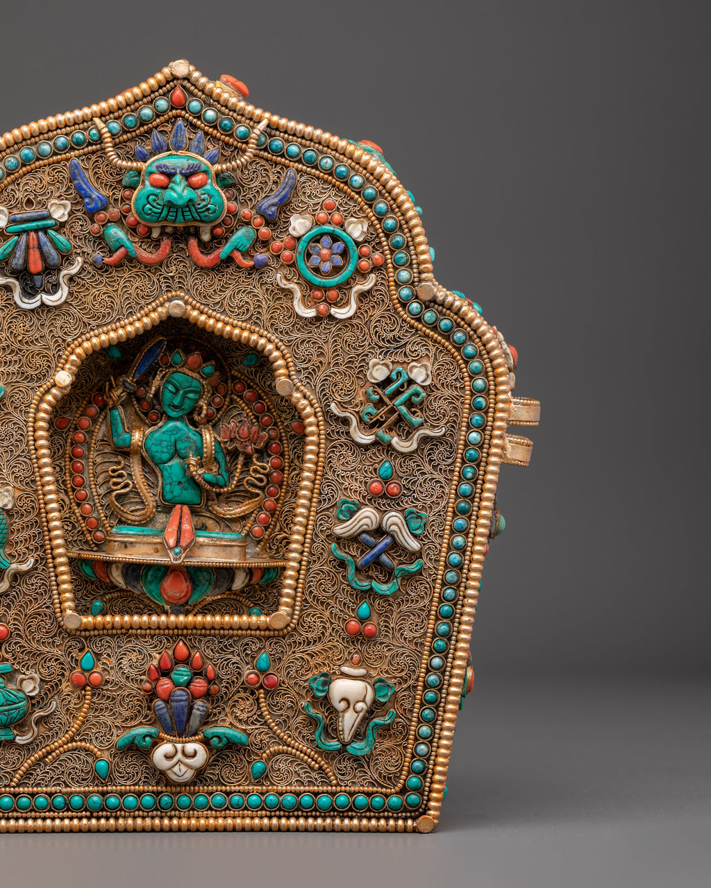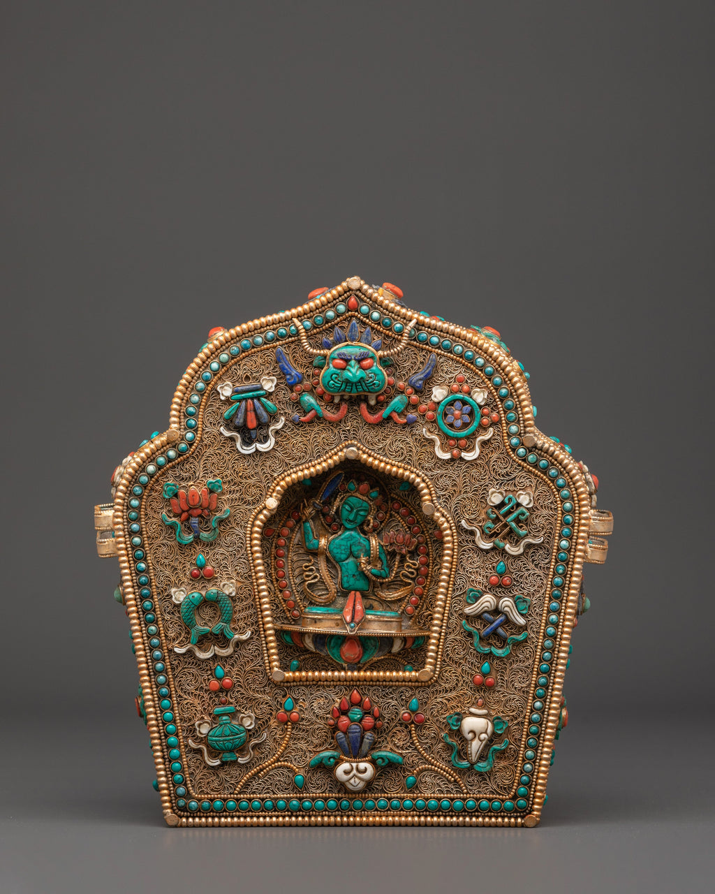 The Tibetan Ghau Box with Manjushri is an exquisite sacred container designed to enhance your ritual offerings, meditation, and spiritual practices. Measuring 26 cm in height and 24 cm in width, this beautifully crafted box is made from copper with elegant silver and gold plating, ensuring both longevity and appearance. Its intricate filigree work showcases exceptional artistry, while the vibrant turquoise and coral stones infuse your altar or meditation space with powerful spiritual energy. This box not only serves as a protective vessel for sacred items but also elevates the ambiance of your sacred space, inviting wisdom, clarity, and positive vibrations into your spiritual journey.