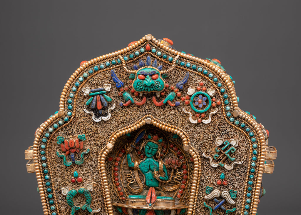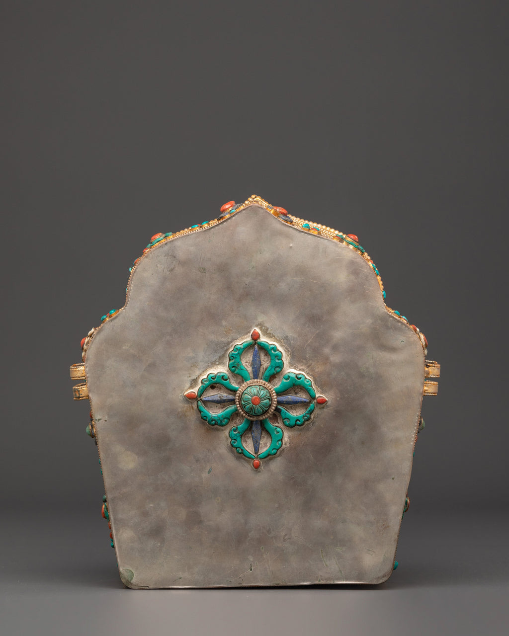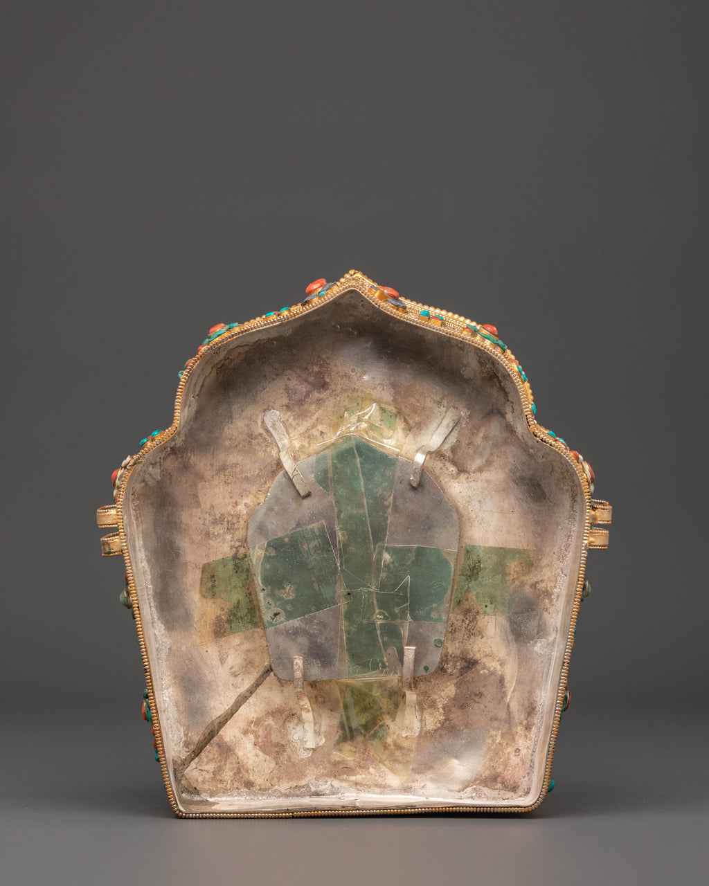 The Tibetan Ghau Box with Manjushri is an exquisite sacred container designed to enhance your ritual offerings, meditation, and spiritual practices. Measuring 26 cm in height and 24 cm in width, this beautifully crafted box is made from copper with elegant silver and gold plating, ensuring both longevity and appearance. Its intricate filigree work showcases exceptional artistry, while the vibrant turquoise and coral stones infuse your altar or meditation space with powerful spiritual energy. This box not only serves as a protective vessel for sacred items but also elevates the ambiance of your sacred space, inviting wisdom, clarity, and positive vibrations into your spiritual journey.