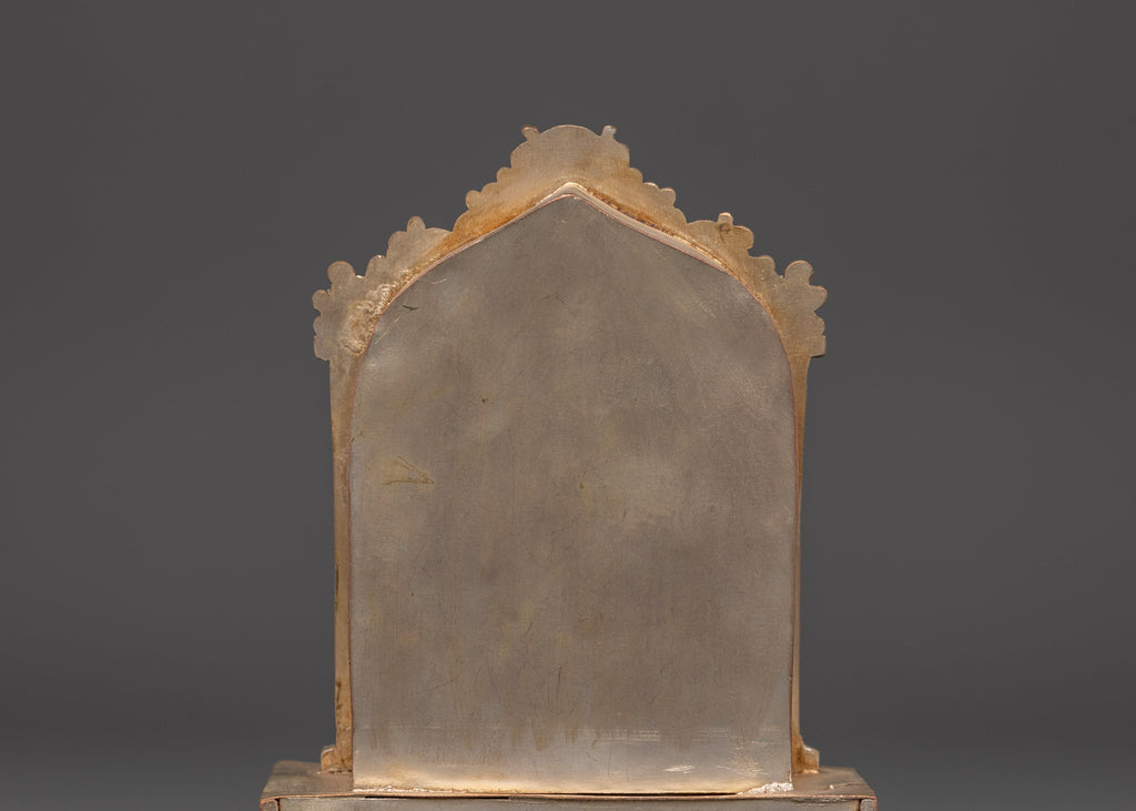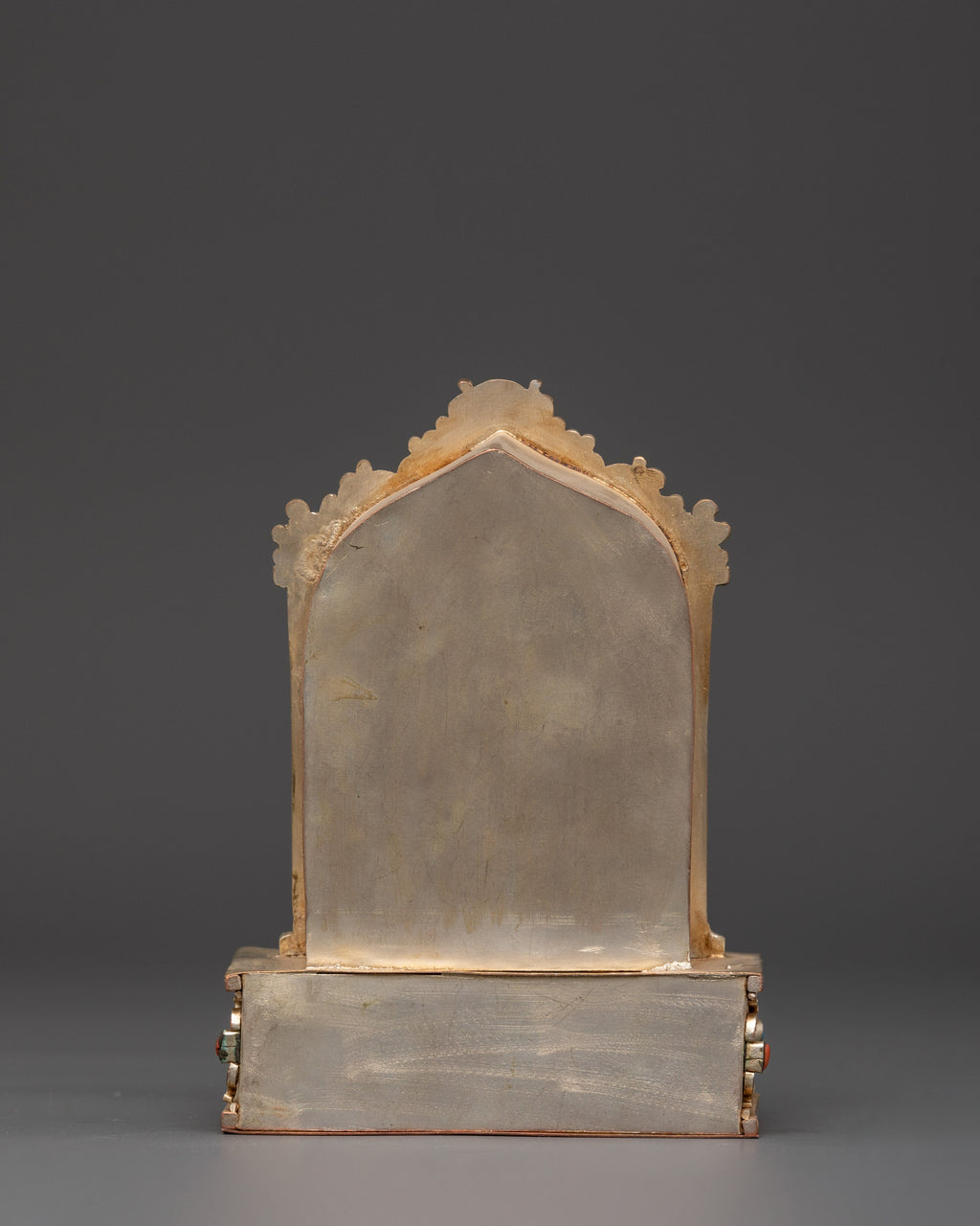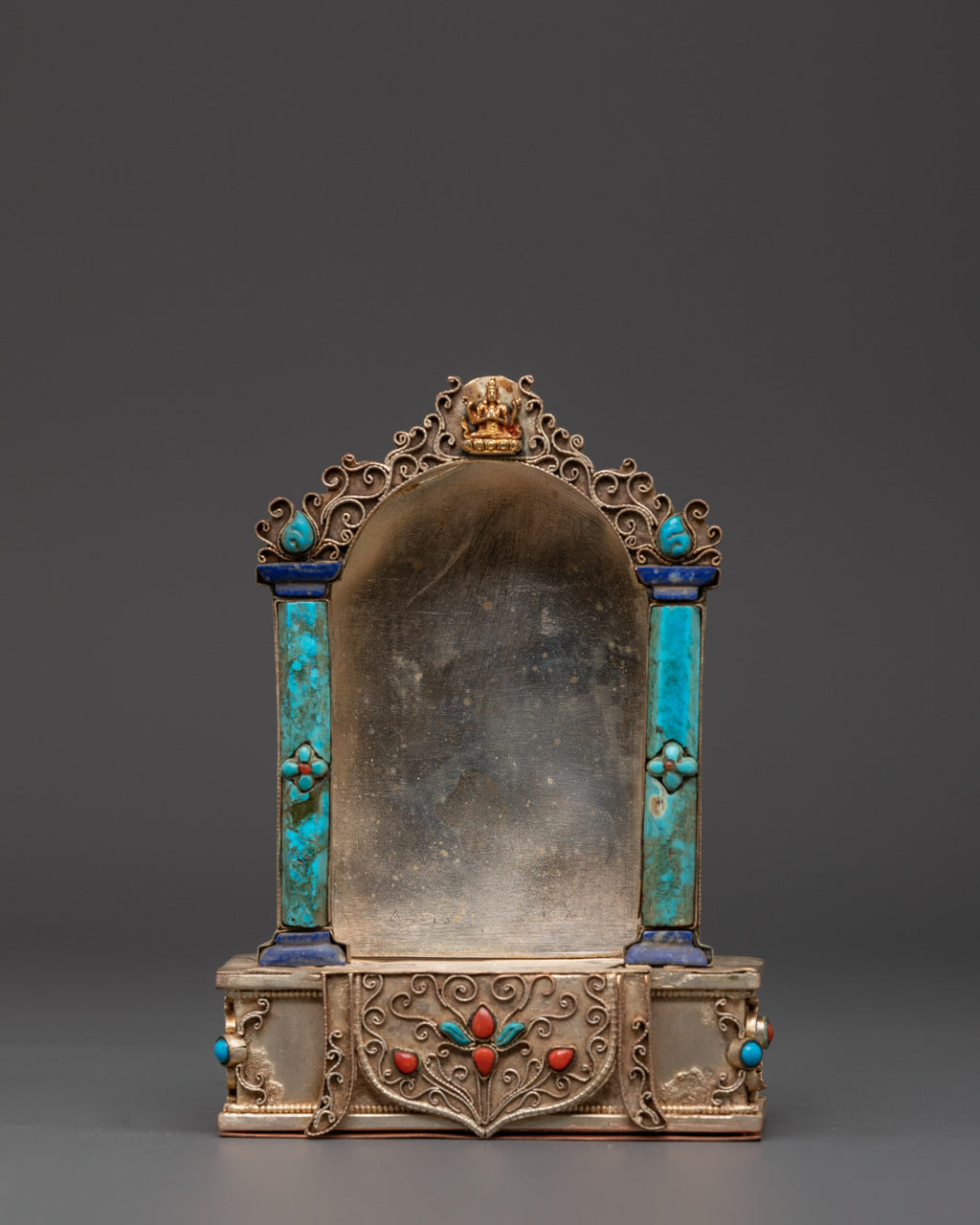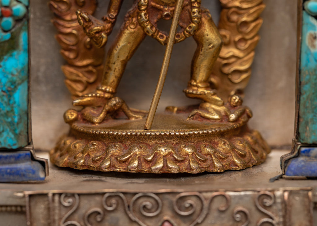 Vajrayogini is a renowned Tibetan Buddhist goddess who embodies transformation and enlightenment through the power of knowledge and compassion. This Ghau Box features turquoise and coral inlays, adding color and vitality to the design. The delicate silver- and gold-plated decorations make this a stunning complement to any Buddhist shrine or altar. Whether as a spiritual gift or for your collection, this precious object represents change and heavenly protection.