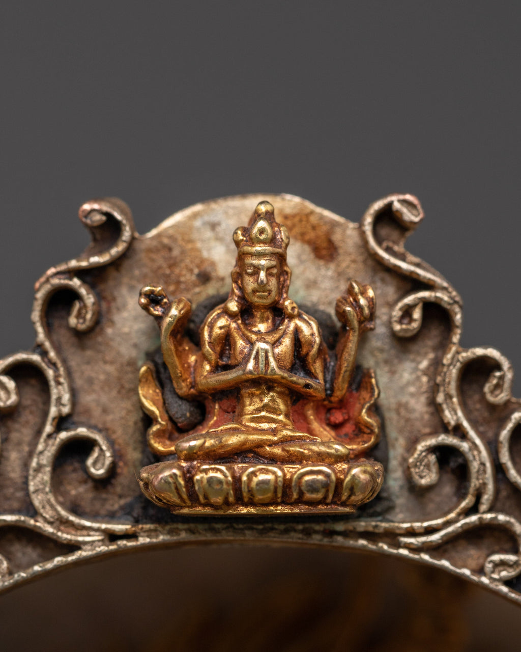 The Ghau Box with Vajrayogini is an exquisitely crafted Tibetan Buddhist item that combines spiritual significance with meticulous craftsmanship. Standing 15.5 cm tall and 11 cm wide, this magnificent box is intended to keep cherished belongings or serve as a sacred container for prayers. The center Vajrayogini Statue, which stands 10 cm tall and 6 cm wide, is composed of copper and exquisitely decorated with gold plating to capture the deity's heavenly spirit.