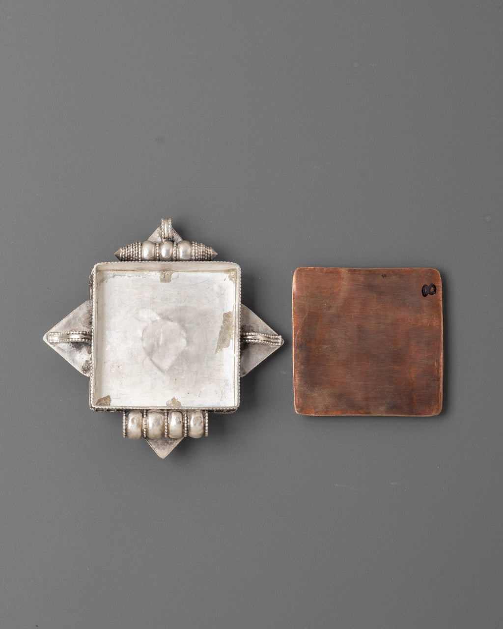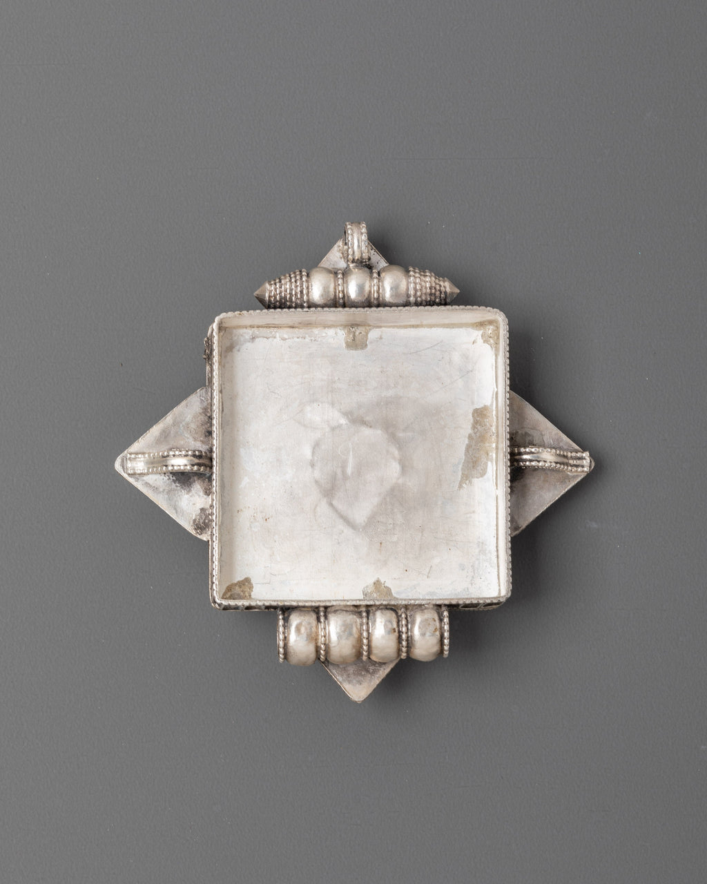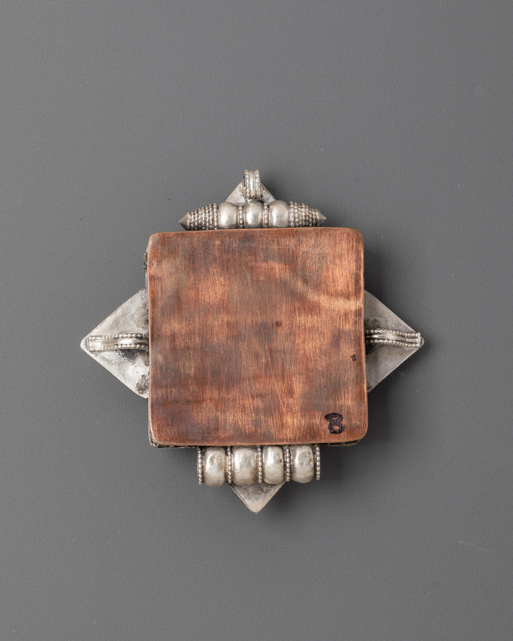 The silver construction offers elegance, while the semi-precious stones enhance its spiritual significance. In Tibetan tradition, Ghau lockets are portable shrines used to carry sacred prayers or protective talismans. This locket combines functionality with divine symbolism, allowing you to keep your spiritual treasures safe while adding a touch of beauty and reverence to your sacred space.