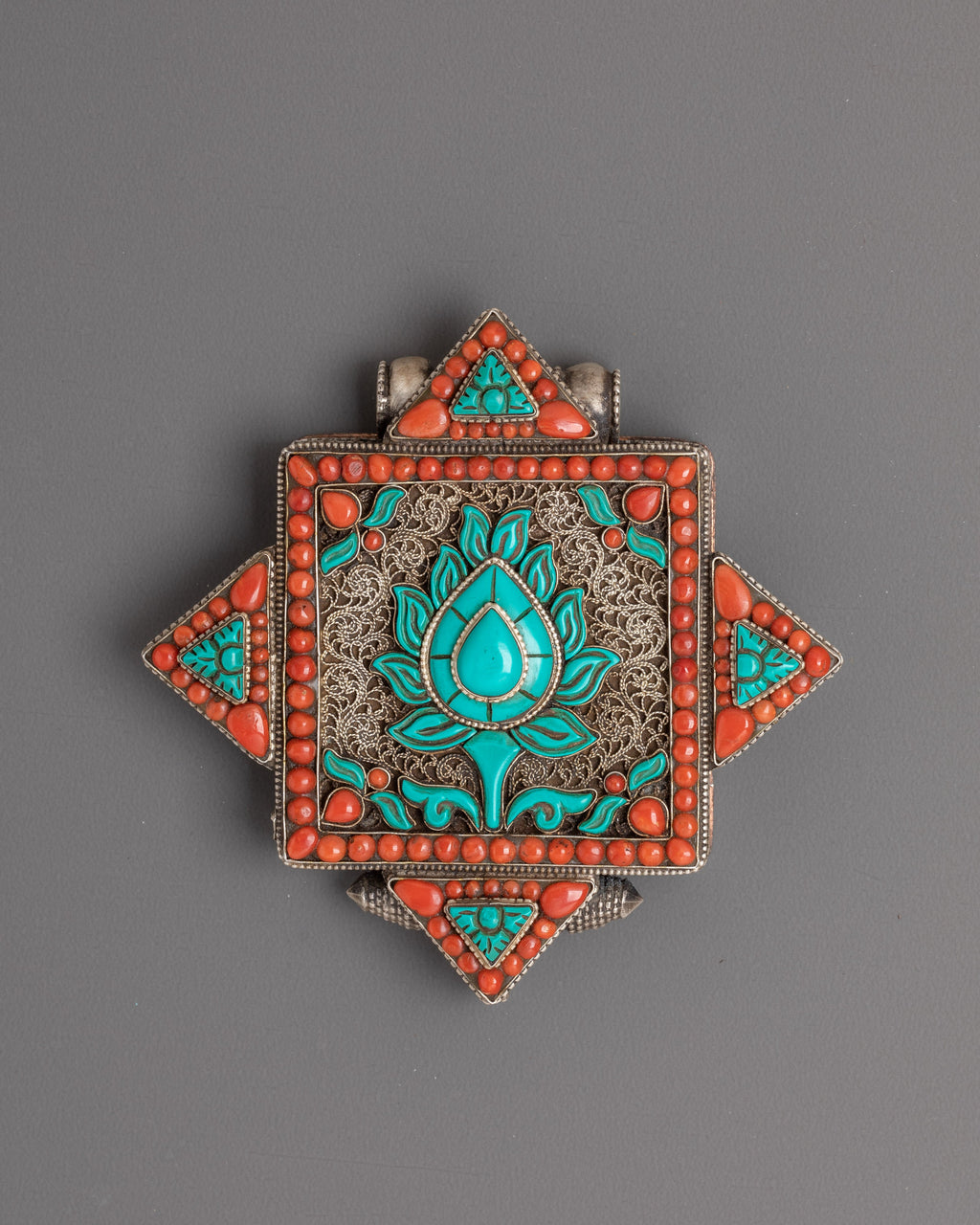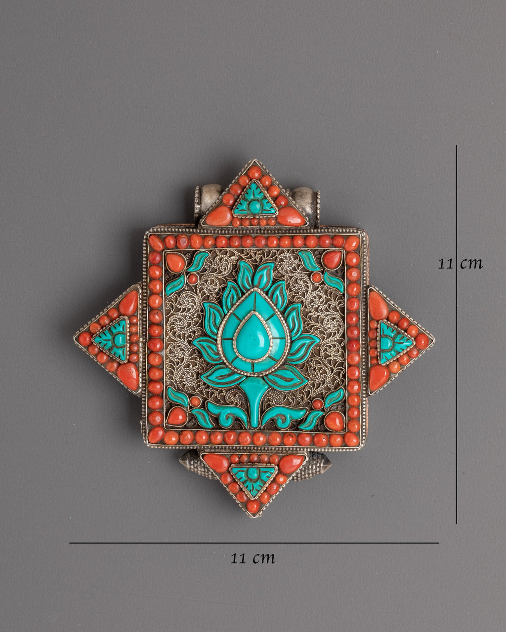 This Ghau Locket with Semi-Precious Stones is a beautifully handcrafted silver locket, embellished with vibrant coral and turquoise stones. Measuring 11cm in height and 11cm in width, it serves as a sacred container for spiritual items, prayers, or small relics, making it ideal for use on altars or during rituals.