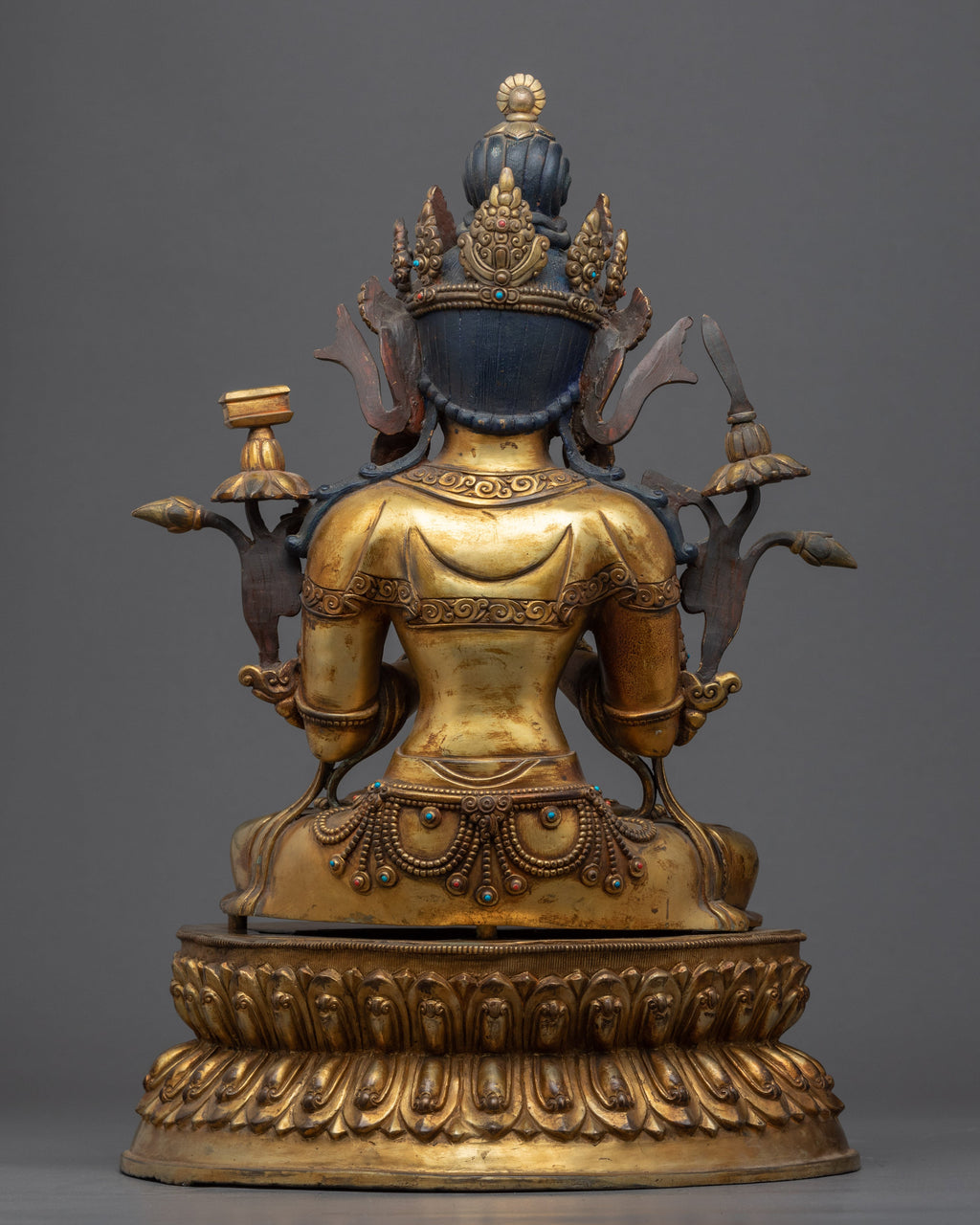 We have exclusively hand-carved the God Of The Wisdom Sculpture using traditional Himalayan art. We are the artisans of the Kathmandu Valley, whose knowledge of creating traditional Vajrayana sculptures has been handed down over the years. The Manjushri is seen two hands are held at the heart performing the Dharma teaching gesture and the left holds a blue utpala with a Prajnaparamita book resting upon it while sitting on a moon-disc lotus seat. Each is set atop a lotus blossom. It took us more than a month to complete the statue's design, construction, and polishing since we hand-carved the pure copper body and gilded it with pure 24-karat gold. We used a hammer and small chisels to hand-carve the intricate design patterns. The crown and the body ornaments are adorned with precious gemstones. We have given the status antique finish.