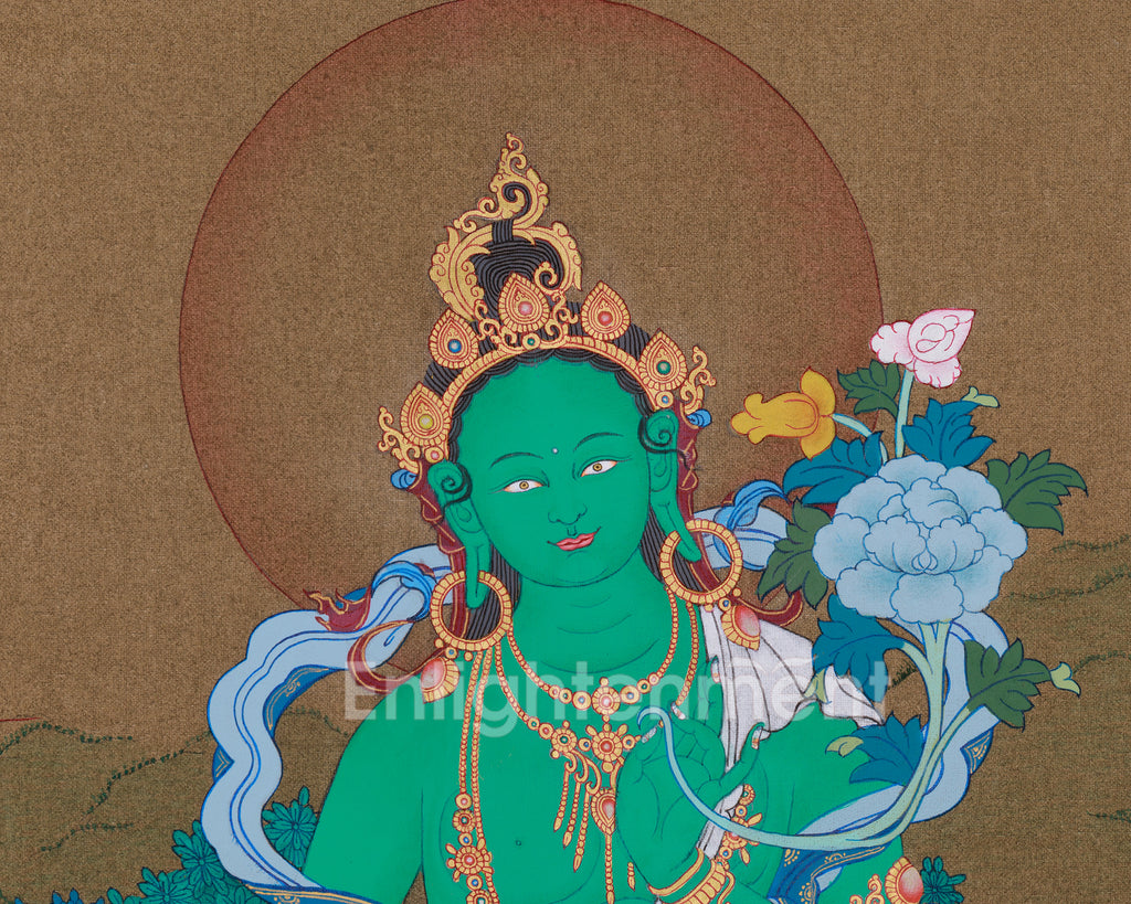 The Goddess Arya Tara Thangka, created in the traditional Karma Gadri style, is meticulously hand-painted on cotton canvas using authentic 24K gold and natural stone colors. The artist's skill and meticulous attention to detail are evident in her vibrant green skin and the elaborate patterns on her clothing. She holds a blue utpala flower between her thumb and ring finger in her left hand, symbolizing purity, wisdom, and spiritual awakening. Her right hand is shown in the granting mudra, offering generosity and protection to her devotees. This thangka symbolizes her role as a swift, compassionate protector, emanating peace and divine compassion.