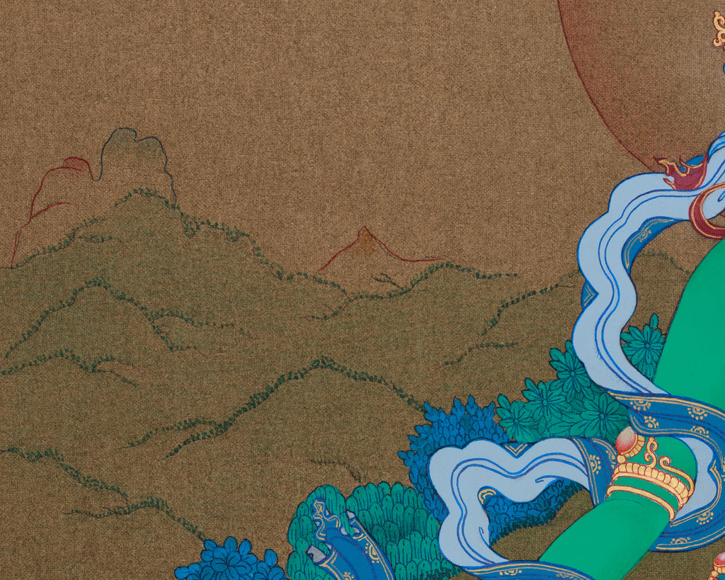 The background depicts a peaceful landscape, representing the calmness Tara embodies. The subtle floral details emphasize her nurturing and healing nature, reinforcing her bond with the natural world and the universe. This Green Tara thangka is a lovely addition to meditation areas, sacred altars, or homes, bringing blessings of compassion, protection, and wisdom.