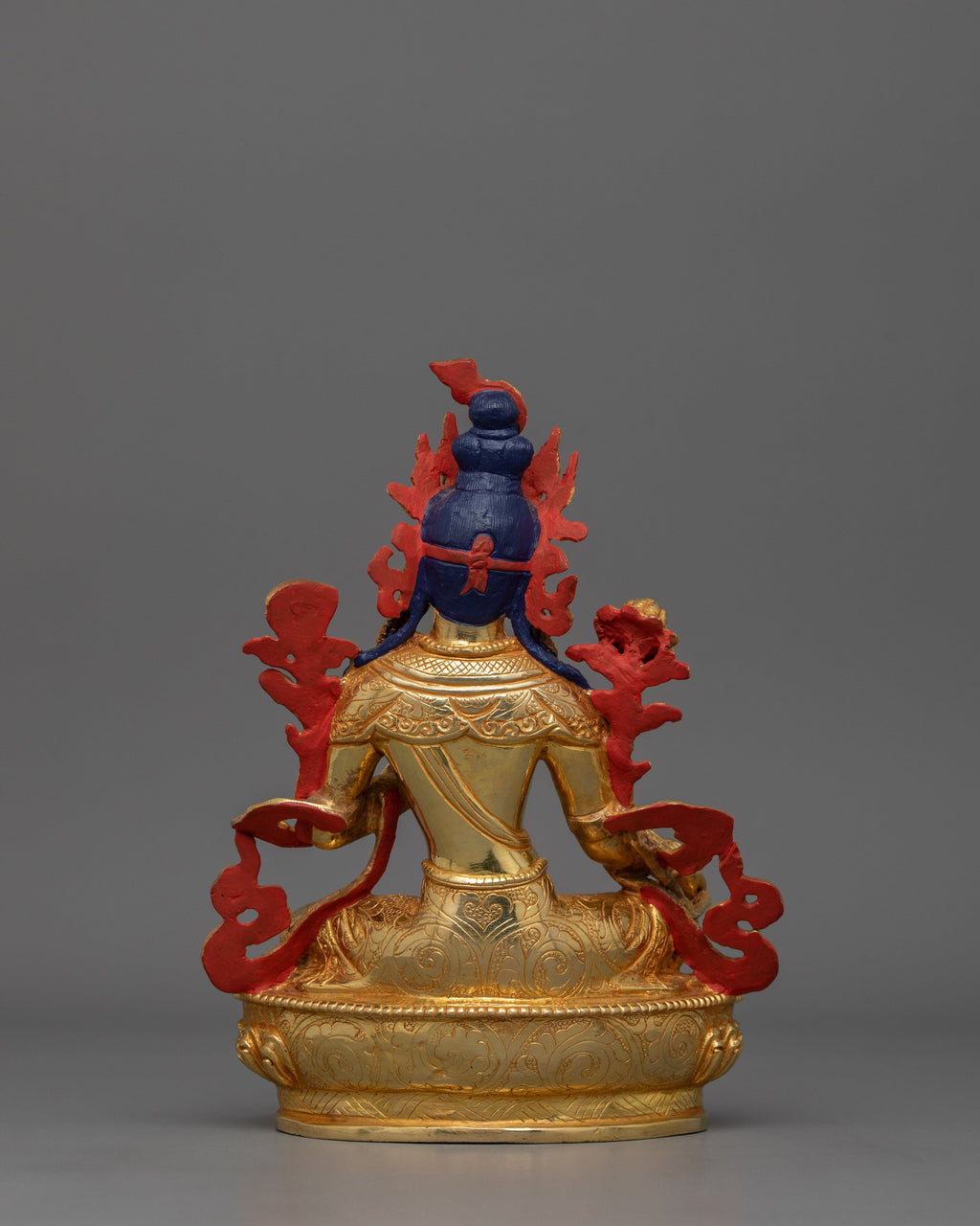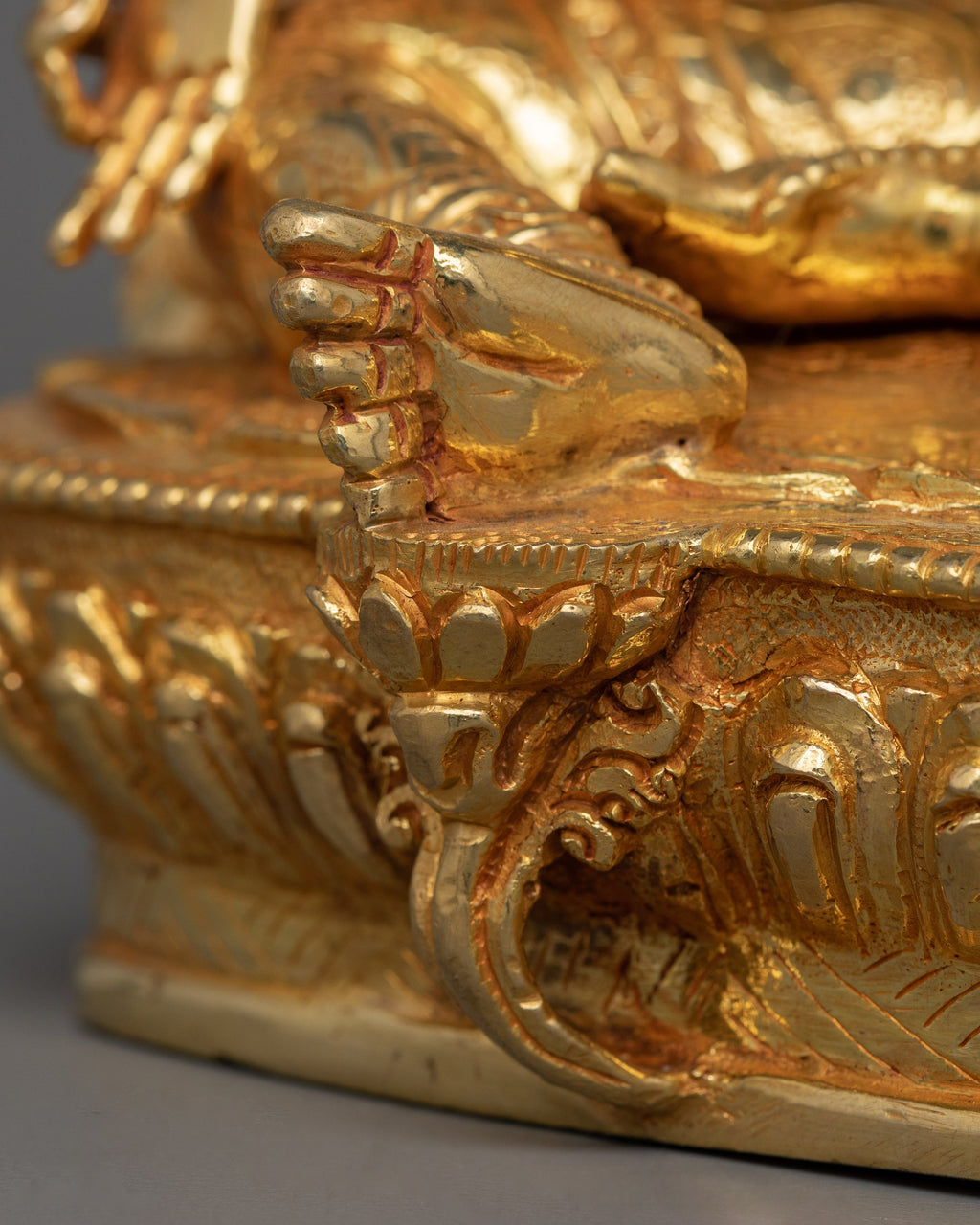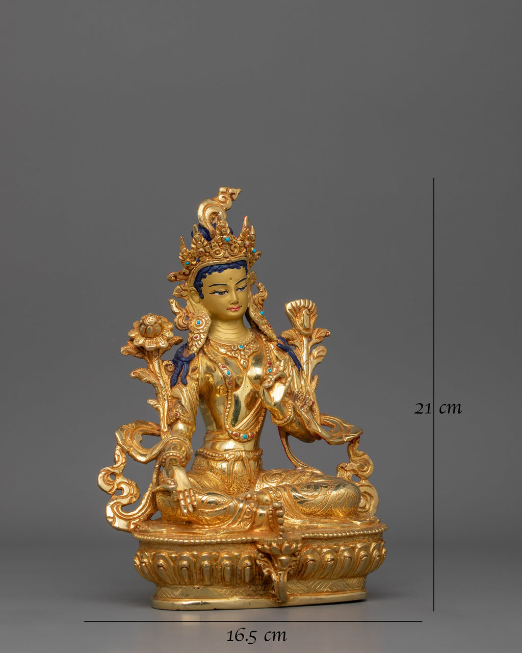 This Goddess of Compassion Green Tara the Female Bodhisattva Statue, measuring 8.3”/21cm (Height) x 6.5”/16.5cm (Base) Weight: 1.31 kg. This statue is made of copper covered with 24K gold gilding. This sculpture, adorned with gemstones, represents the spiritual creativity of Himalayan Buddhism, making it a powerful addition to altars, meditation places, or sacred collections.