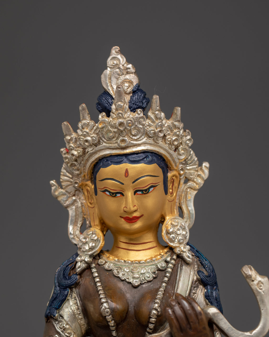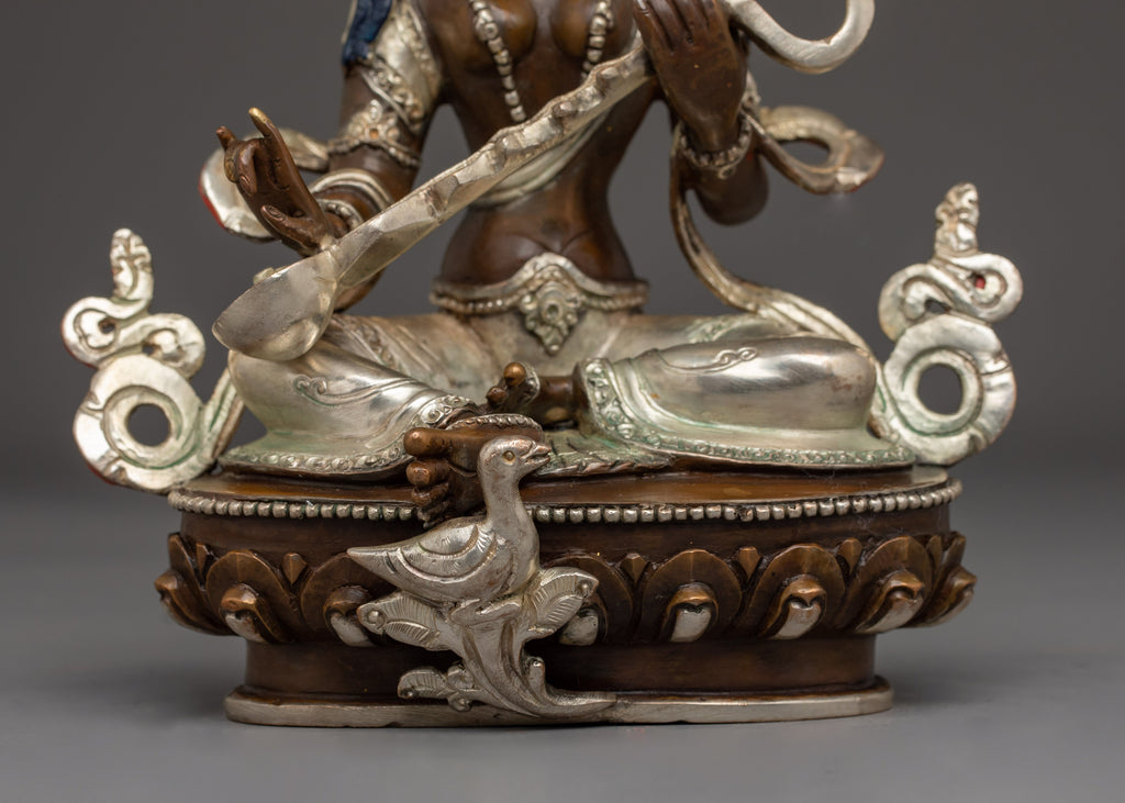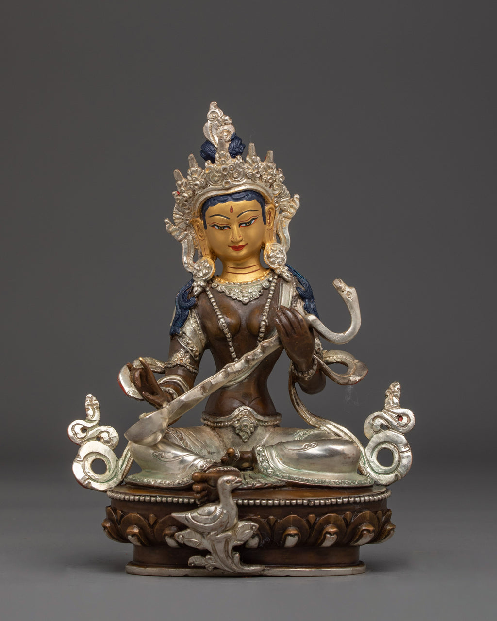 Saraswati is depicted gracefully holding a veena with both hands, symbolizing the harmony of knowledge and the arts. Her right leg is extended toward a lotus, representing purity and spiritual awakening. She wears a five-jewel crown and a swirling scarf, both signifying divine elegance, and is adorned with delicate ornaments that enhance her serene presence. Her primary vehicle, the swan, rests peacefully upon the moon disc lotus base, embodying wisdom and discernment. Saraswati’s face radiates calmness, reflecting the tranquil essence of actual knowledge.