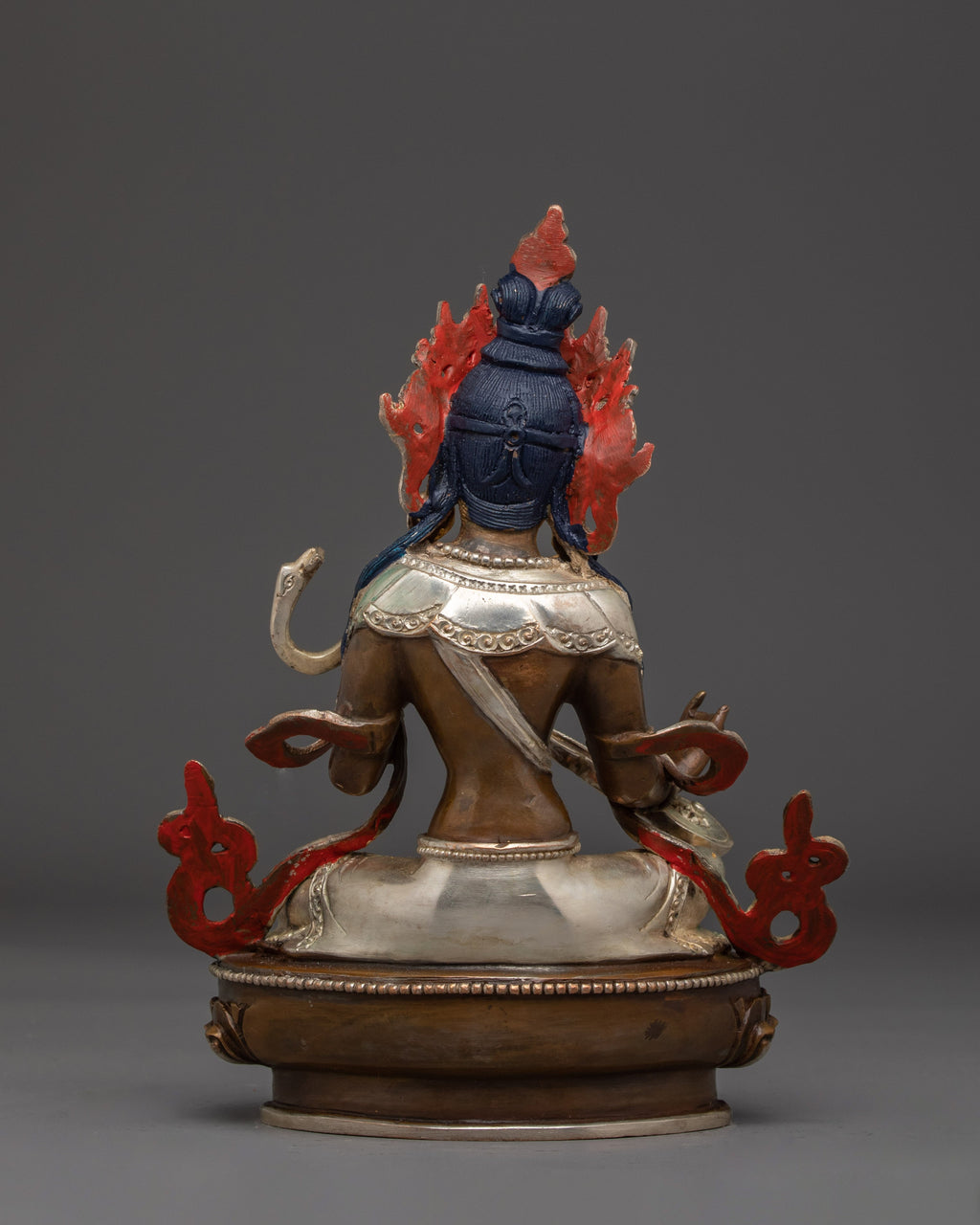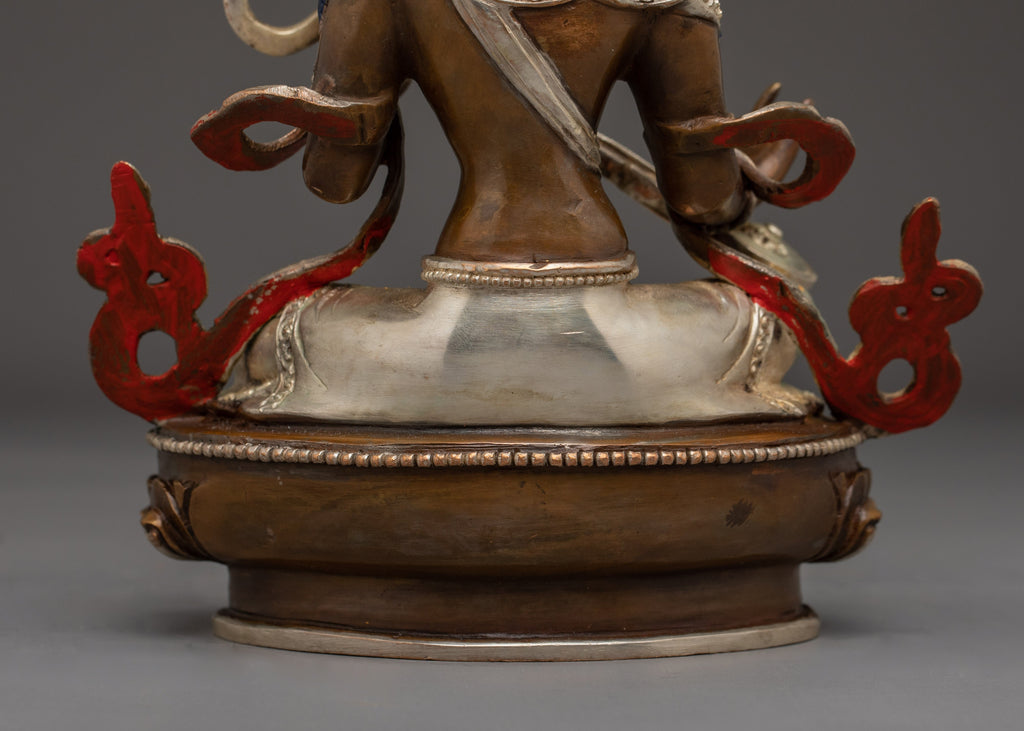 Goddess of Knowledge, Saraswati Statue stands 9.1” (23 cm) tall with a 6.7” (17 cm) base and weighs 1.77 kg. Skillfully handcrafted from oxidized copper with a silver-plated finish, it is beautifully enhanced with gold and acrylic paintings that highlight the goddess's serene and divine presence. Saraswati, the Hindu goddess of wisdom, learning, music, and the arts, is revered for granting clarity of mind, eloquence, and creative inspiration. Ideal for study areas, altars, or sacred spaces, this statue invokes blessings of knowledge, artistic expression, and spiritual refinement.