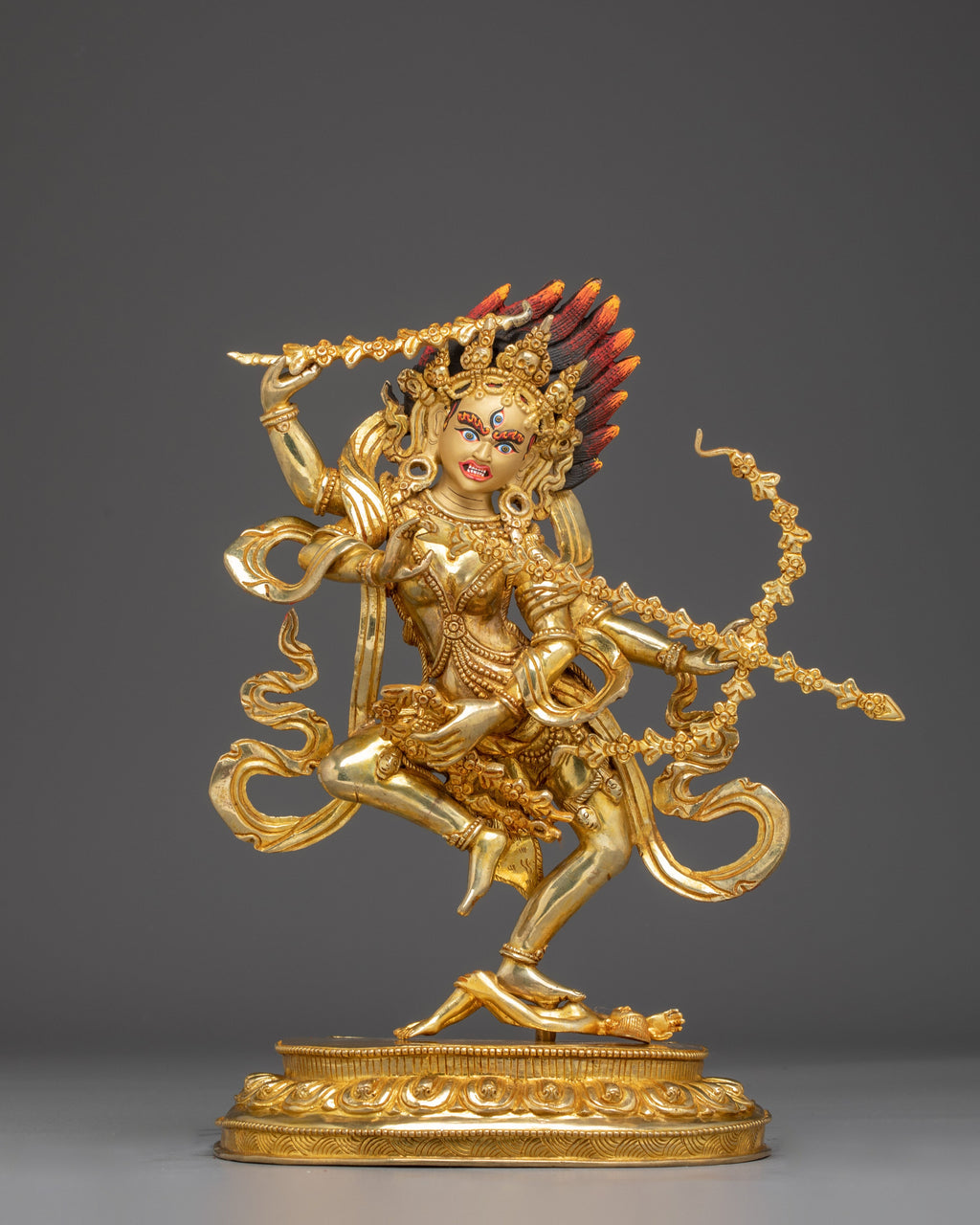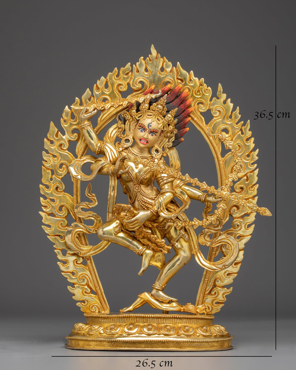 This Kurukulla Statue, the Goddess of Magnetism, is a magnificent and powerful depiction of the enlightened Vajrayana tantric deity, renowned for attraction, empowerment, and spiritual magnetism. Standing 36.5cm tall and 26.5cm wide, and weighing 3.70kg, this impressive, large statue is crafted from copper and richly plated with gold, making it a stunning focal point for any Buddhist altar, shrine, or sacred space. Kurukulla is deeply revered for her unique ability to draw positive energies, wisdom, and compassion into the lives of practitioners, helping to transform obstacles into opportunities for spiritual growth. Beyond its striking beauty, this statue serves as a meaningful symbol of empowerment and spiritual magnetism, enriching your practice and sacred environment with profound energy and devotion. Its authentic craftsmanship and sacred symbolism make it an inspiring addition for anyone wishing to invite the blessings of Kurukulla into their home or meditation area.