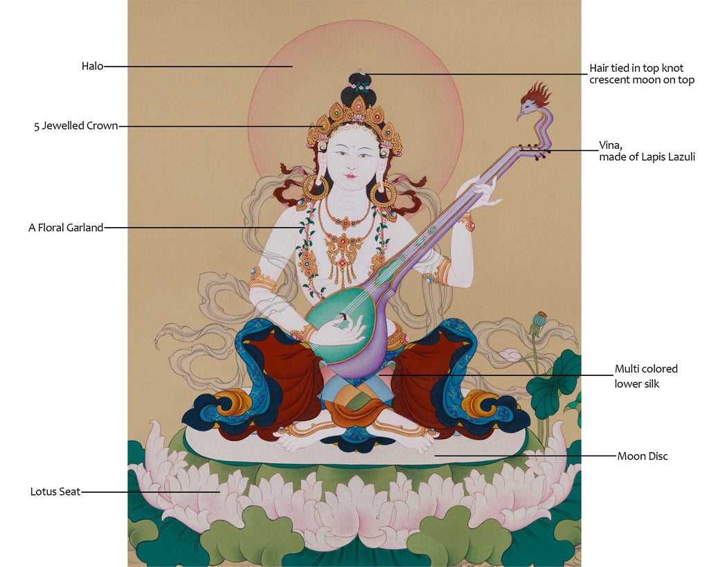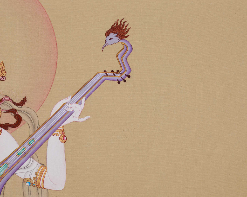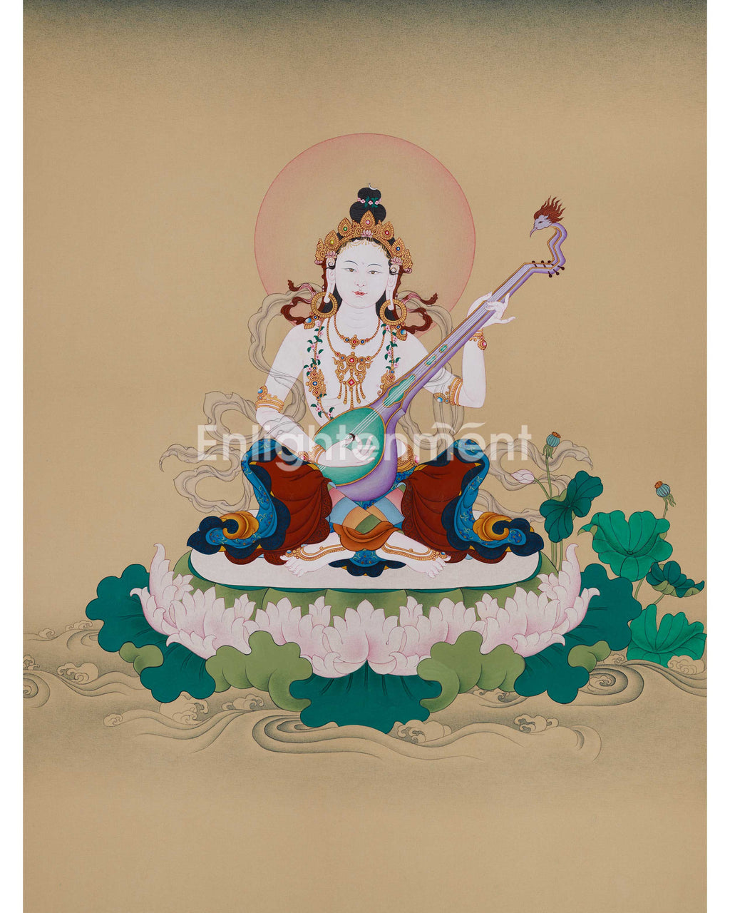 Divine Goddess of Music, Saraswati | Thangka of Tibetan Buddhist and Hindu Deity | Enhanced with Lhasa Stone and 24K Gold