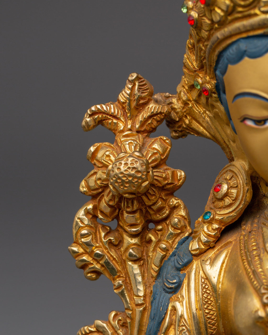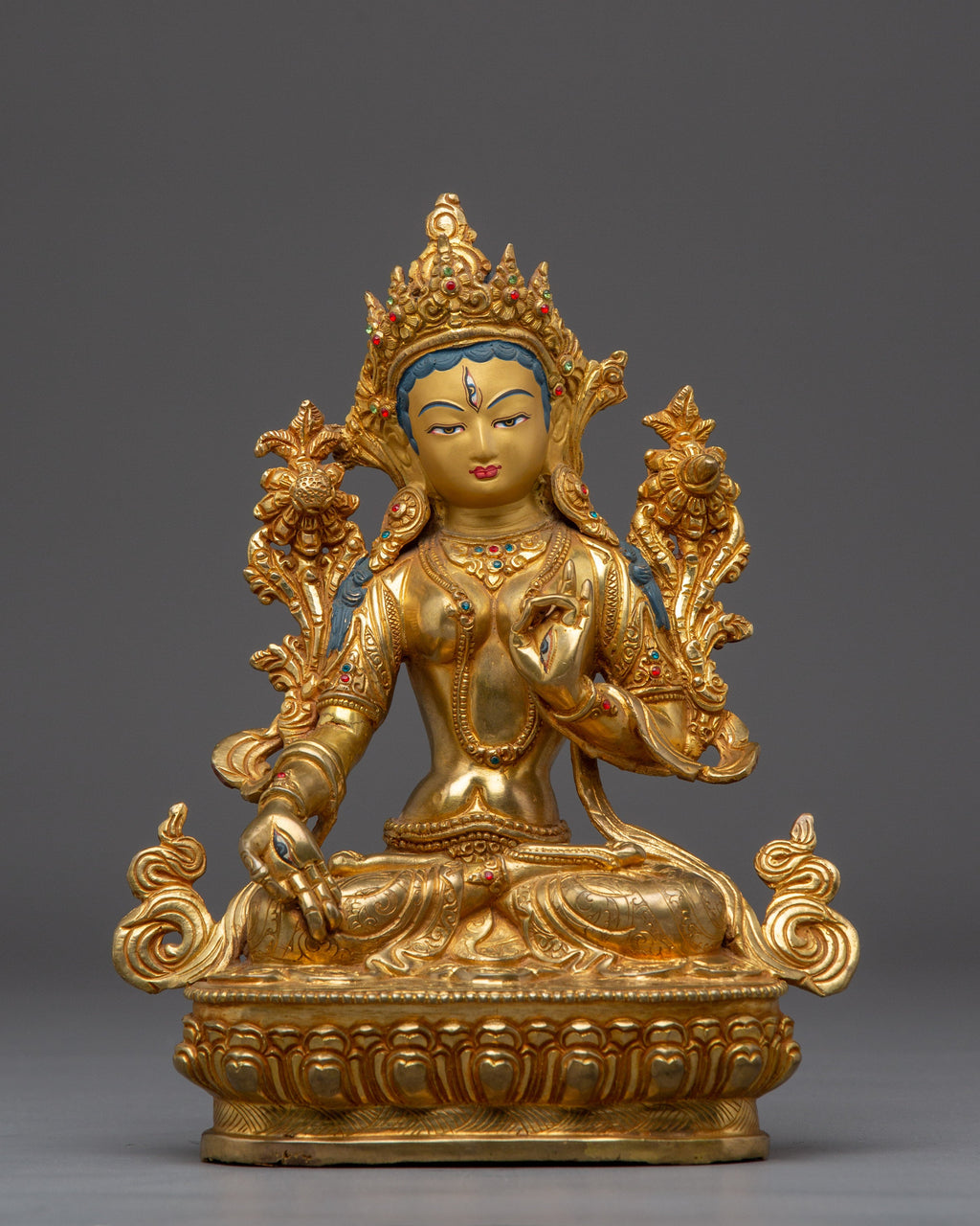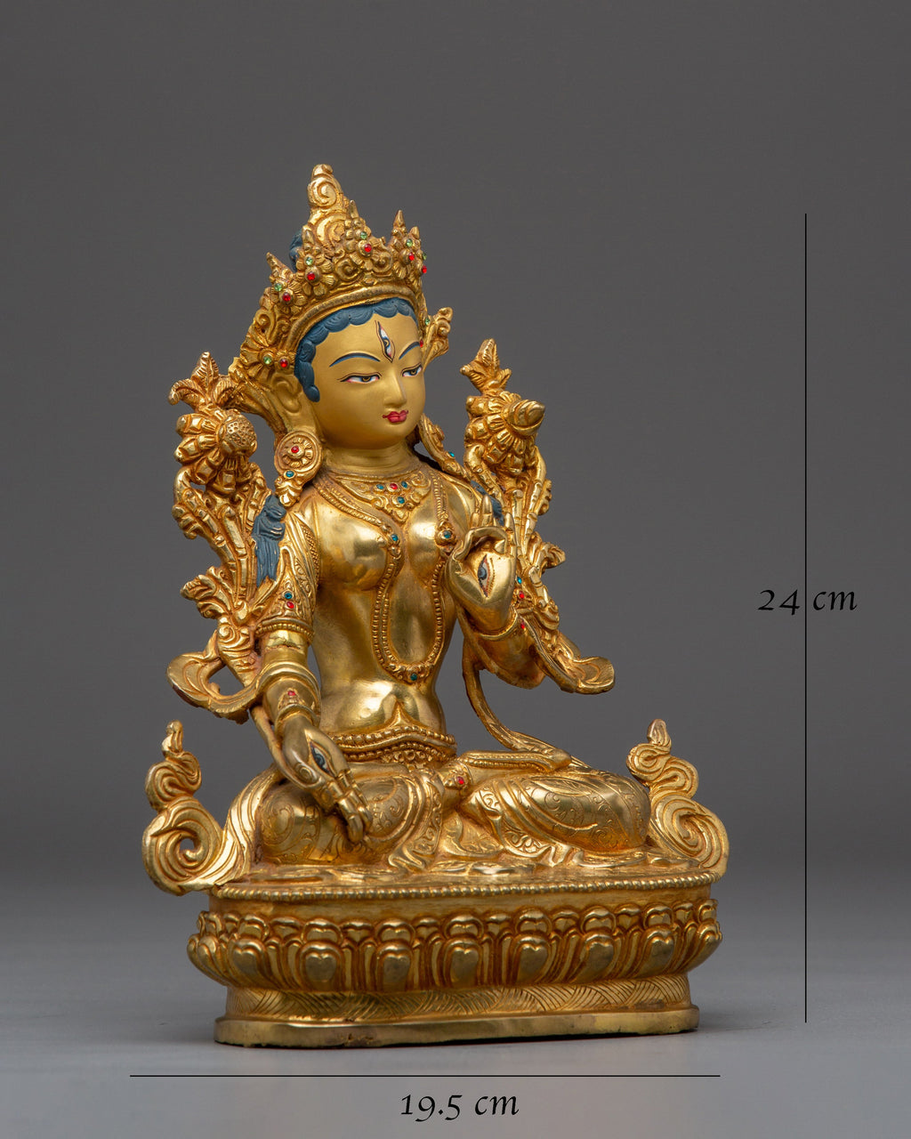 The Goddess of Protection, White Tara Artwork, a symbol of compassion, healing, and longevity, radiates divine grace and spiritual blessings. This wonderfully handcrafted statue, which measures 9.4" (Height) x 7.7" (Base) and weighs 2.04 kg, is made of copper, 24K gold gilding, gold and acrylic paints. This figure, crafted by talented Nepalese artisans, symbolizes the spiritual traditions of Himalayan Buddhism, making it an important addition to altars, meditation places, or sacred collections.