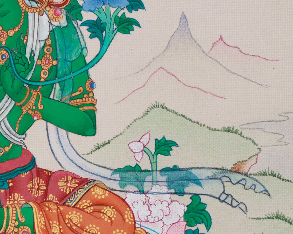 This thangka depicts Shyama Tara, known as the Green Tara, in her serene and majestic form, seated on a blossoming lotus throne. She is shown with her right hand in a gesture of offering and her left hand holding a lotus flower, symbolizing purity and spiritual wisdom. The delicate natural stone colors enhance her radiant green body, while her jewelry and adornments shimmer with golden accents. The soft, flowing clouds and serene mountains in the background represent her nurturing and protective qualities, inviting peace and healing to all who view her. With her calm yet powerful presence, Shyama Tara offers both guidance and refuge, transforming the space into a sanctuary of compassion.