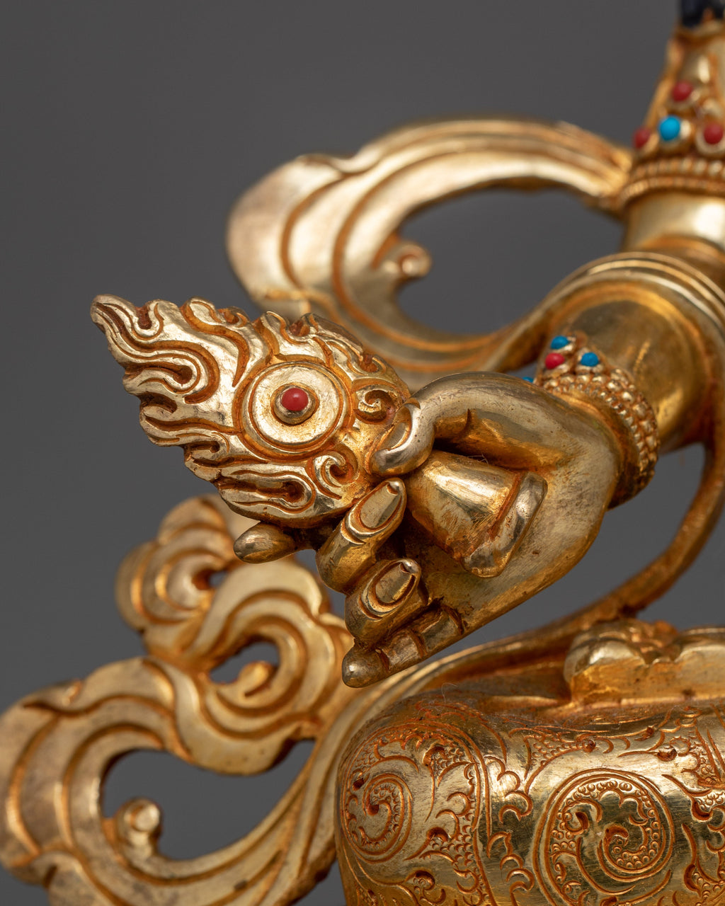 In this beautifully detailed statue, Dukar is portrayed as a serene figure seated on a lotus seat, representing purity and spiritual awakening. She holds a parasol above her, representing protection and shelter for her devotees, and her other hand usually holds a ritual item, symbolizing her role in spiritual practices. Her gentle expression and the fine details of her attire convey a sense of peace and assurance, embodying her nurturing qualities and encouraging a closer relationship with the divine.