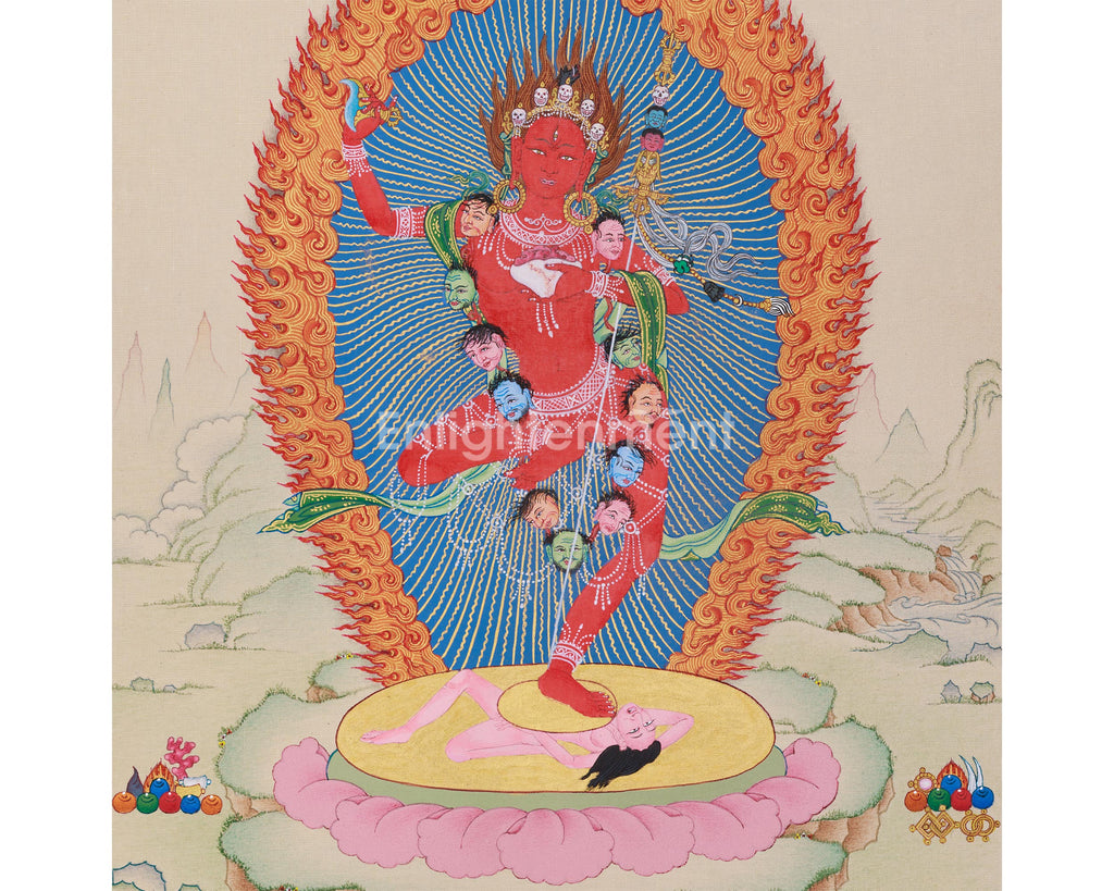Vajravarahi, also known as Dorje Phagmo, is a revered Tibetan tantric goddess who embodies wisdom, feminine power, and transformation. She appears dancing, with one leg bent and the other stretched, symbolizing liberation from duality. Her red body radiates energy and inner heat, reflecting an enlightened wrath that dispels delusion. In this thangka, she wields a curved knife with a vajra handle, the cutting of ego and illusion, and holds a skull cup filled with the nectar of enlightenment. A khatvanga staff represents unity with her consort, signifying method and wisdom. She wears a garland of severed heads, symbolizing the eradication of mental afflictions, and a crown with a boar's head, representing her power over ignorance. This thangka serves as a sacred tool for practitioners, embodying the transformative energy of the feminine, ideal for energizing meditation spaces or as sacred art, reminding us to cut through illusion and realize the mind's true nature.