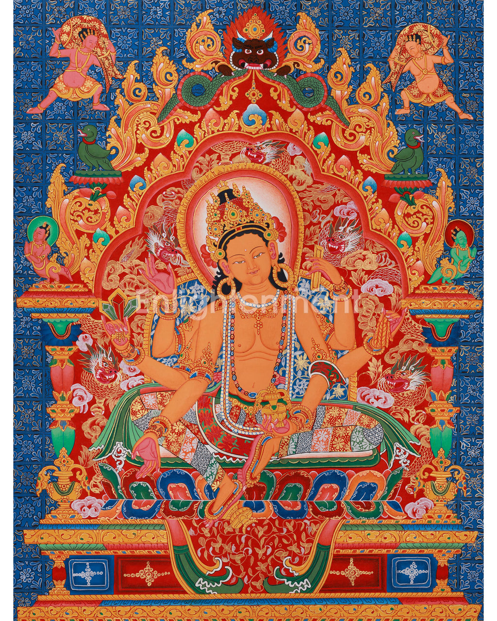 The depiction of birds and other celestial beings, along with divine attendants and supportive figures, surrounds her, illustrating the goddess's adoration and love. Smaller representations of deities and celestial creatures in the upper corners highlight her divine essence and her role as a guardian of wealth and prosperity. As an effective meditation method, this Thangka encourages practitioners to cultivate compassion, knowledge, and dedication on their spiritual journey while attracting wealth and health into their lives.