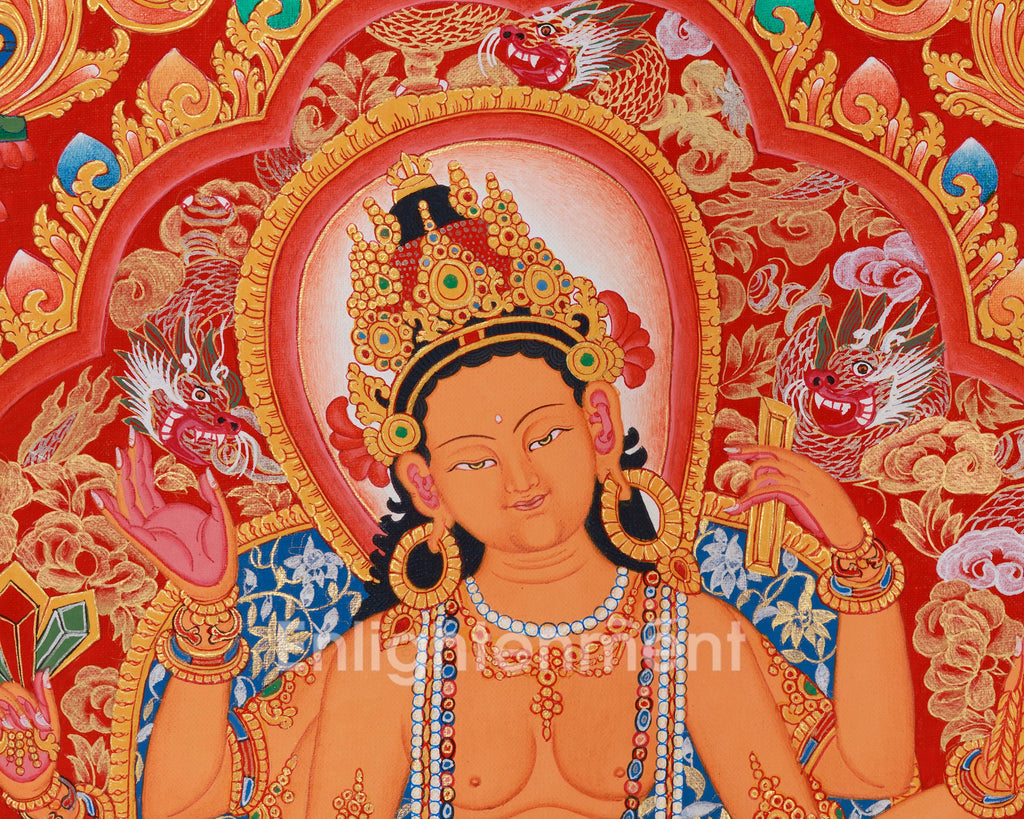 This captivating artwork of Goddess Vasudhara embodies the essence of the revered Tibetan Buddhist goddess associated with wealth, fertility, and well-being. Traditionally portrayed with a golden face, adorned in a crown and royal jewels, Vasudhara symbolizes her divine role as both a provider of material wealth and a guide to enlightenment. Crafted on premium cotton canvas, this piece ensures both durability and longevity. The vibrant acrylic colors enhance its visual appeal, while genuine 24K gold embellishments lend it a sacred quality, making it perfect for spiritual practice and meditation.