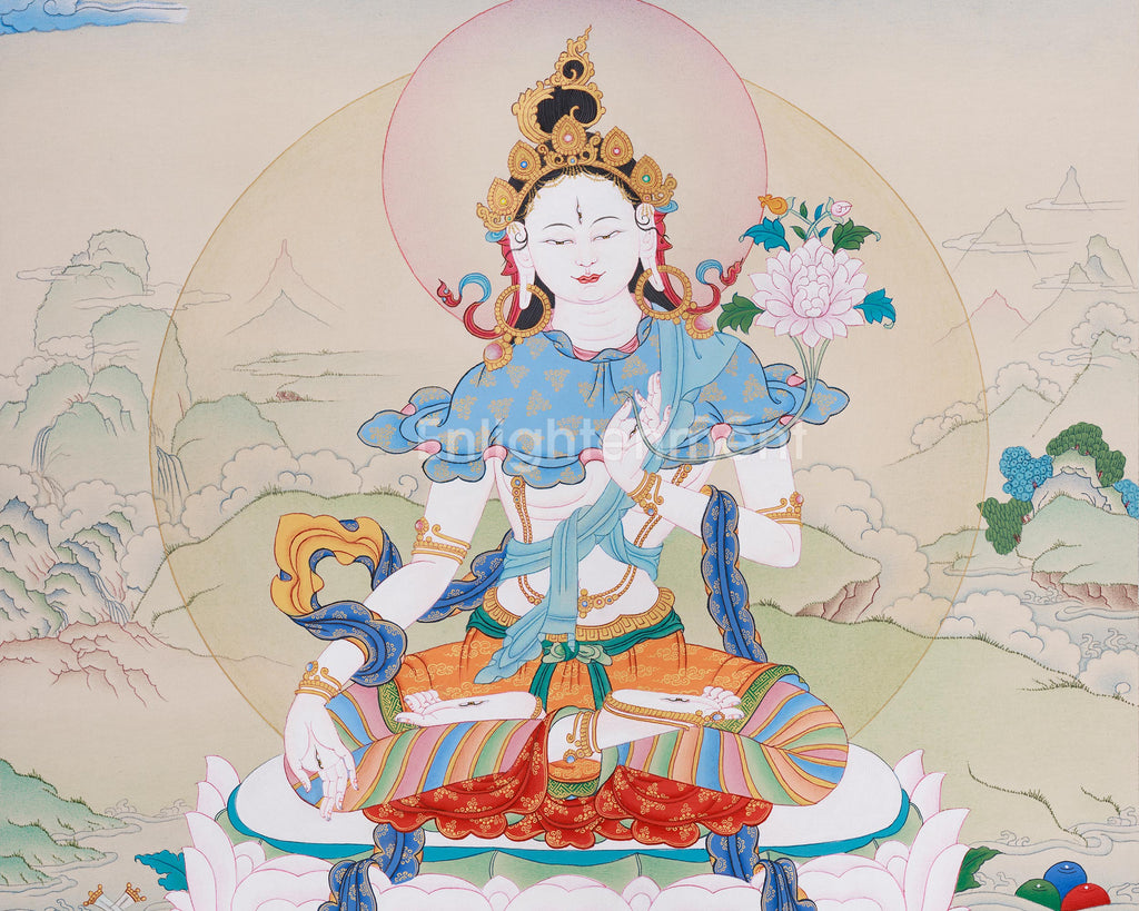 The Goddess White Dolma Thangka is a beautiful hand-painted artwork of White Tara, the Buddhist goddess of long life and compassion. Created on premium cotton canvas in natural stone colors and enhanced with genuine 24K gold, this thangka captures her serene, divine presence. The traditional Karma Gadri style brings out the intricate details of this thangka, while the gold accents radiate her healing and protective energy. Each brushstroke has been carefully applied to embody the purity, grace, and compassion of White Tara, making this thangka a powerful tool for invoking her blessings.