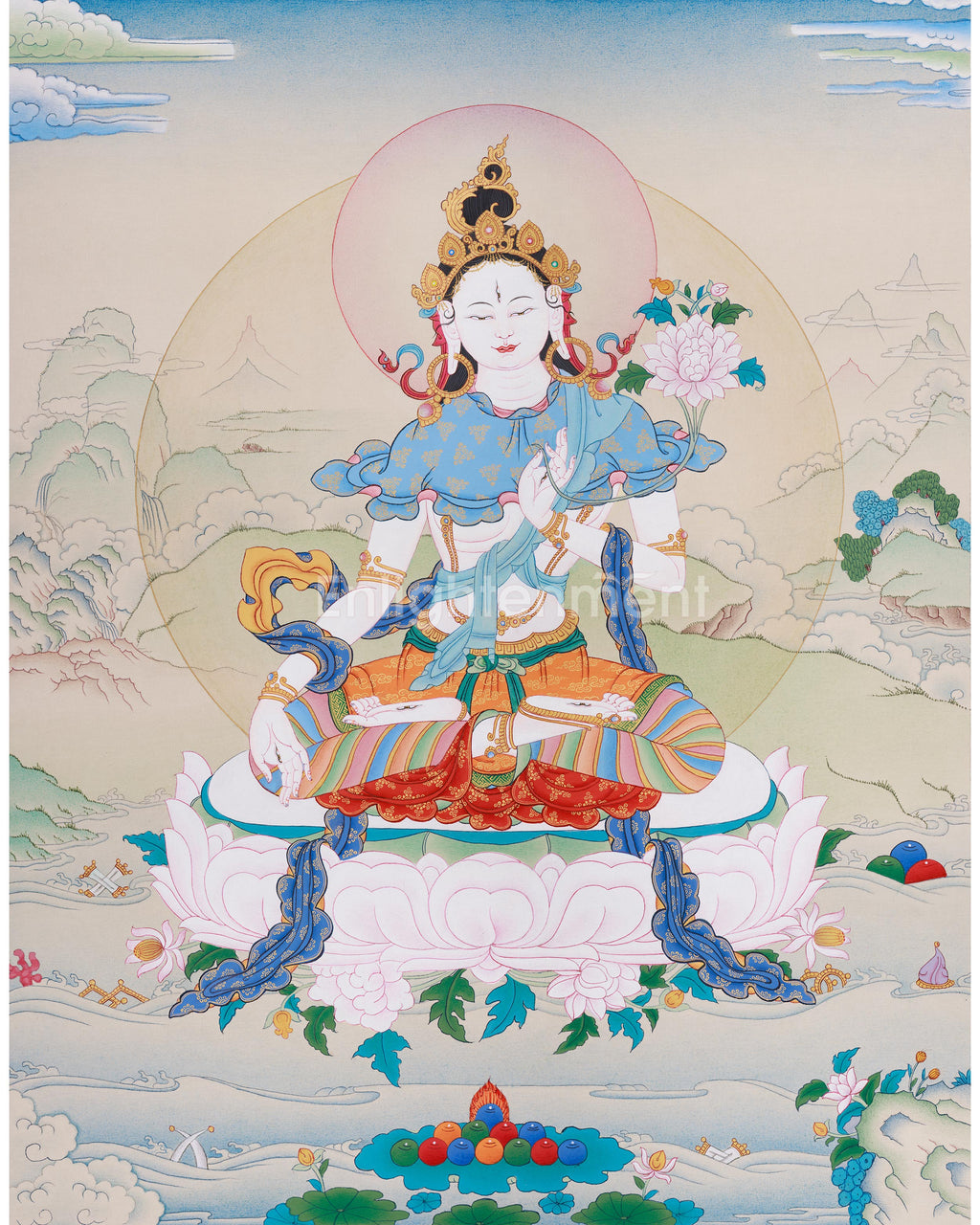White Tara, known as the Goddess of Longevity, is a highly revered figure in Tibetan Buddhism. She is depicted with seven eyes, symbolizing her all-encompassing compassion and healing power. White Tara is believed to shield against illness and obstacles, offering blessings of long life, health, and spiritual growth. In this thangka, she appears seated on a lotus throne, with a calm expression and a graceful posture that reflect purity and compassion. The lotus signifies enlightenment, while the vibrant colors and offerings at the base represent the riches she provides to her followers. This thangka is not only a beautiful artwork but also a powerful spiritual tool for invoking healing, longevity, and protection. Invite her divine presence into your space and welcome her compassionate energy into your life.