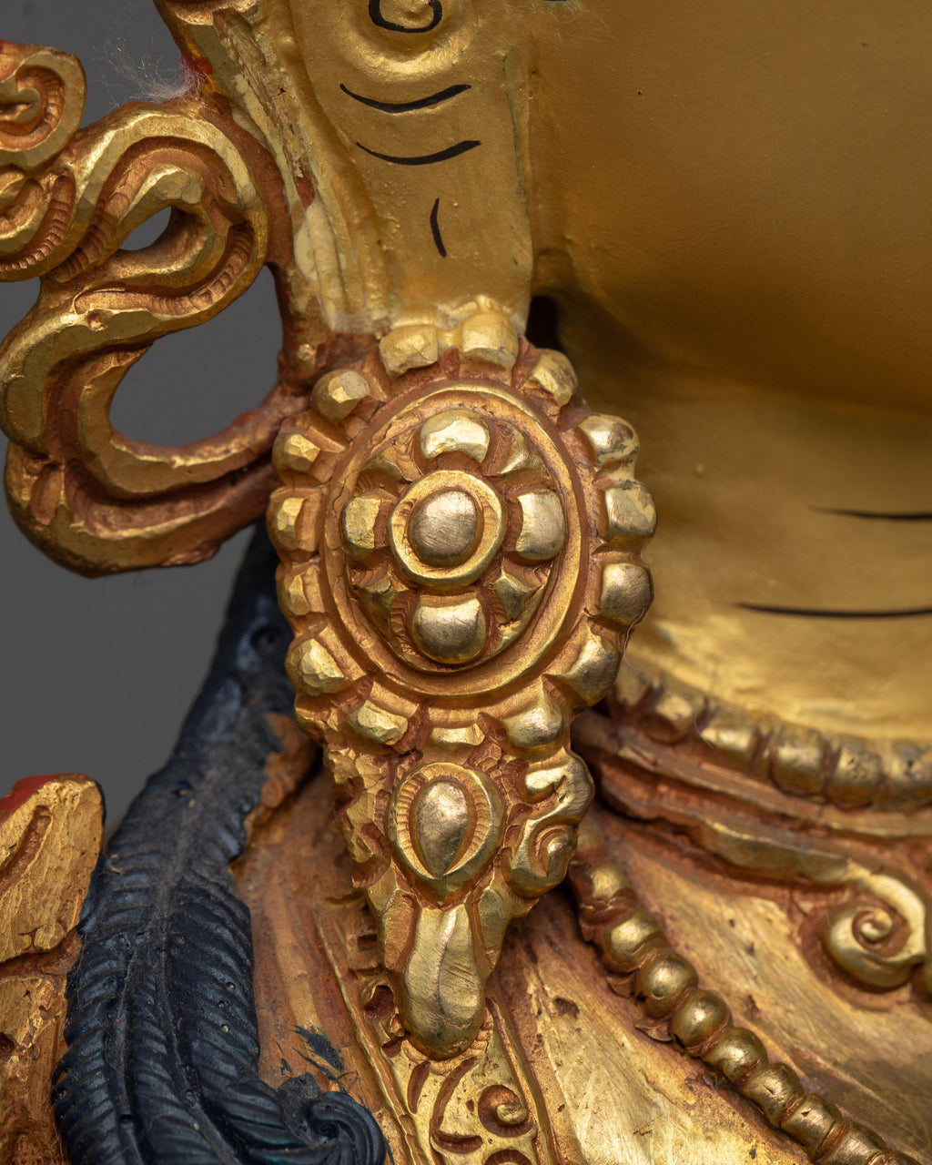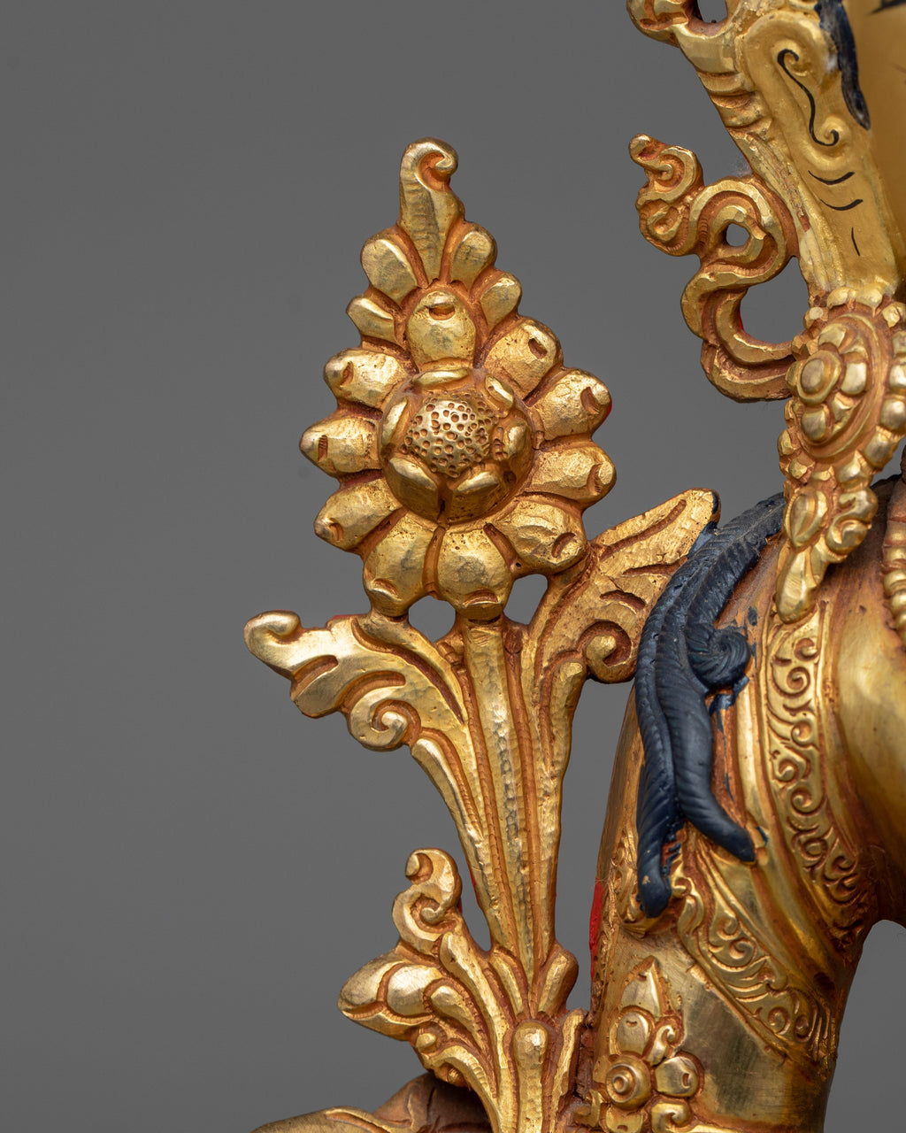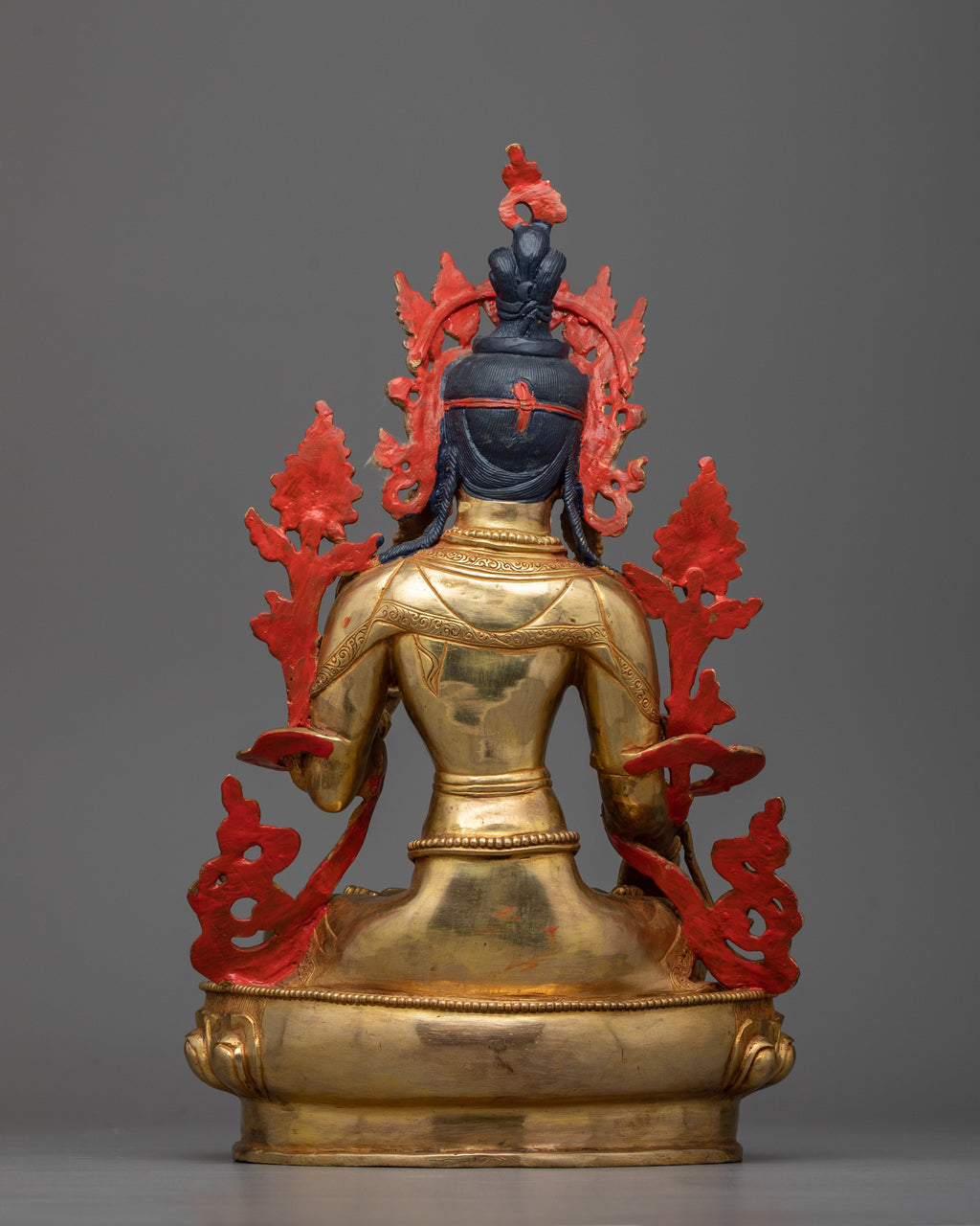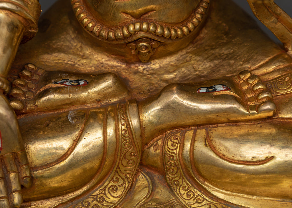 The statue, adorned with a 24k gold gilded finish, exudes a celestial aura, capturing the spirit of White Tara's pristine brilliance. The copper body, in combination with the precise acrylic paints, demonstrates an unrivaled level of artistry. This statue, resonating with profound peace, is a great focal point for meditation zones, spiritual nooks, or as a statement piece for any decor.