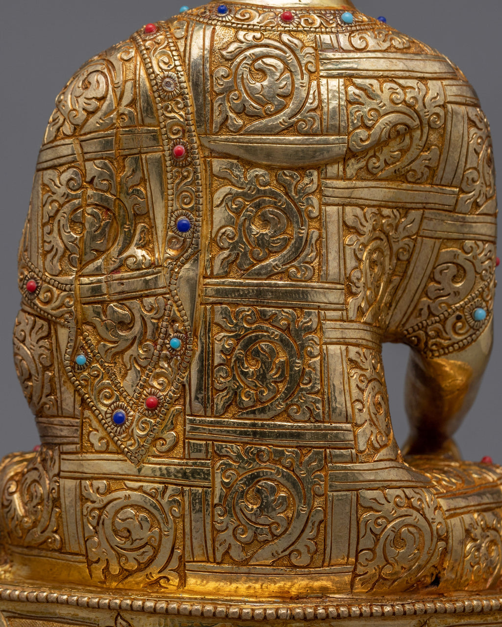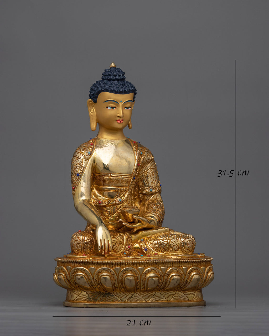 Introducing our stunning Gold-Gilded Shakyamuni Buddha Sculpture, handcrafted in the renowned workshops of Patan, Nepal. This statue stands 31.5cm (12.4 inches) tall and has a hefty 21cm (8.3 inch) base. It embodies the tranquility and wisdom of Shakyamuni Buddha, the historical founder of Buddhism, as seen in a moment of meditative grace.