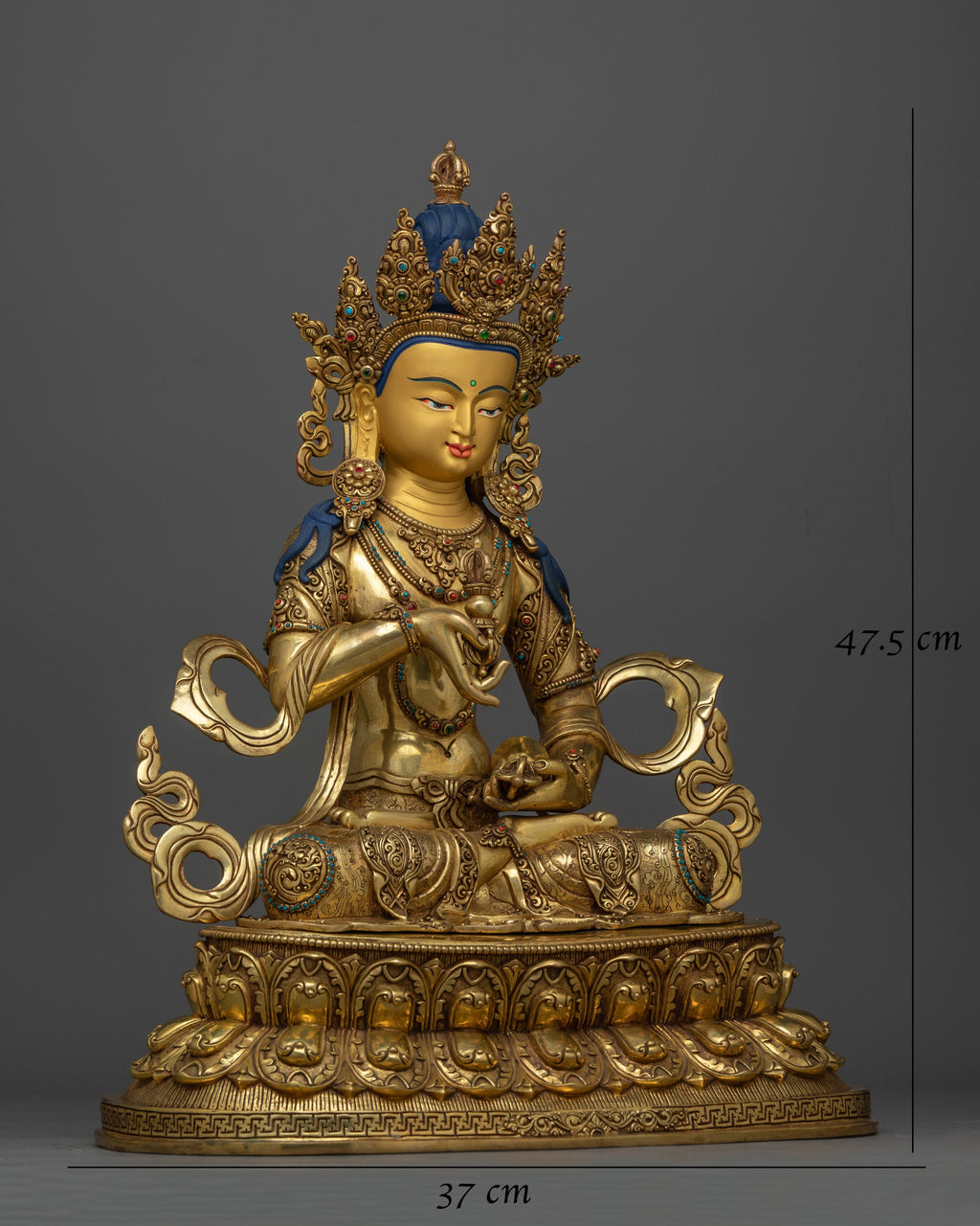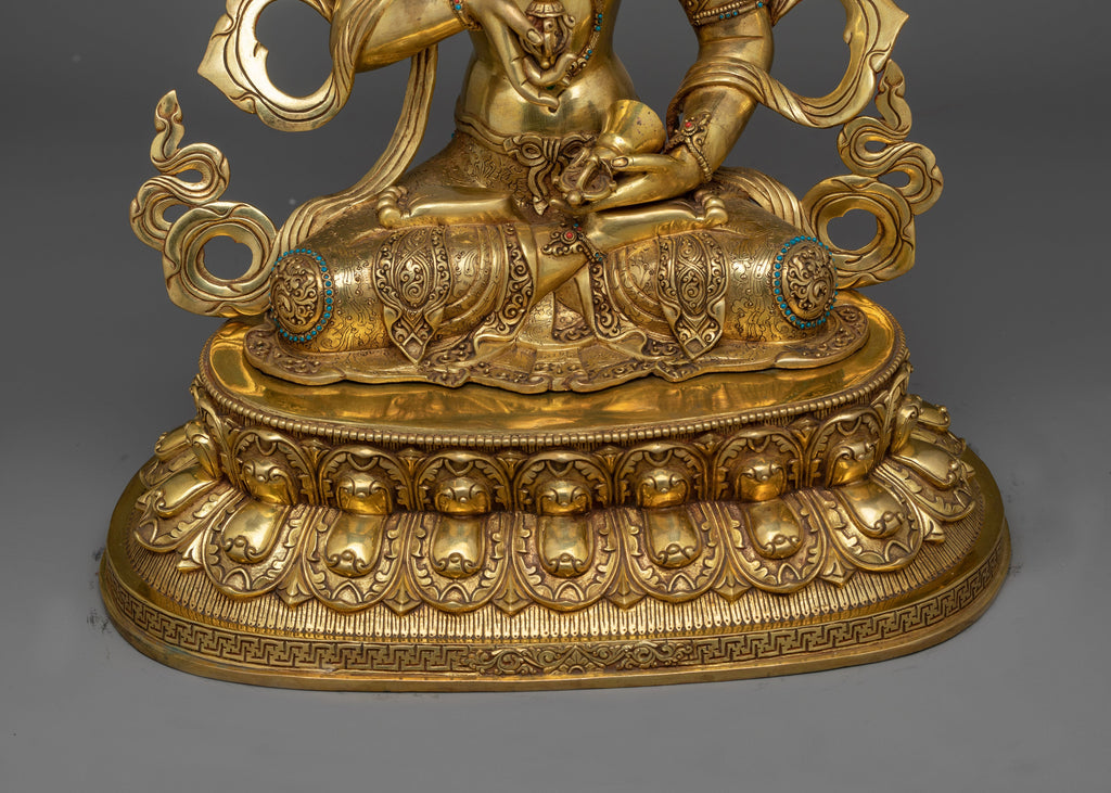 Presenting our Gold-Gilded Vajrasattva Purify Deity Statue, an amazing work of art created with great care and accuracy by well-known Patan, Nepali artisans. Raising to a height of 47.5cm (18.7 inches) and resting on a 37cm (14.6 inch) base, this statue is a potent depiction of the Buddhist deity Vajrasattva, who is linked to purification and the removal of karmic barriers.