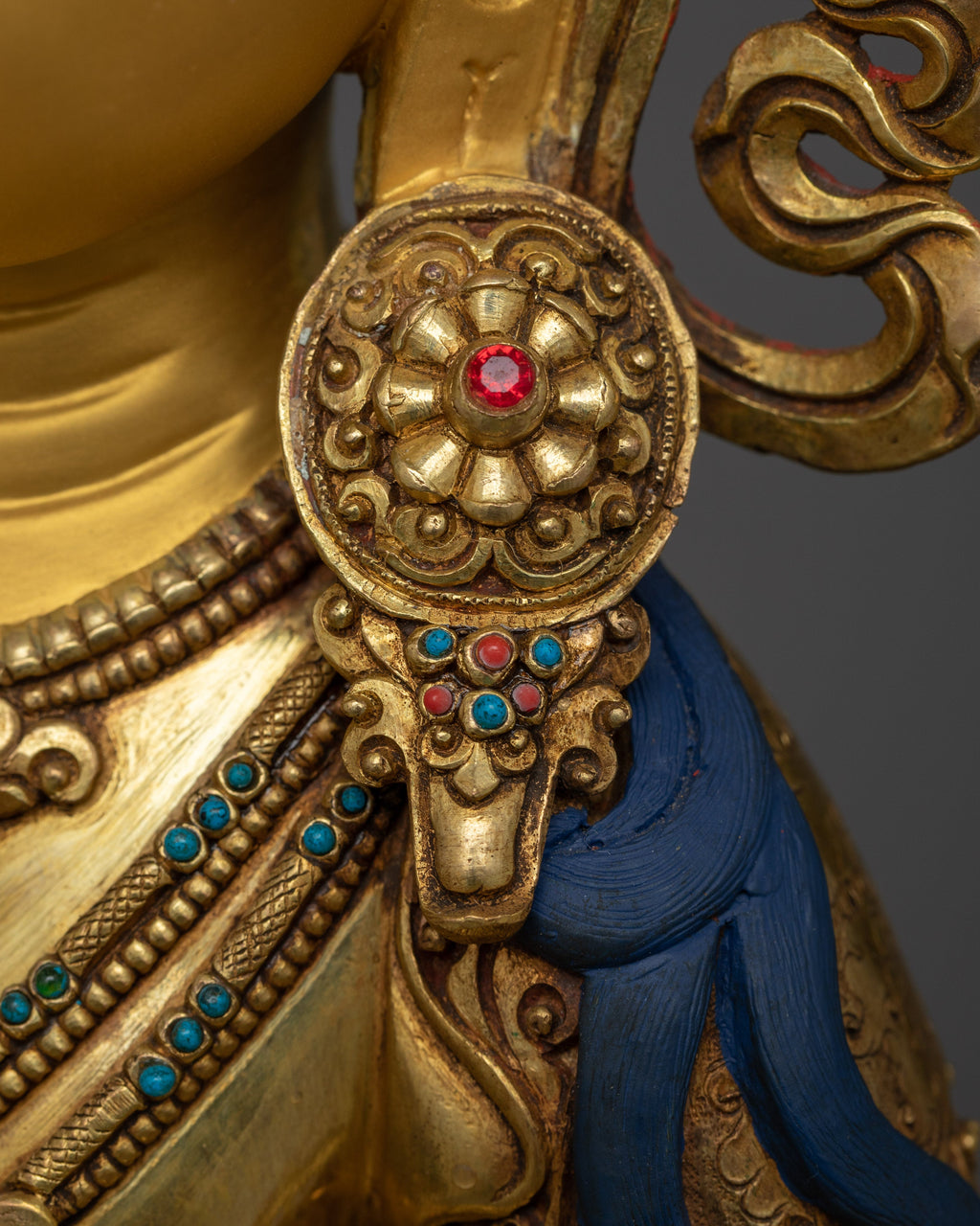 Vajrasattva's elaborate attire and tranquil countenance are accentuated by the superb 24K gold gilding on this handcrafted statue of a copper body. The figure's spiritual impression is enhanced by the richness and vibrancy added by the acrylic and gold paintwork. Its 8.97 kg weight gives it a commanding presence, making it perfect for using as the focal point of any room used for spiritual practice, meditation, or introspection.